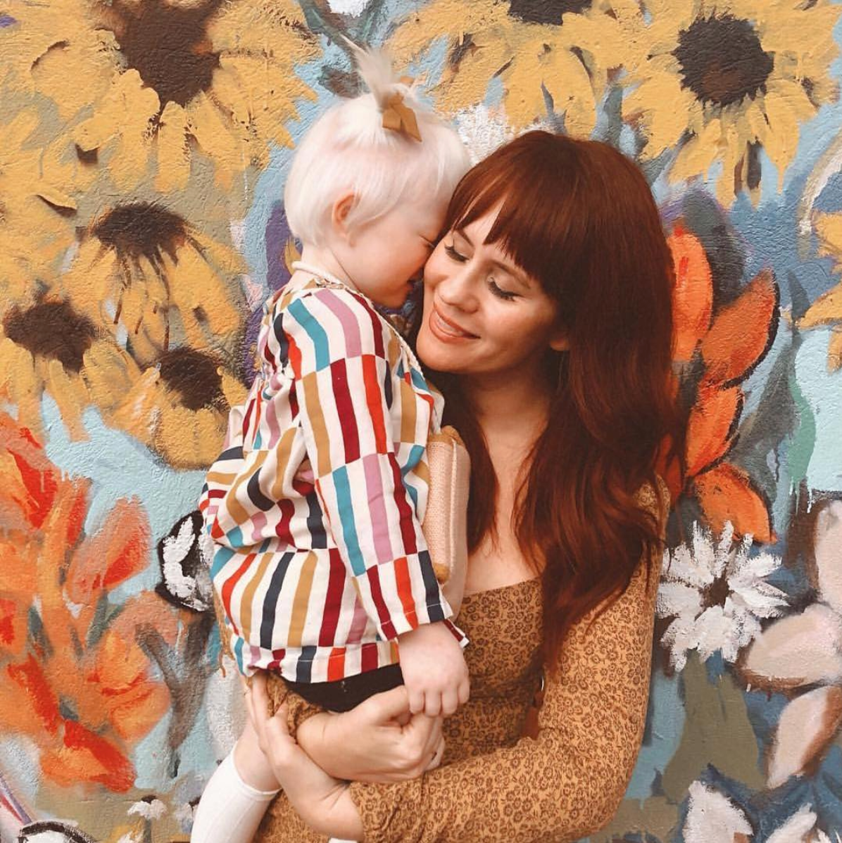 Pink Chicken customers Mother holding daughter in Pink Chicken striped dress