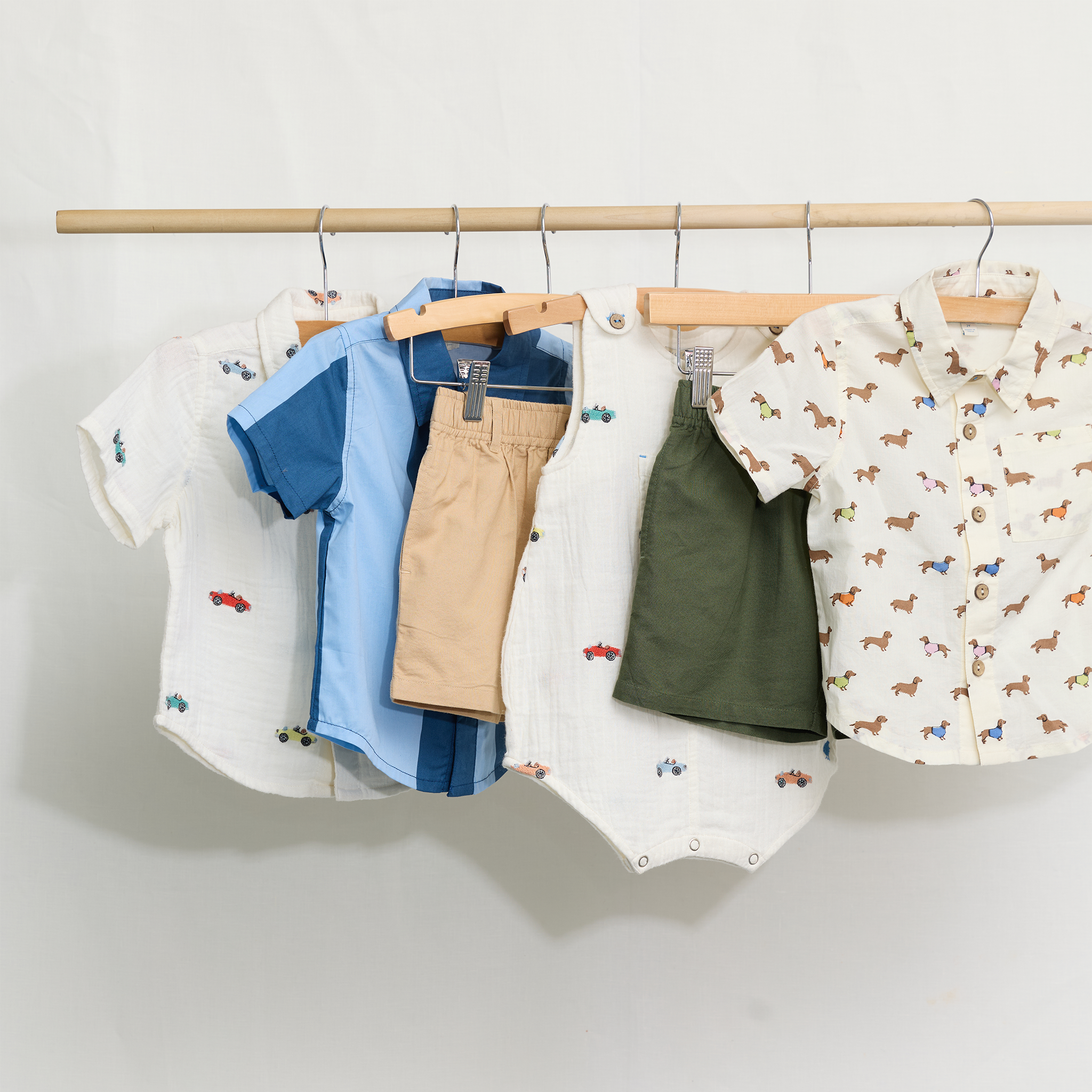 A playful classic with a pup filled twist! The Boys Jack Shirt features our dachshunds in sweaters print on soft 100% cotton cambric. Designed with short sleeves, a front left chest pocket, and finished with wood buttons, this easy button up is perfect for spring celebrations and everyday wear alike.