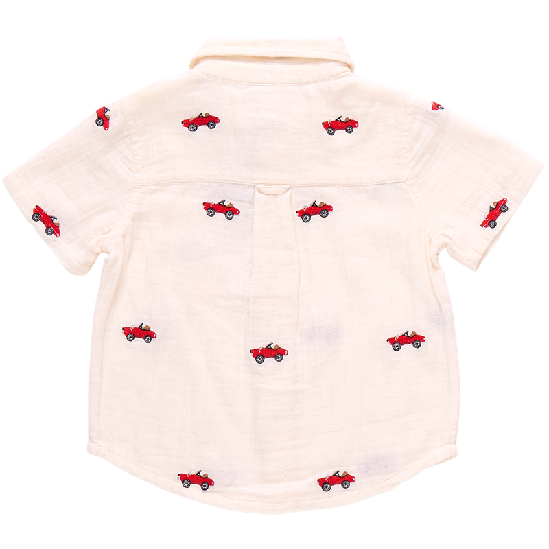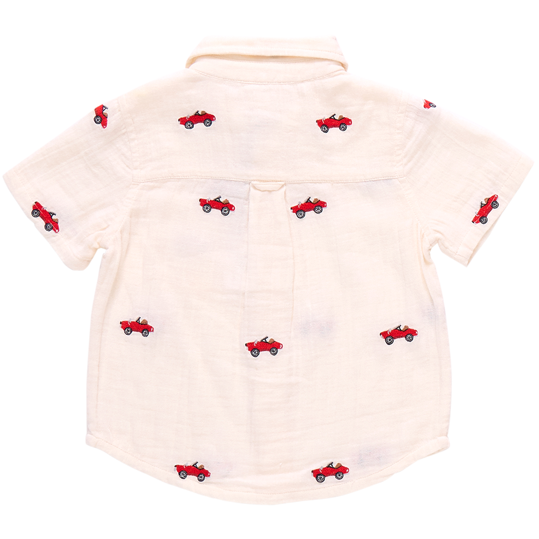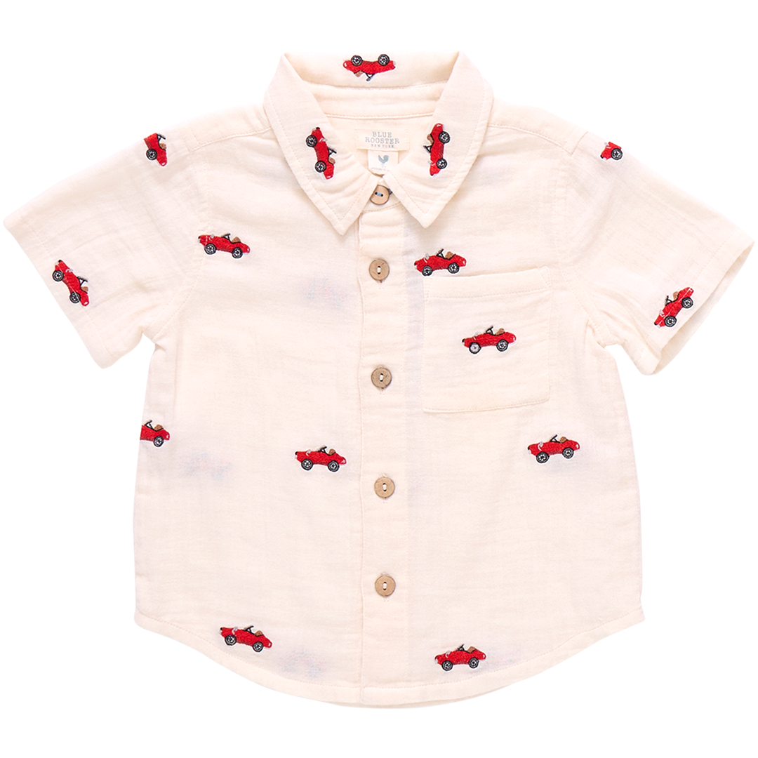 Tried And True! Our collection classic Boys Jack Shirt reflects your little guy's interests in a trio of new patterns. This short sleeve, collared staple features a roomy pattern on pattern front chest pocket fit for found treasure, and a faux coconut button front closure. Available in Blue Basketball Embroidery, Vintage Car Embroidery and Multi Vintage Stripe. Pair with our Boys Jackson Short for a versatile look that works for school days, neighborhood games and a family outings alike. Placement of embroidery will vary due to the nature of production.