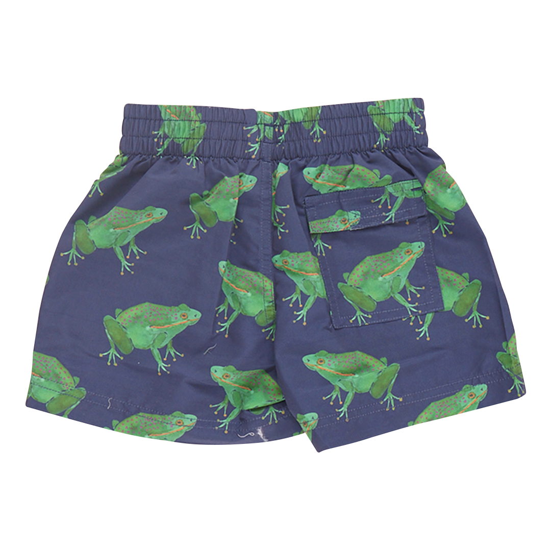 All In For Swim! Our collection classic Baby Boys Swim Trunk hits all the right waterside style notes. An exciting new collaboration with artist Jessica June Avrutin! Practical features include roomy side pockets and one velcro back pocket. An elasticized waistband adds comfort and easy movement; finished with a faux drawstring-tie closure. Hits above the knee. Available in Blue Watercolor Dogs, Green Golf Tournament, Navy Frogs and Bluestone Multi Fishies.