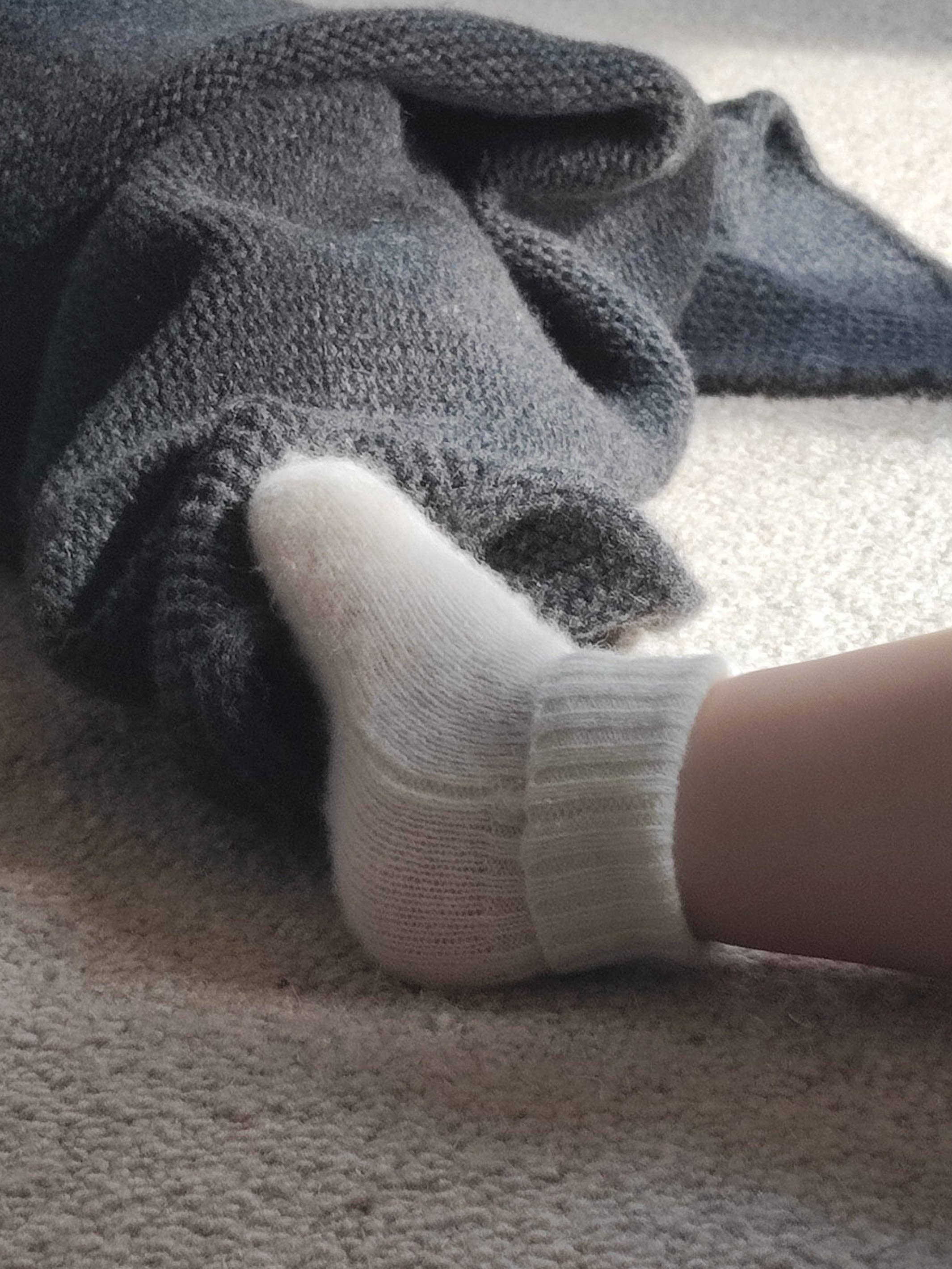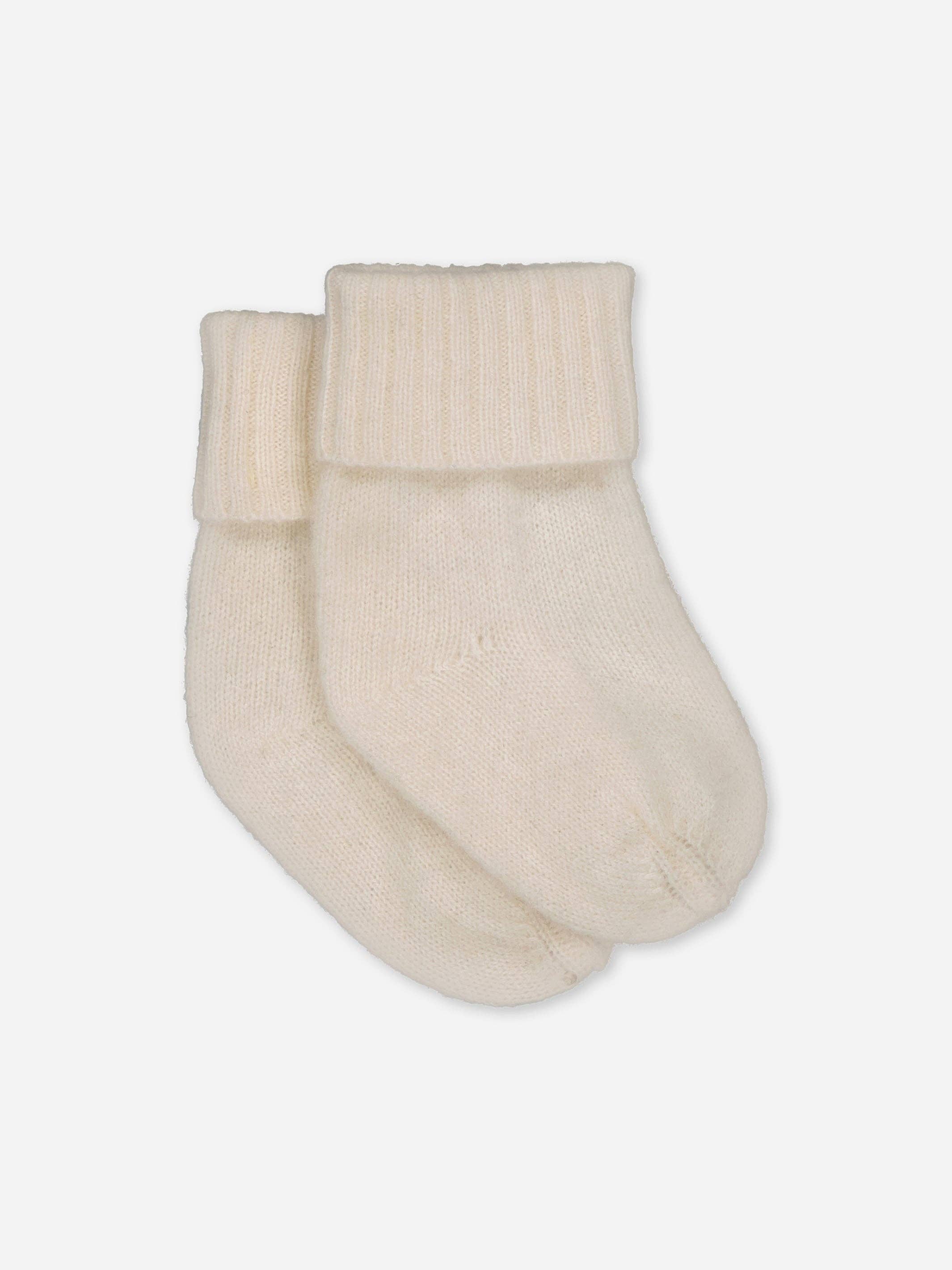These stunning cashmere baby socks keep little feet warm. Details: * 100% cashmere - 2ply * Composition: 60% recycled cashmere - 40% virgin cashmere * Made in China * OEKO-TEX® certified * Suitable for babies aged 0-9 months Reference: BTBA13