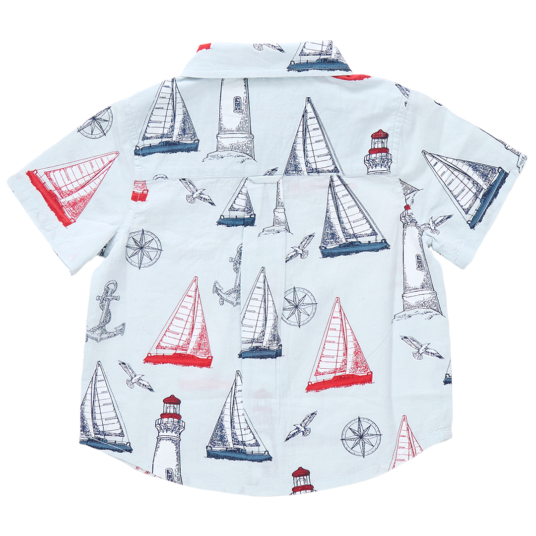 Smooth Sailing! Set sail for summertime fun both on the upper deck and dockside in our collared short sleeve Boys Jack Shirt crafted in our Nautical Adventures print. Full sails, friendly seagulls, lighthouses, anchors and compass stars against a clear blue ground animate this classic conversation print. Designer details on this Pink Chicken classic include faux coconut buttons at the front and a pattern on pattern chest pocket perfectly sized for a compass to lead the way to a fun filled afternoon. You'll find our Nautical Adventures print throughout our Red, White and Blue collection making it easy to match back to Mom, Dad and sibs!