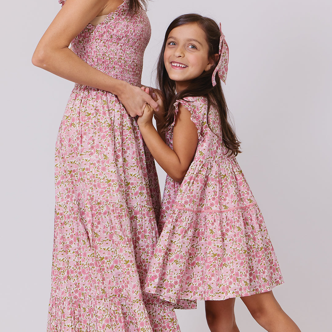 Mother's Day Capsule! We are thrilled to share our mini capsule collection Made with Liberty Fabric! This group of Mommy & Me looks will take you from Mother's Day through the Summer in classic style. Our Girls Polly Dress, crafted in Poppy and Daisy -a classic Made with Liberty Fabric floral in shades of warm pinks with moss leaves- will have the Mother's Day brunch bunch in love with its swingy skirt and fluttery ruffle sleeves. A rich pink velvet ribbon accents the two-tiered fully gathered skirt. Invisible zipper closure at the back. Finish off the look with our matching Girls Long Tailed Bow.