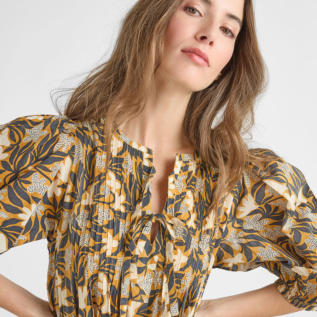 Online & Select Stores Exclusive! Exotic orchids bloom from a swirling trail of dark navy vines in our sophisticated Gold Wax Floral seen here on our collection classic Womens Pintuck Indira Dress. This much loved style features a pintucked detail at chest, double tie closure v-neck, gathered 3/4 puff sleeves and a removable belt make this easy to wear dress flattering for all women, including expectant mamas! Wear with a suede or leather ankle boot for chic Fall look. Match back to your little one in our flock favorite Girls Elsie Dress.