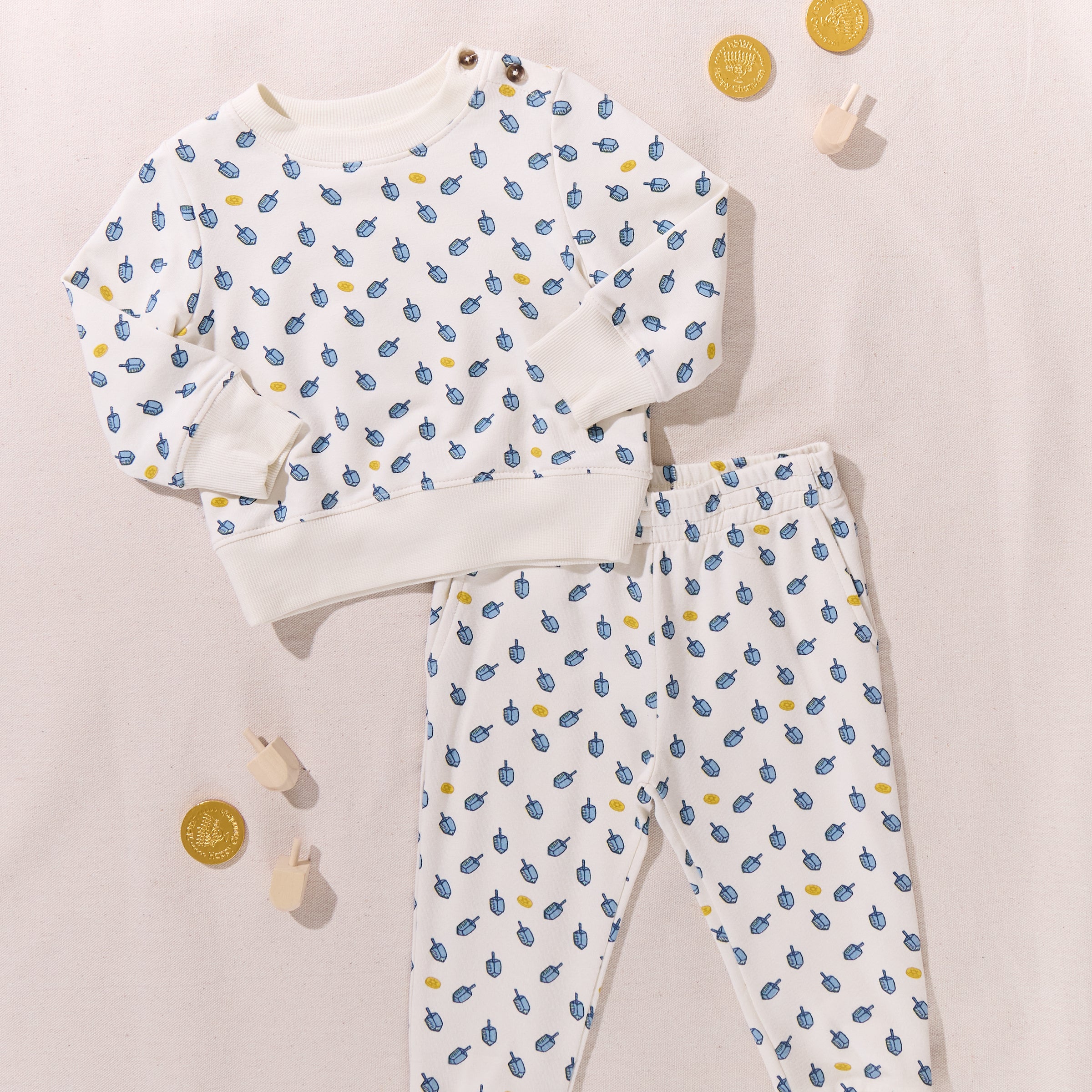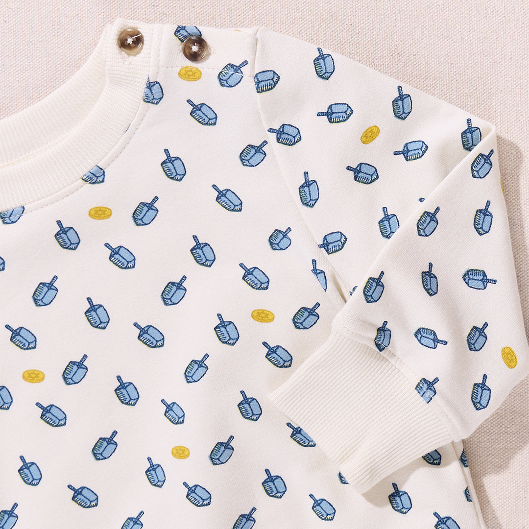 Holiday Bonus! Our Baby Jax Jogger Set keeps little merry-makers cozy and ready to roll. Made from super-soft organic cotton jersey, the long-sleeve sweatshirt features ribbed cuffs and hem, plus an easy button closure at the neck for quick changes. The comfy jogger bottoms have side pockets (for tiny treasures!) and ribbed ankle cuffs for the perfect fit. Finished with our signature Coop logo patch at the back because every journey needs a little style! Available in Mini Candy Cane, Mini Santa and Tossed Dreidels.
