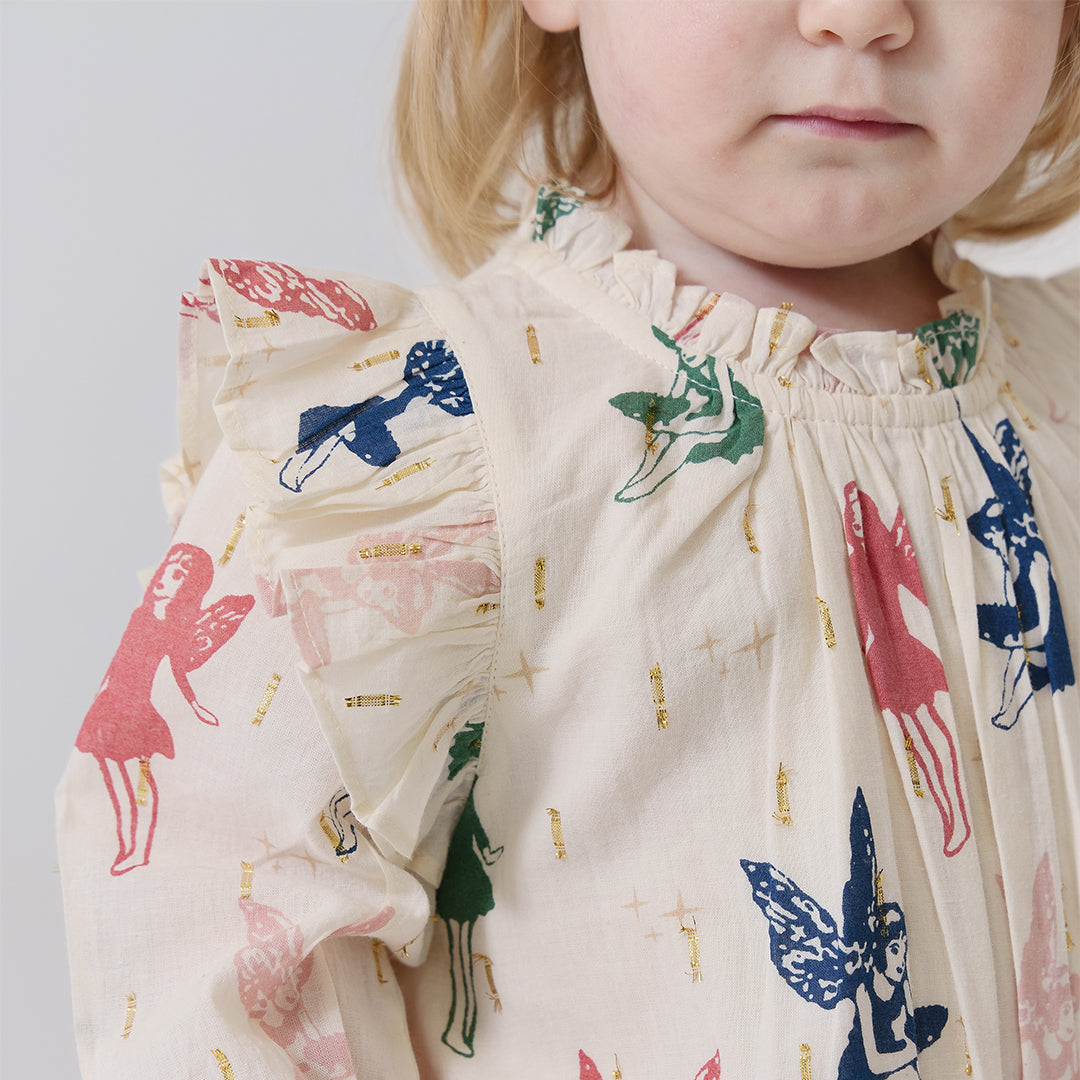 Delightful Dreamscape! A flutter of fairies, in shades of pink, forest and ink alight on a creamy ground in our dreamy Baby Girls Harper Bubble. This enchanting one-piece features a micro ruffle at the neck, a fluttery ruffle cap at the long sleeve, and a delicate pink pearl stitch at the cuff and leg opening. Invisible zipper closure at the back. Shimmery gold stars twinkle throughout adding a magical effect. Ring snaps at the legs allow for easy diapering. Match back to Big Sis in our Girls Harper Dress.