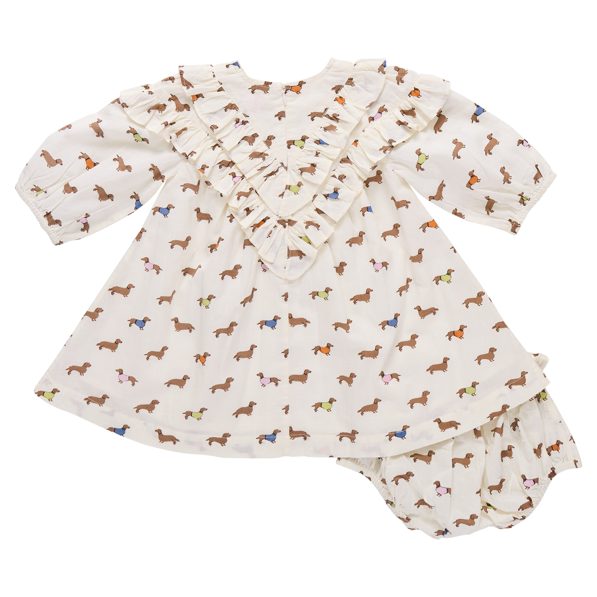 A brand new favorite full of playful charm! This new silhouette features our dachshunds in sweaters print on soft 100% cotton cambric. Designed with long sleeves, a two tiered ruffle skirt, and a ruffle V neckline, the dress is finished with an invisible zipper for easy dressing. The matching diaper cover features a blue satin bow for a sweet coordinating touch.