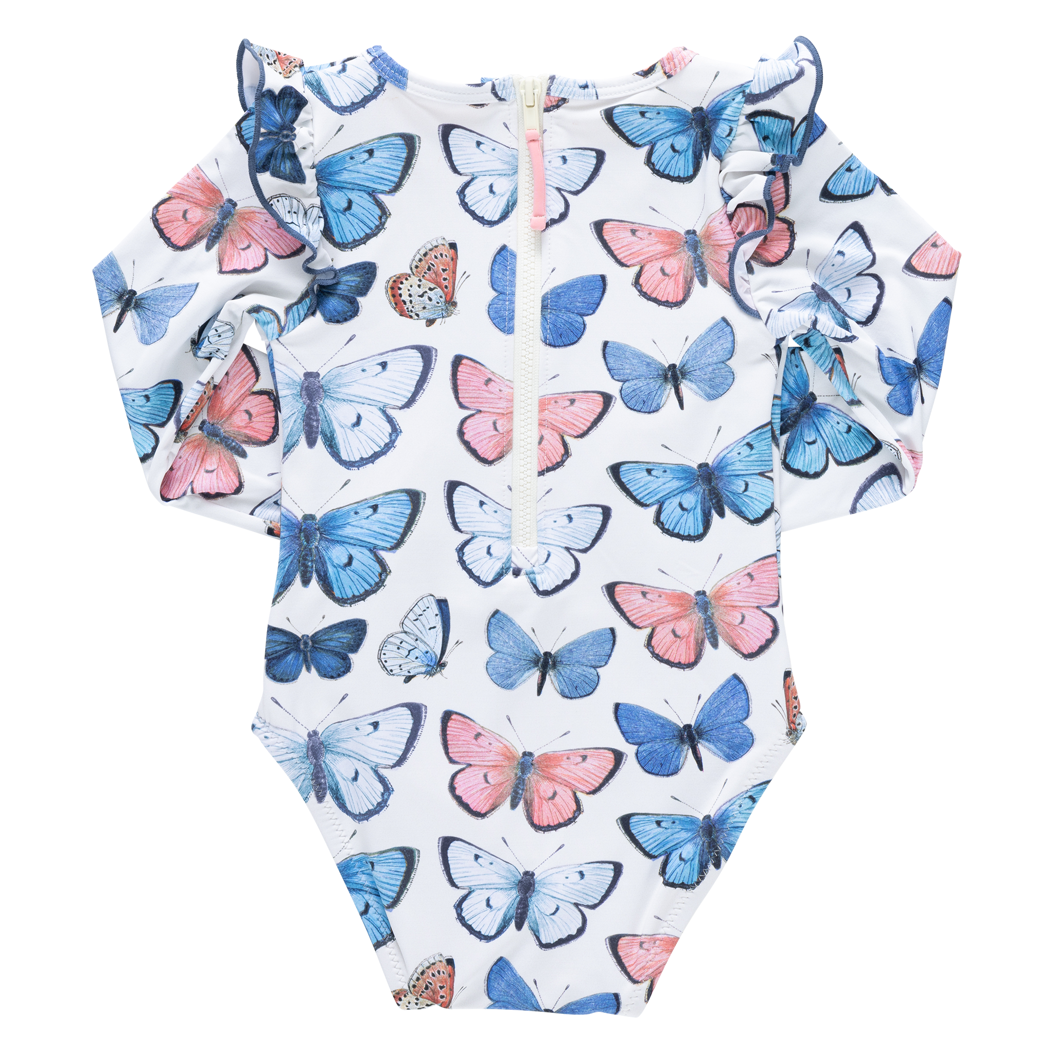 Covered in fluttering vintage butterflies, this long sleeve Rachel Suit brings nostalgic charm to every swim day. Ruffle shoulder detailing adds softness, while dark blue pearl stitching gives the silhouette a tailored finish. The 3/4 back zipper with a pink pull makes it easy to slip on and off after a full day of seaside exploring.