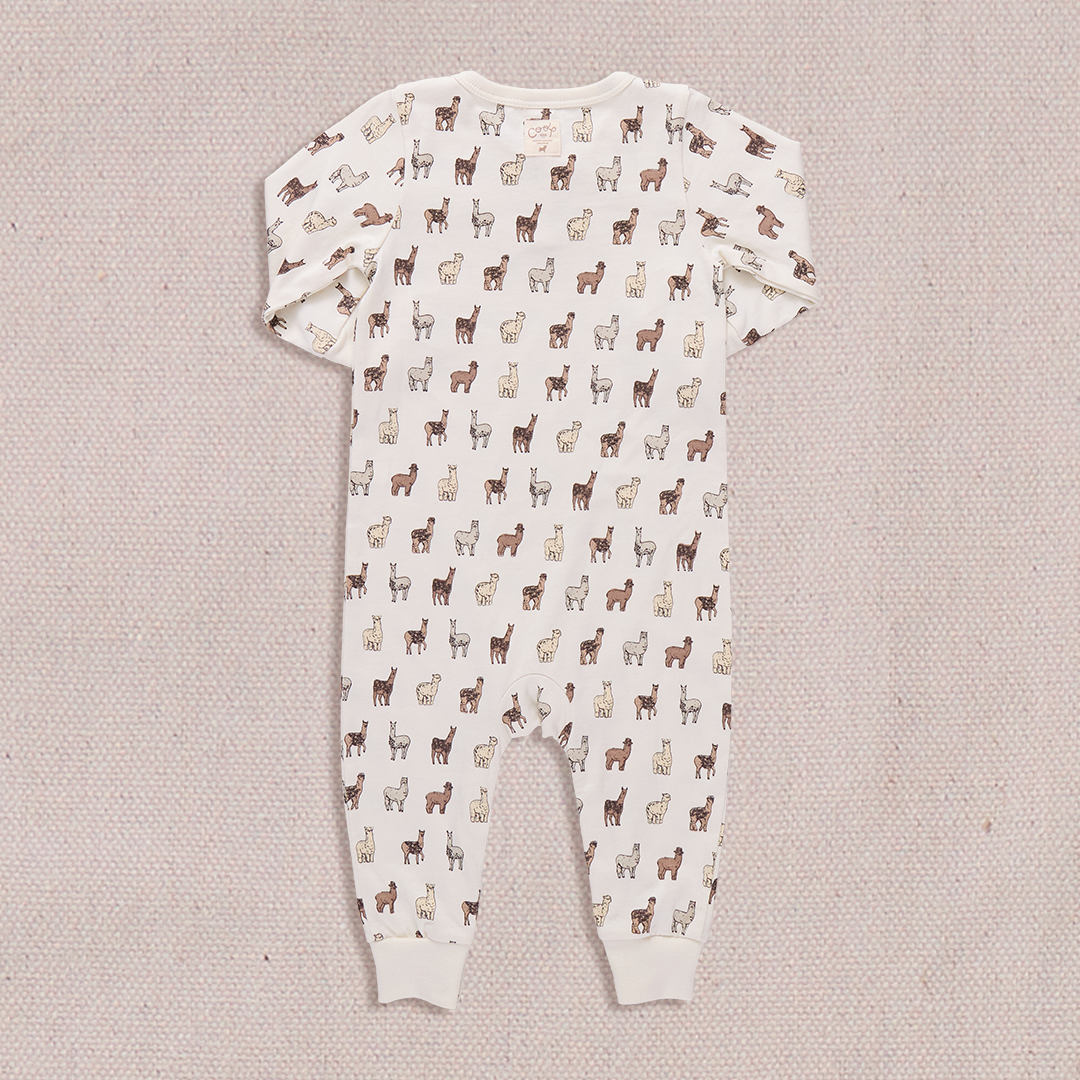 Scoot, crawl, toddle, and then... snooze, is exactly what your little busy body will do in our classic Baby Park Romper. Crafted in our oh-so-soft 100% organic pima cotton, with ribbed cuffs at the wrist and ankle, this long sleeve one-piece, available in our playful Tiny Vintage Guitars and Llamas and Alpacas prints, allows baby to stretch their freedom to move while keeping them all cozied up. Ring snap closure at the legs allows for easy diapering.