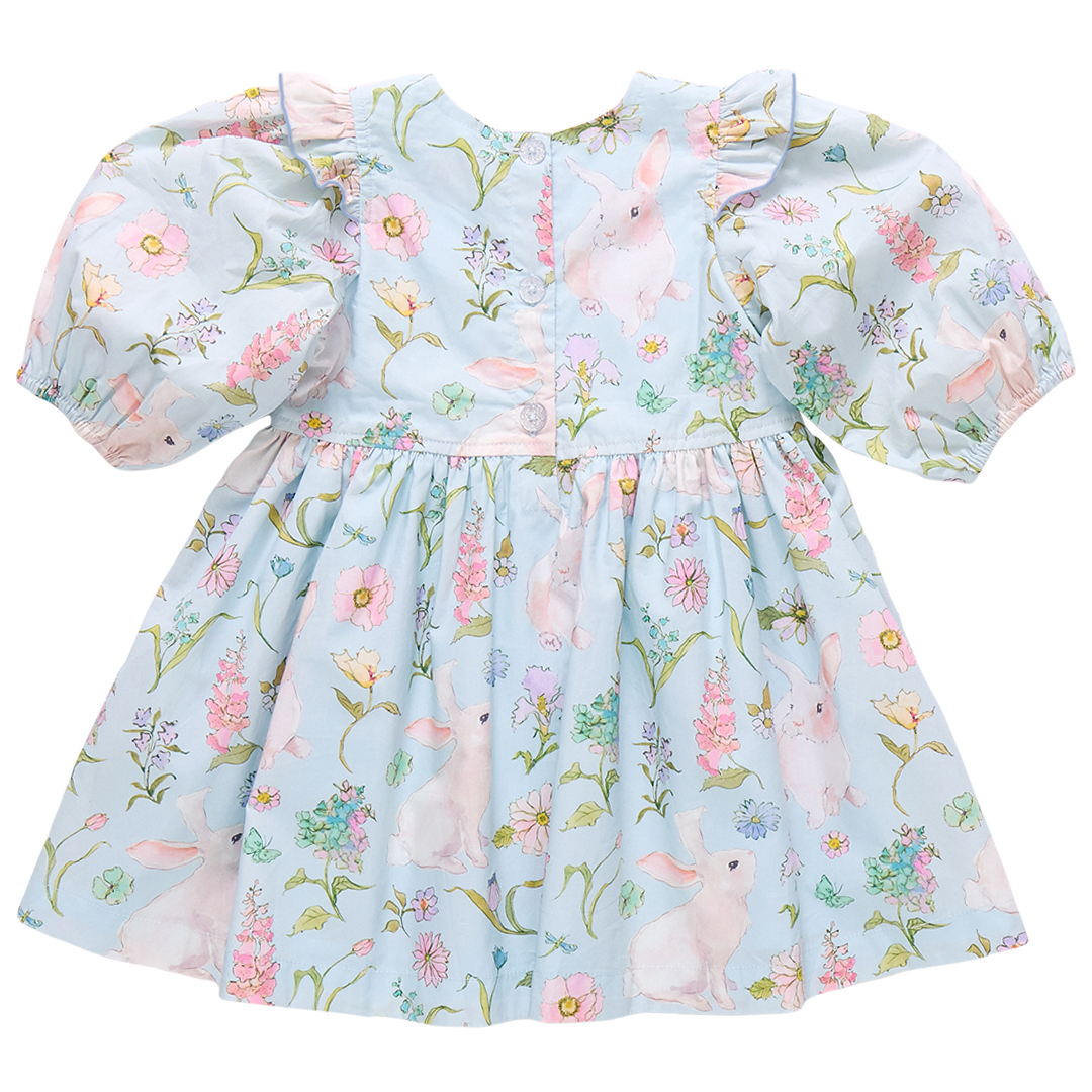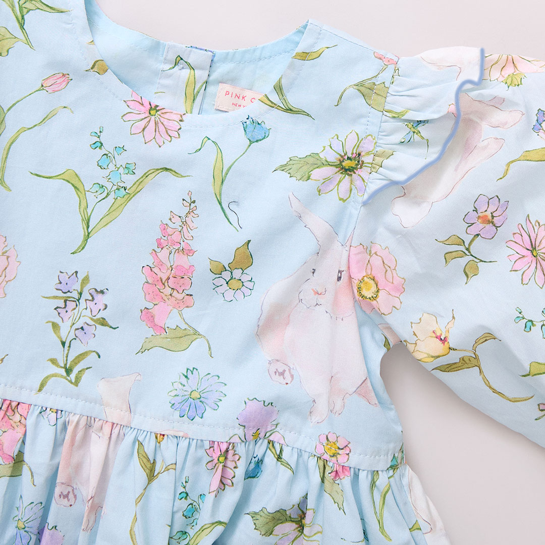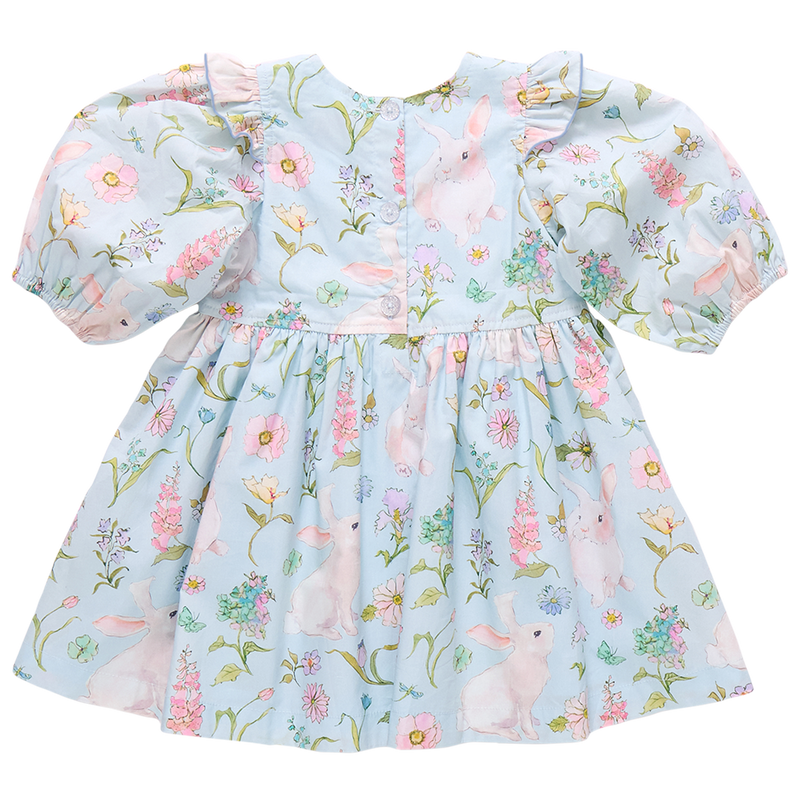 Garden Of Delights! Celebrate the artistry of Inslee Fariss, brought to life through her signature watercolor style! Curious rabbits explore a pastel field of wildflowers in our Botanical Bunnies print shown here on our classically styled Girls Brooke Dress. Signature details include a rounded neck, twirl worthy full skirt, gathered puff sleeve with an extra sweet ruffle detail, and glitter buttons at the back. Match back to Little Sister in our Baby Girls Brooke Dress Set or twin with a Big Sis in our Girls Gianna Skirt in Botanical Bunnies.