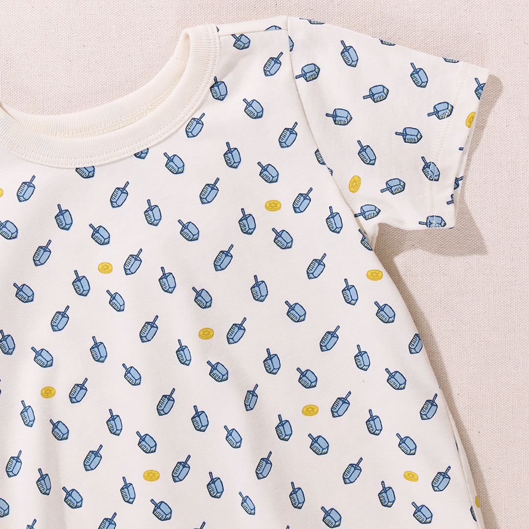 Holiday Bonus! Our super-soft organic Adventure T-shirt is up for anything, including a serious game of dreidel with friends and family. This comfy short-sleeve crewneck, in Tossed Dreidels, is specially designed with bright blue spinning tops and shiny Hanukkah gelt for the holidays. Our signature Coop logo loop at the hem adds an extra touch of fun. Loomed in 100% organic pima cotton with a touch of stretch makes this comfy and durable!
