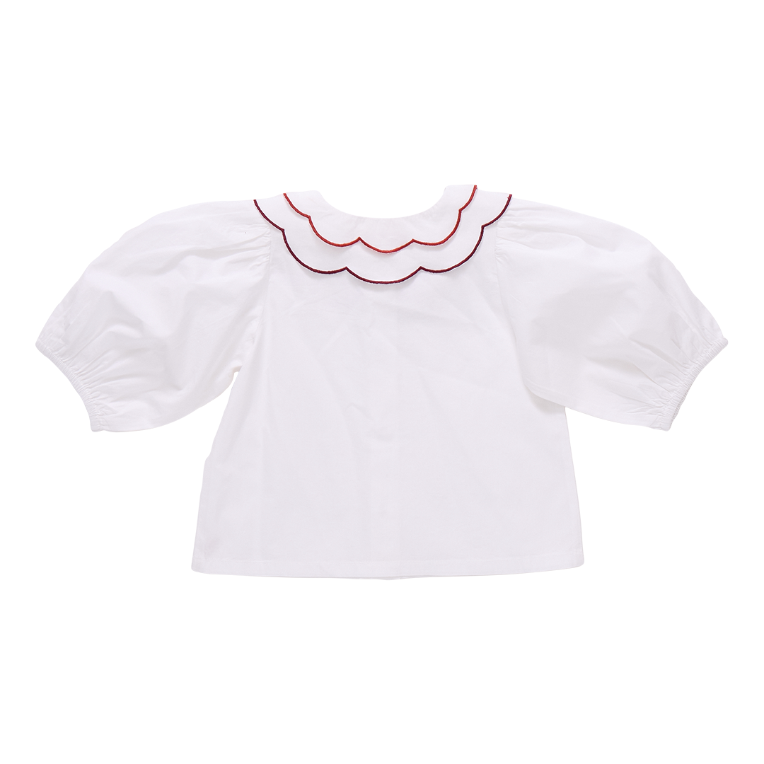 Style Standout! Our extra special, new-to-the-collection Girls Darcy Top makes a vintage statement in crisp white cotton poplin with a unique embroidered double scalloped collar. The top layer features an embroidered flower motif edged in a paprkia pearl stitch while the bottom layer is accented in a cinnamon pearl stitch. Signature details on this timeless silohuette include a rounded neck, gathered puff sleeve and silver glitter buttons up the front. Pair with our Girls Allie Skirt in Mixed Checks or our khaki Girls Wylie Pant.