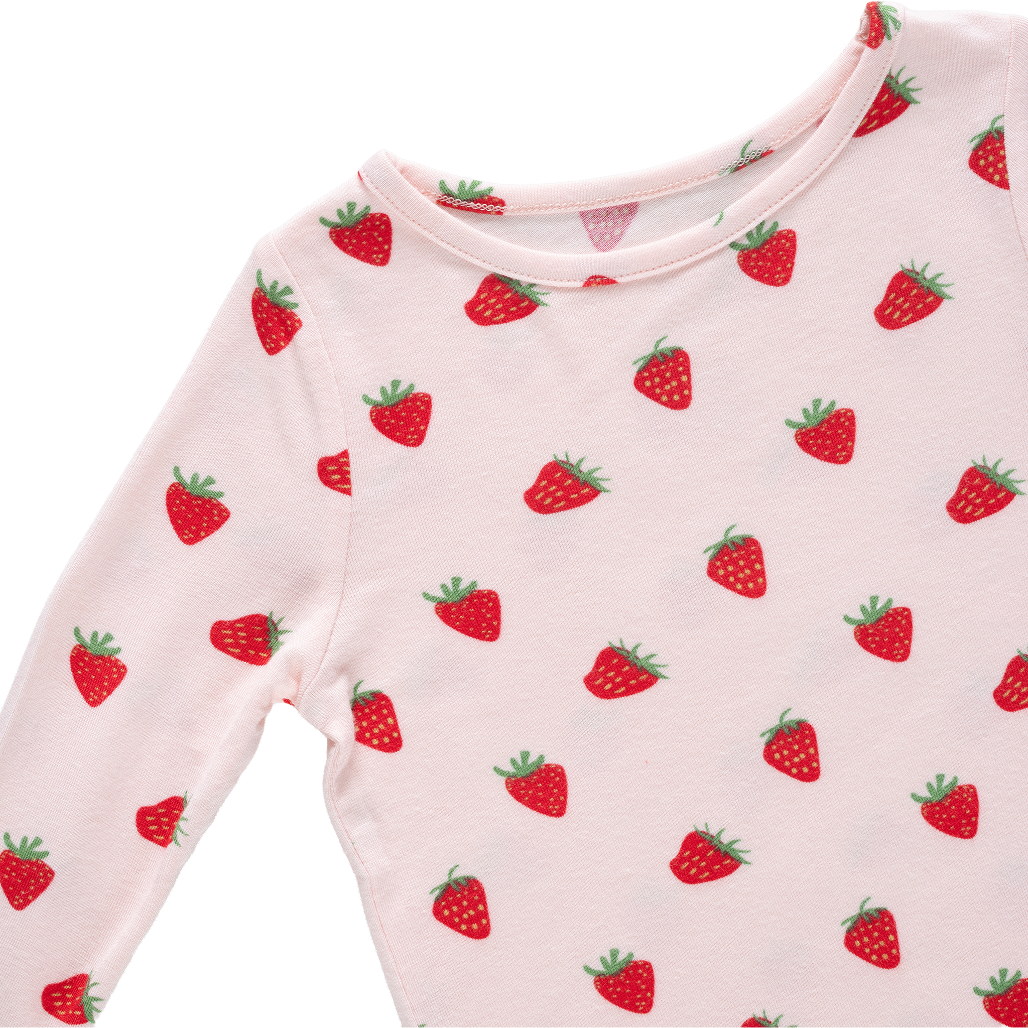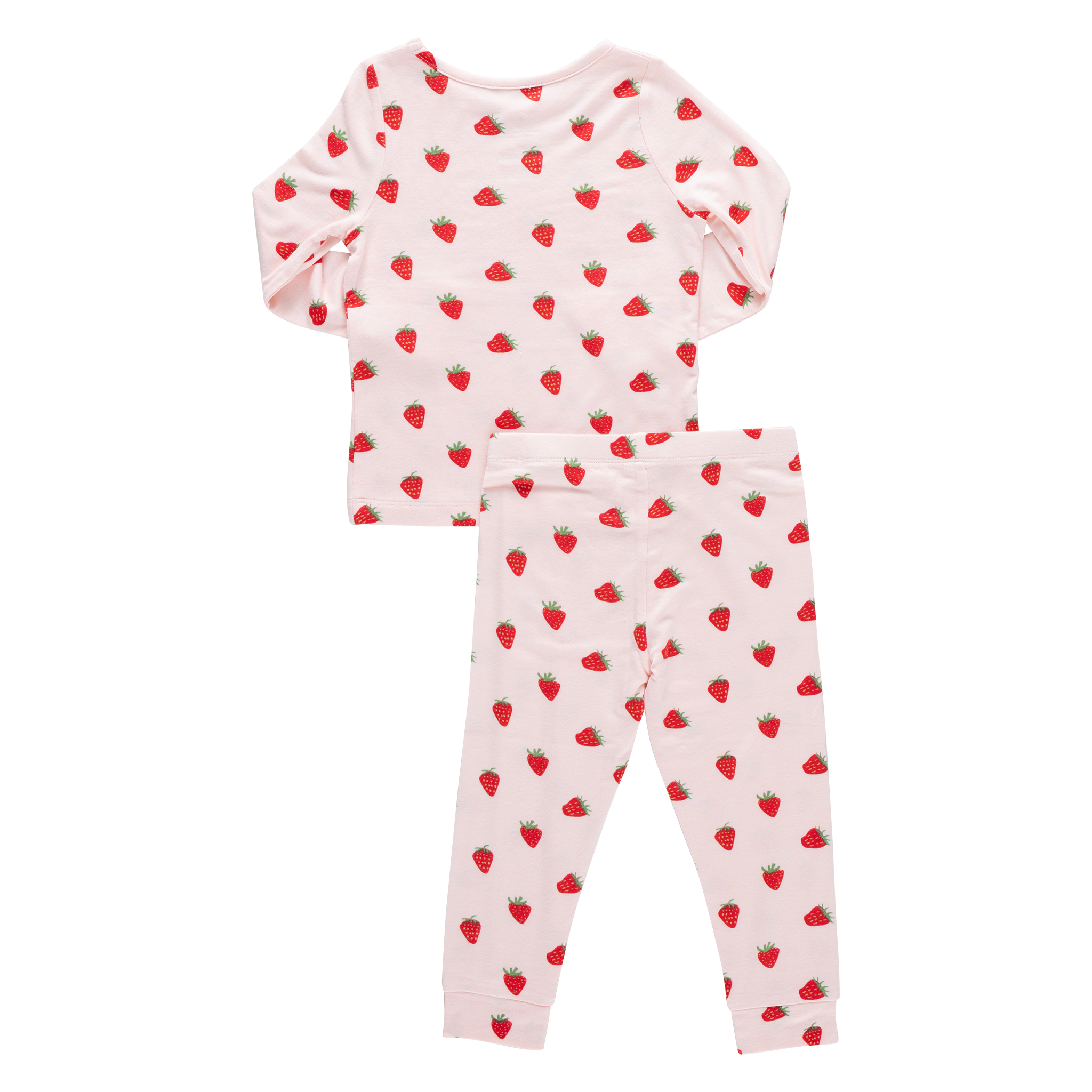 Sweet dreams start here! Our classic Kids Bamboo PJ Set gets a cheerful update in our Strawberries print. This cozy two-piece set includes a long sleeve top and elastic waist pant, designed for easy movement from storytime to sleep. Crafted from ultra-soft bamboo fabric with a smooth, silk-like feel, these PJs are breathable and help keep littles cool in the summer and warm and cozy all winter long. Perfect for bedtime, breakfast, and everything in between.