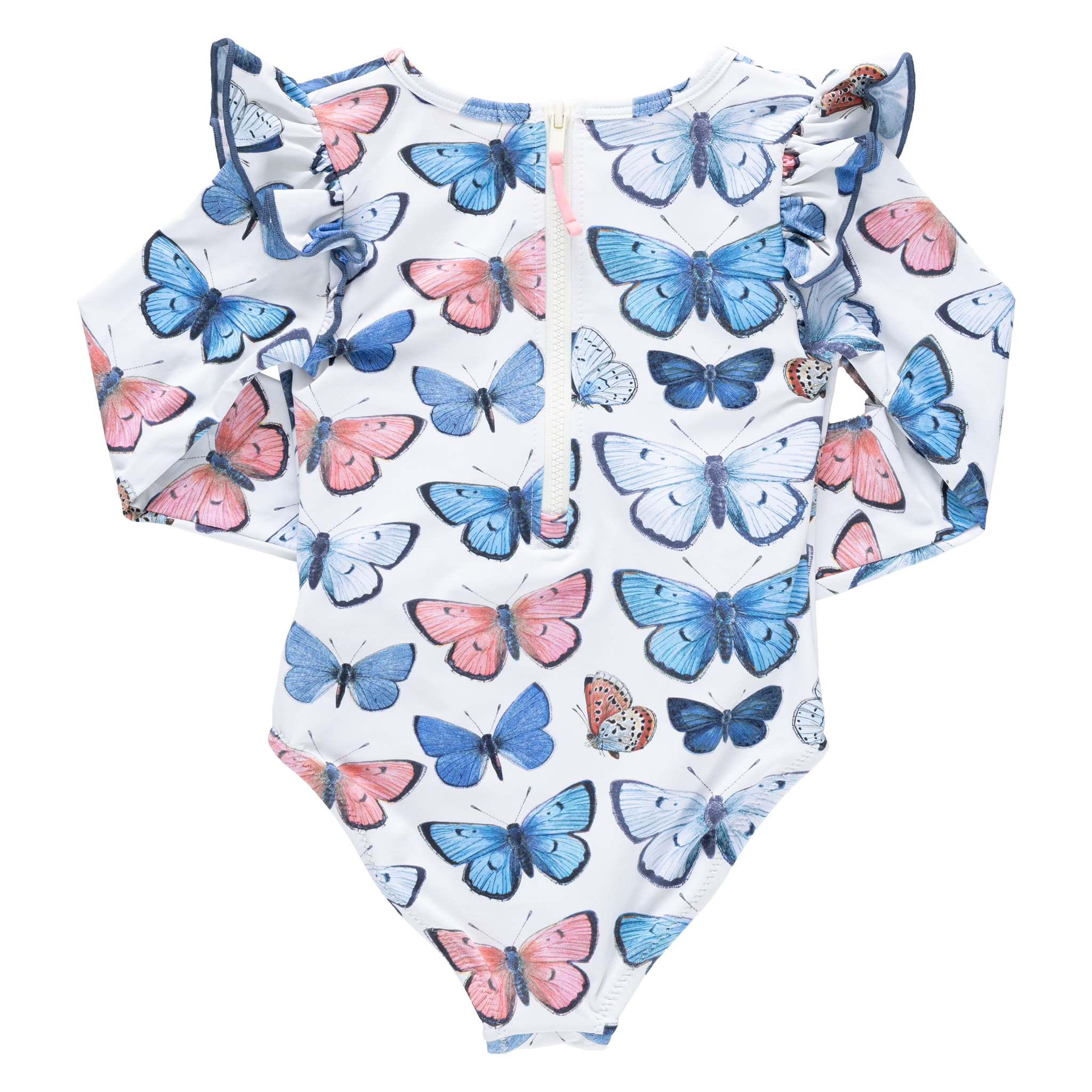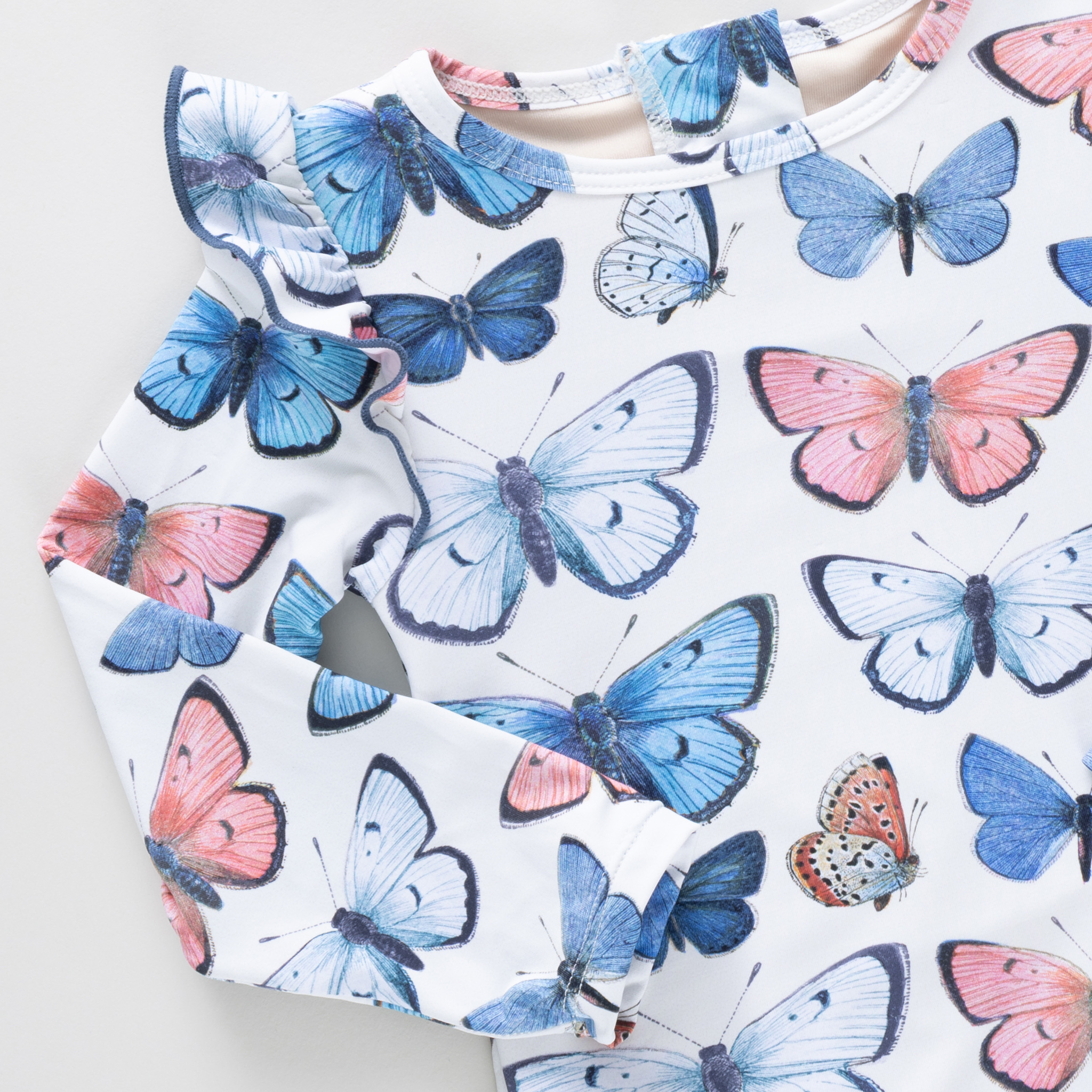 Covered in fluttering vintage butterflies, this Rachel Suit brings nostalgic sweetness to every swim day. Ruffle shoulder detailing softens the silhouette, while dark blue pearl stitching adds a tailored touch. The 3/4 back zipper with a pink pull makes changes simple between cannonballs and snack breaks.