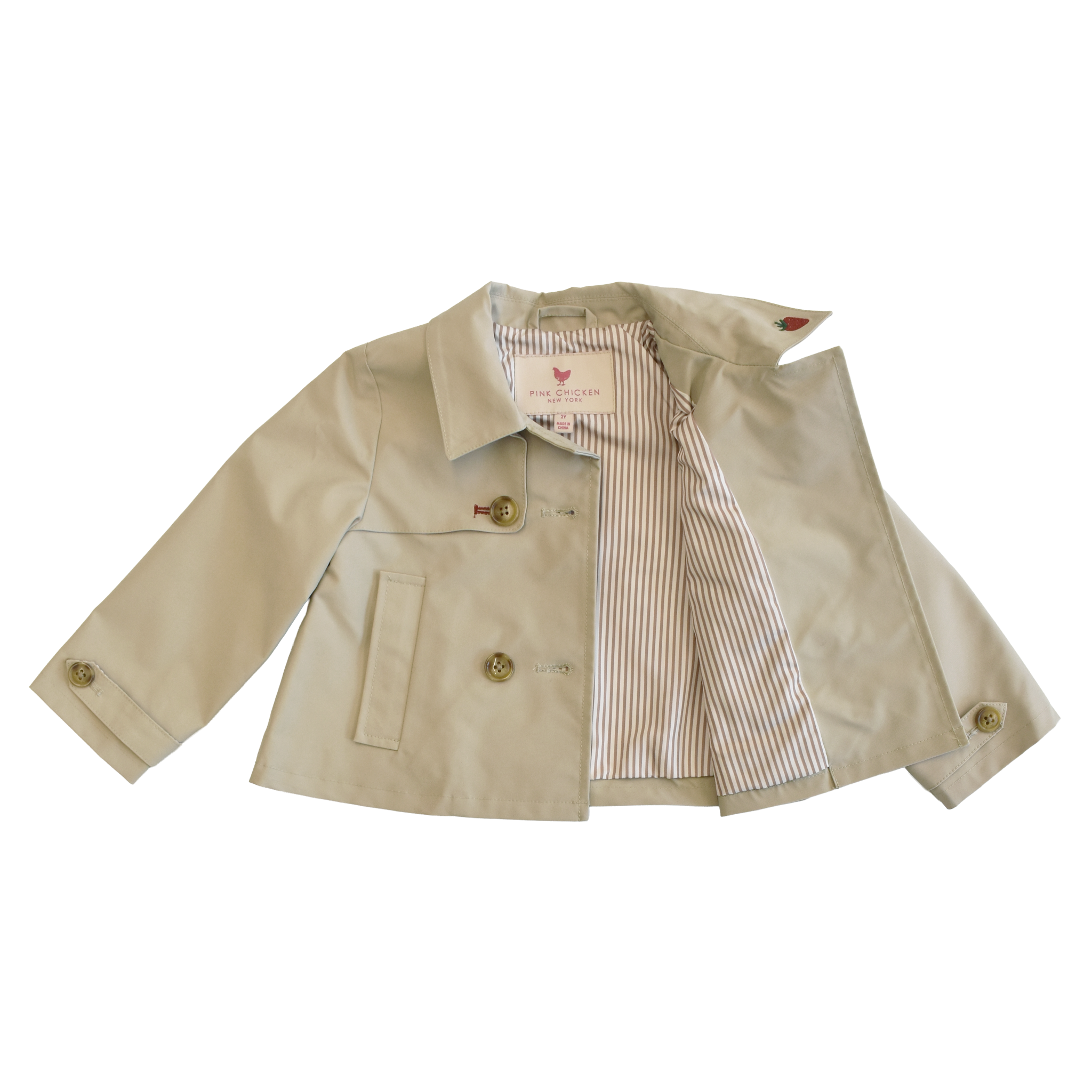 A modern take on a classic spring staple with a Pink Chicken twist! This cropped trench jacket features charming strawberry embroidery that adds a playful pop to a timeless silhouette. Designed with a structured collar, button-front closure, and an easy cropped length, it layers beautifully over dresses and separates alike. Equal parts polished and fun, this standout jacket is made for spring strolls, special occasions, and everyday adventures.