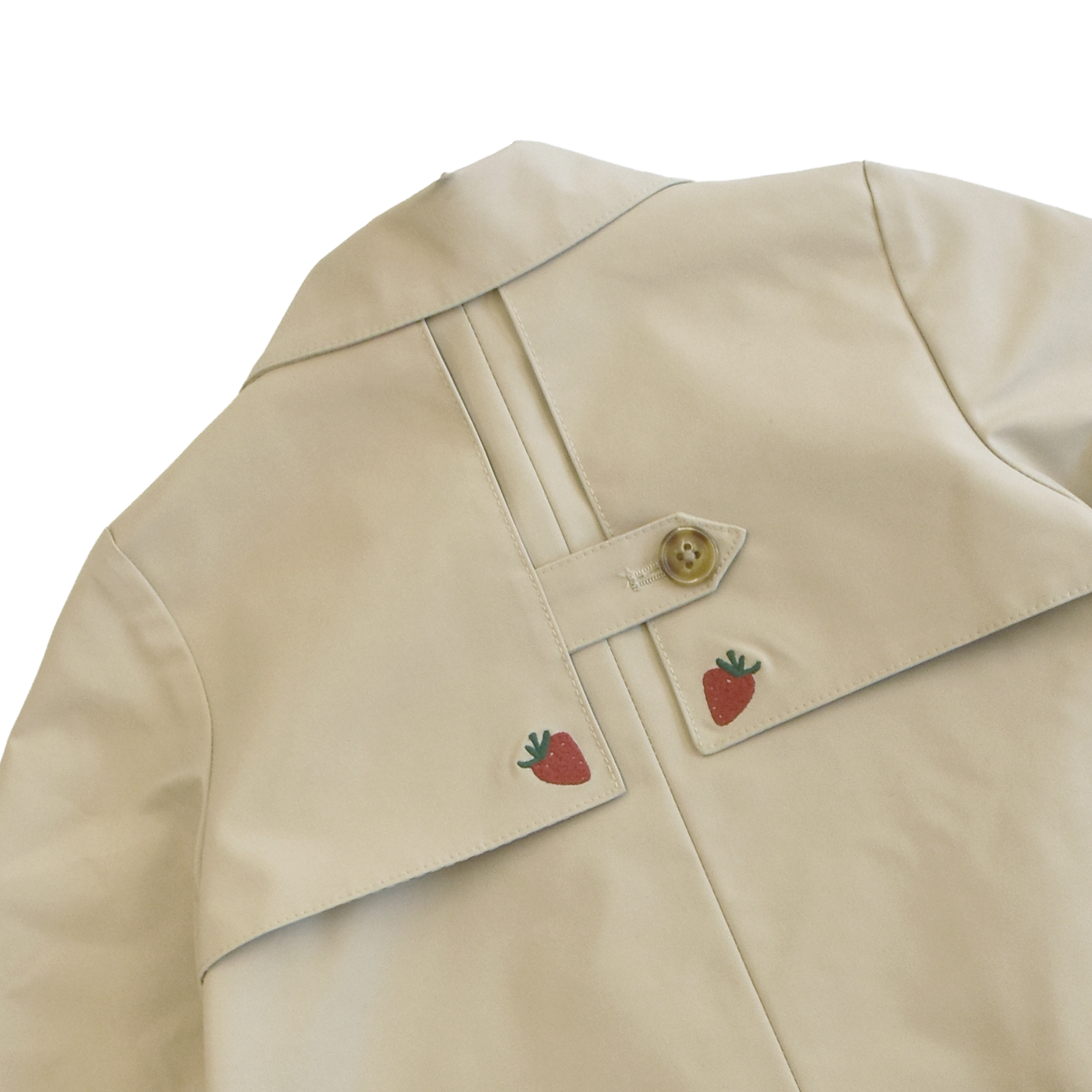 - Strawberry embroidery at front collar and back vent