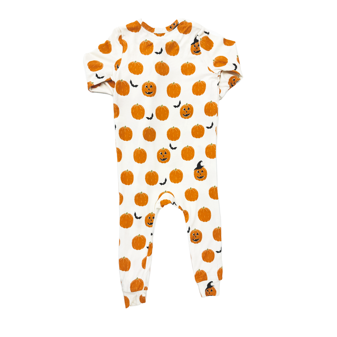 Pumpkin perfection! Playful jack-o’-lanterns and fluttering bats dance across our Baby Bamboo Romper in Halloween Jack O Lantern, making every giggle and crawl feel festive. Crafted in buttery-soft bamboo with a silky-smooth touch, this romper keeps little pumpkins cozy on crisp autumn nights and comfy during Halloween day play. Stretchy, breathable, and designed for spooky season adventures, it’s the go-to piece for trick-or-treat snuggles, pumpkin patch outings, and beyond.
