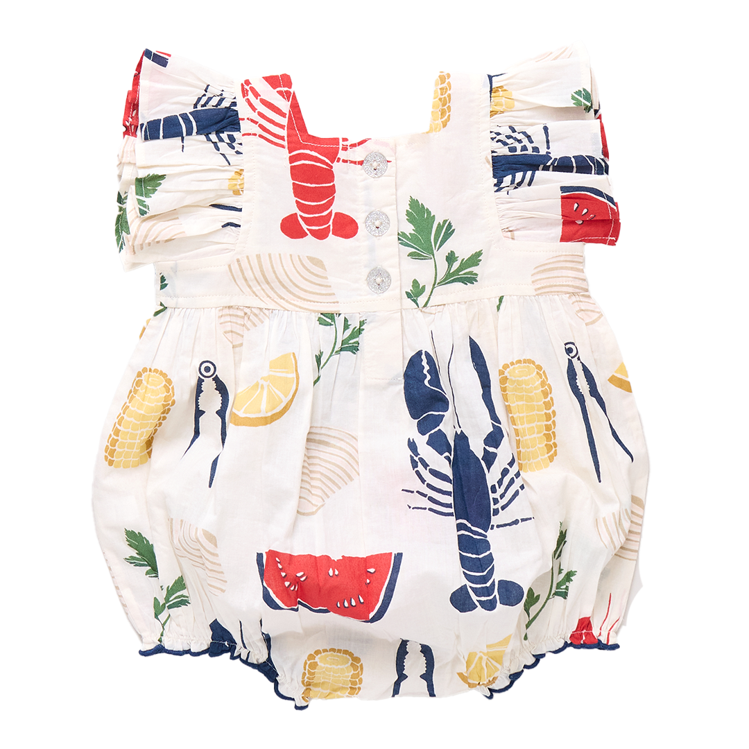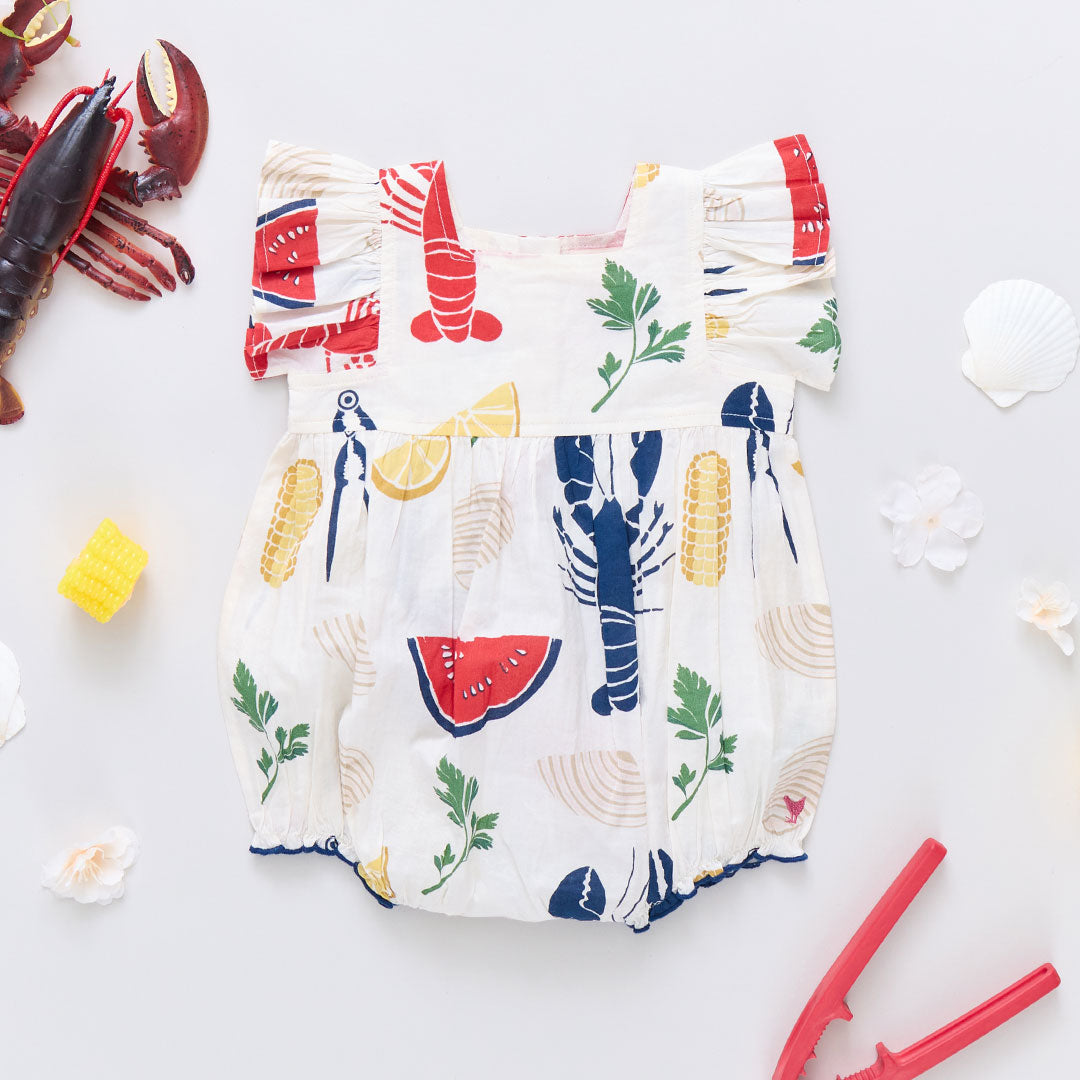Down The Shore! All the ingredients for a summer feast come together in our delicious Clam Bake conversation print. Lobster, corn, clams, watermelon and all trimmings pop against a crisp white cloth on our flock favorite Baby Girls Elsie Bubble. Signature details include a fluttery ruffle sleeve, classic square neckline and a tiny navy ruffle at the elastic leg. Ring snap closure at the bottom to allow for easy diapering. Glitter buttons at the back sew this piece up. You'll find Clam Bake throughout our Red, White and Blue Collection making it easy to match back to Mom, Dad and sibs.