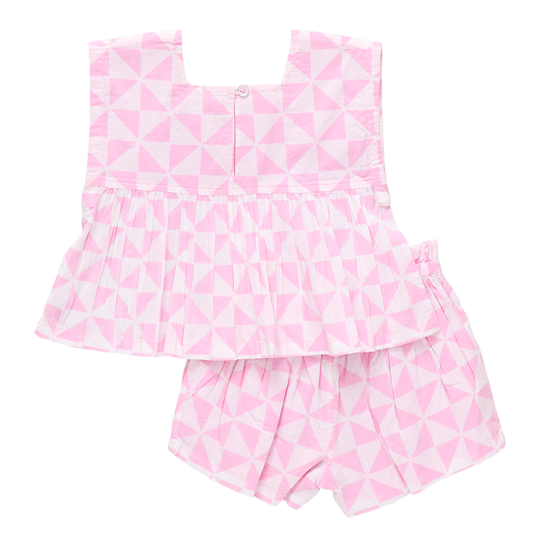 Shorts And Sweet! Our new-to-the-collection Girls Kamari 2-Piece Set adds an easy to wear elastic waist bottom, adorned with a faux pattern on pattern tie, to our already well loved breezy Kamari top. The boxy fit, sleeveless top features a square neckline and a silver glitter button keyhole closure at the back. This fresh ensemble embodies our free spirted summer attitude and is perfect for all sorts of adventures, indoors and out. Available in Pink Triangle Check and Prairie Flower.