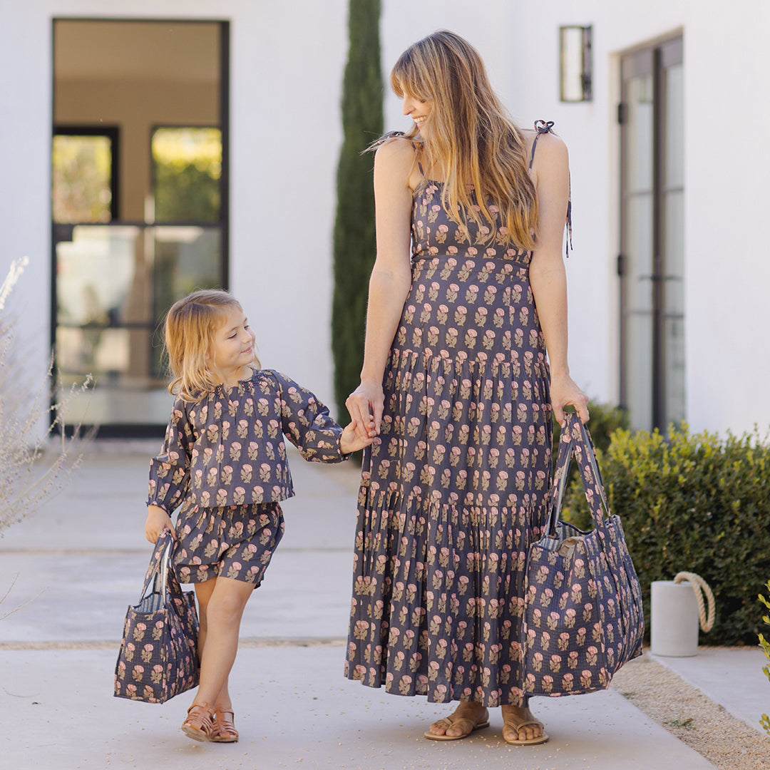 Signs Of Spring! Petal pink blossoms fan out across a rich navy ground on our elegant Womens Marilyn Dress, shown here in our Navy Flower Drop Print. This full length, form flattering tiered dress features adjustable skinny shoulder straps and forgiving smocking at the back. Fully lined with an invisible zipper closure at back,You'll find Navy Flower Drop throughout the collection in styles for both Little Sister and Mom making matching Mommy & Me moments easy to achieve.
