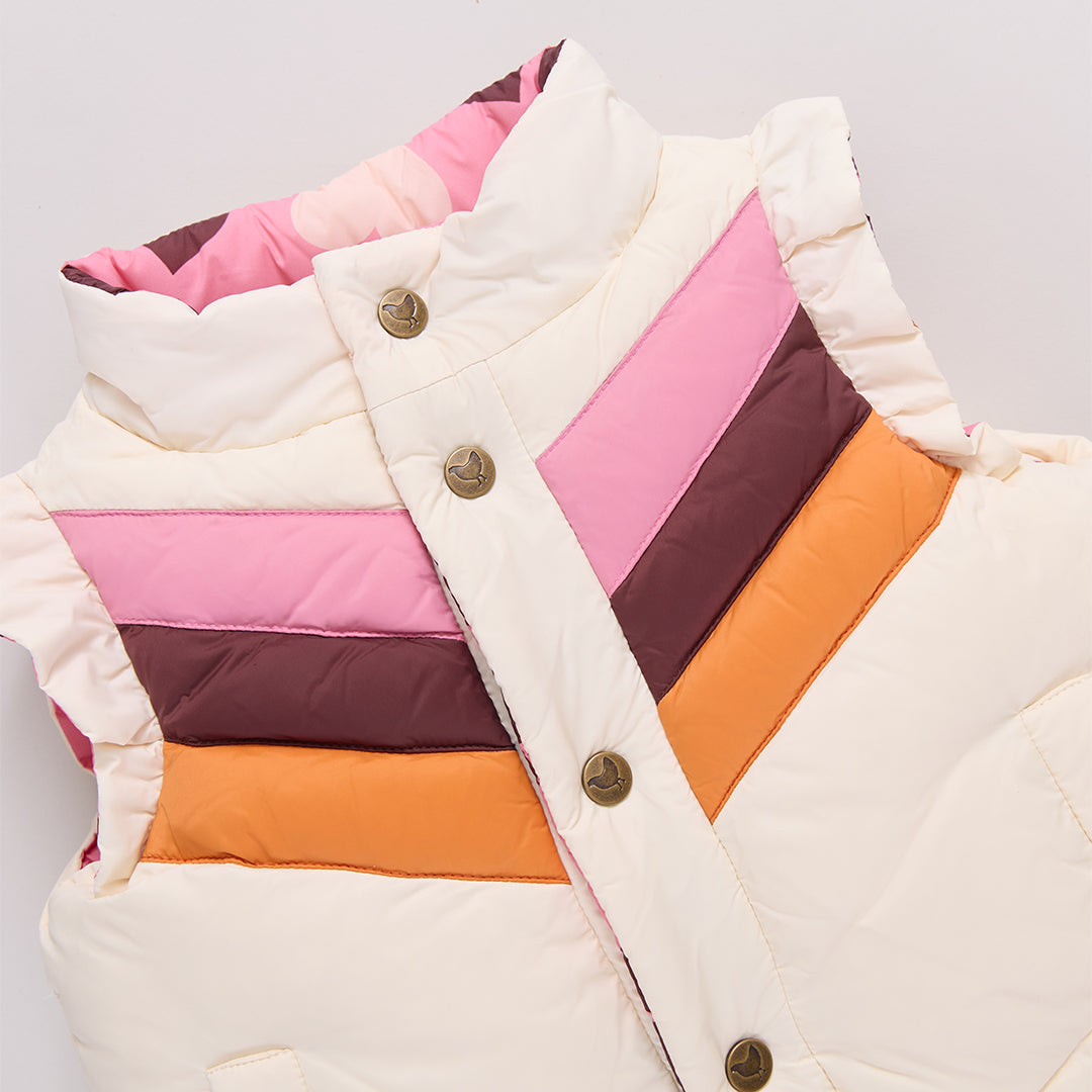 Layer Up! Sometimes a vest is exactly the best option for the adventure you've been planning. And our Cream Stripe Girls Reversible Ruffle Ellis Vest is ready to go whenever you are! Chevron stripes against a cream ground reverse to tossed hearts on a pink interior. Flirty ruffles at the arms, chicken embossed snaps and roomy pockets to keep hands toasty round out the look.
