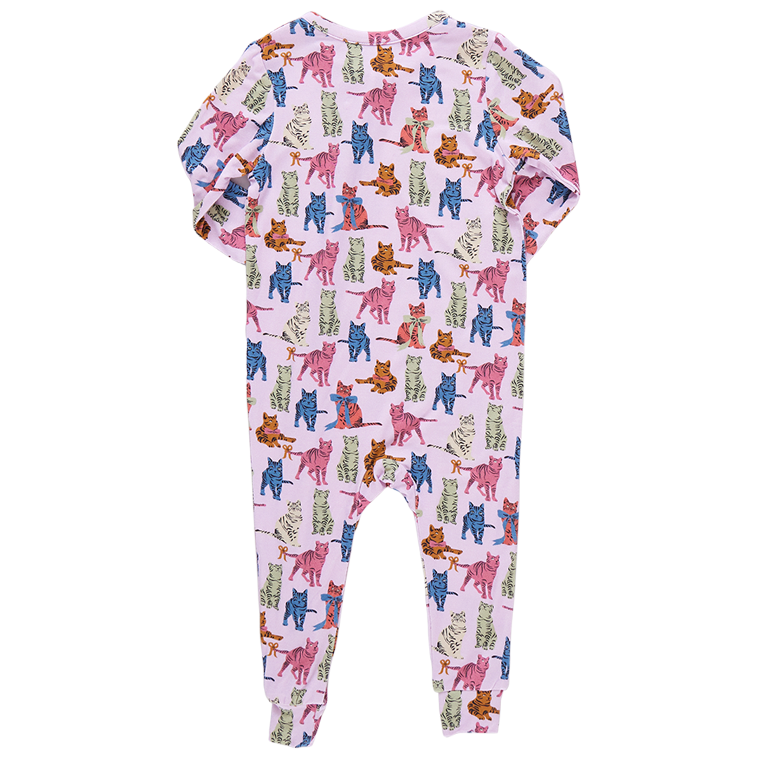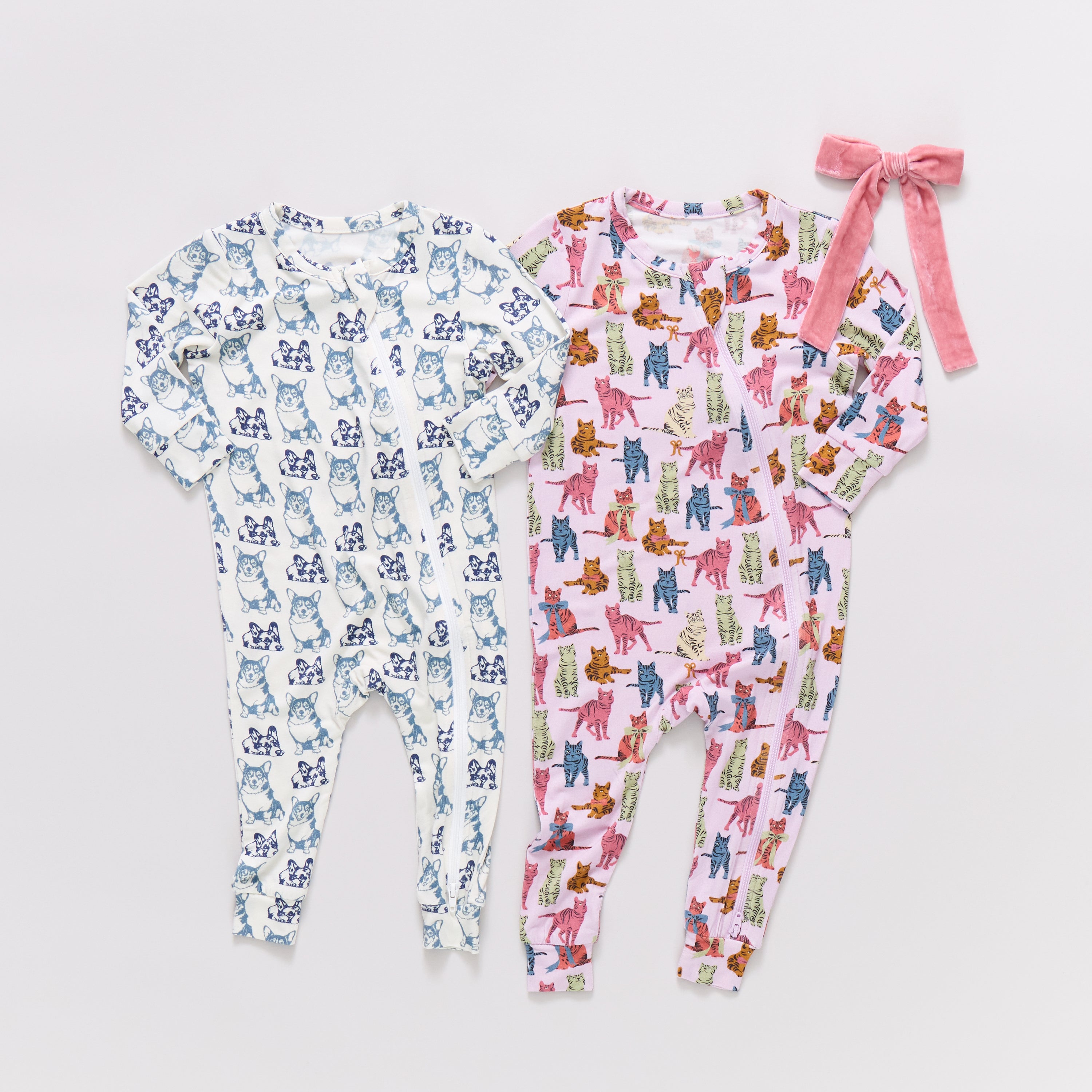 Bedtime Stories! Our much loved Baby Bamboo Romper sets our tiniest chicks up for a super cuddly sleepytime routine. A smart neck to ankle two directional zipper helps make diaper duty an easy task! Fold-over hand and foot cuffs on sizes 0/3 and 3/6 months and soft zipper cover protect baby from scratches. Crafted in Bamboo fabric, these are crazy soft and breathable with a smooth, silk-like texture. Available in Blue Corgis, Dump Trucks, Multi Bows, and Tabby Cats.