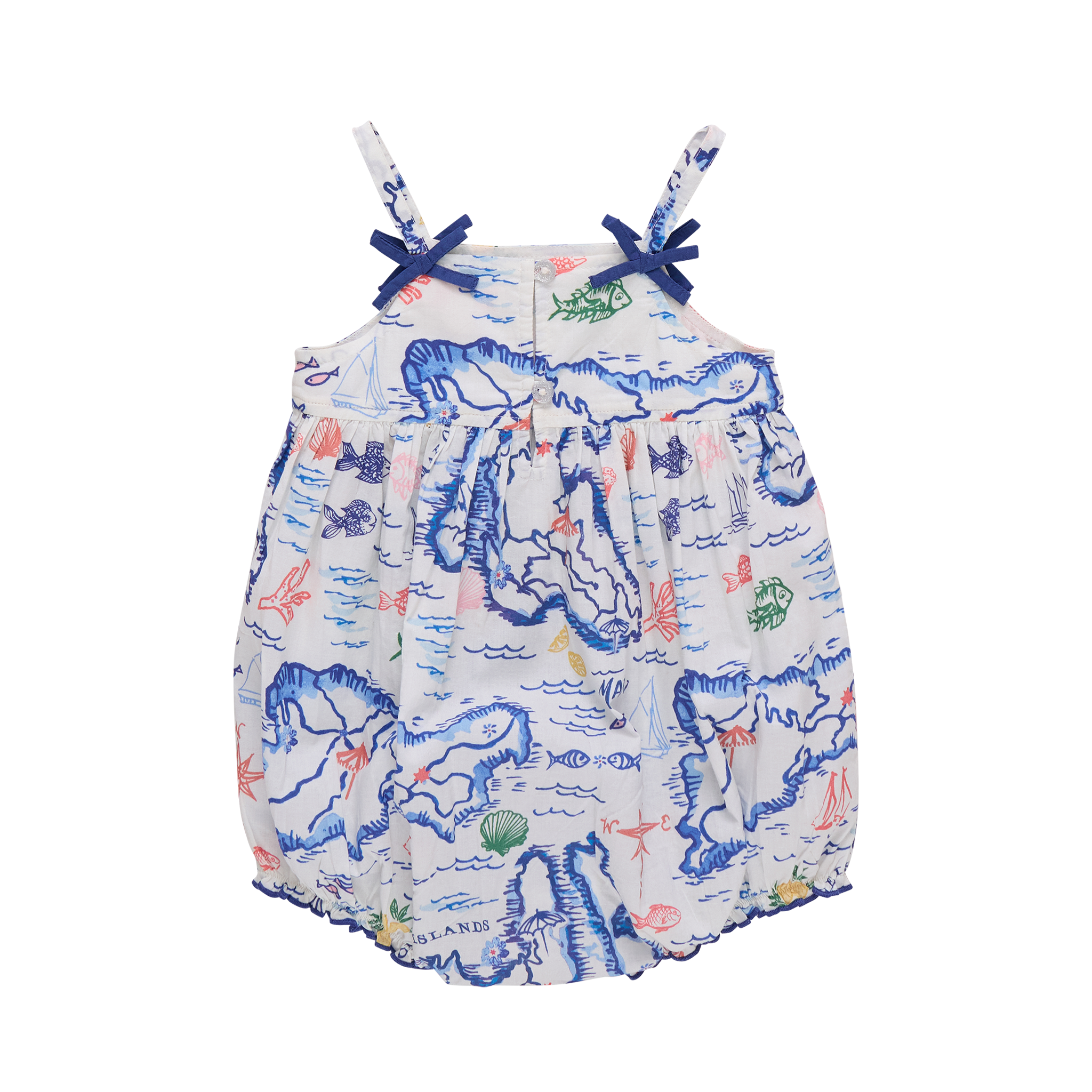 Tiny traveler! Chart a course for cuteness with our Baby Girls Tia Bubble, part of our exclusive Ashley Begley artist collaboration. This airy silhouette features fixed navy bows at the shoulders, silver buttons, soft ring-snap closures for easy changes, and finished with navy pearl stitching along the leg openings. A perfect match to big sister’s Tia Dress. Match with big sis in the Tia Dress and Mom in the Marilyn Dress for a family look that’s made for vacation.