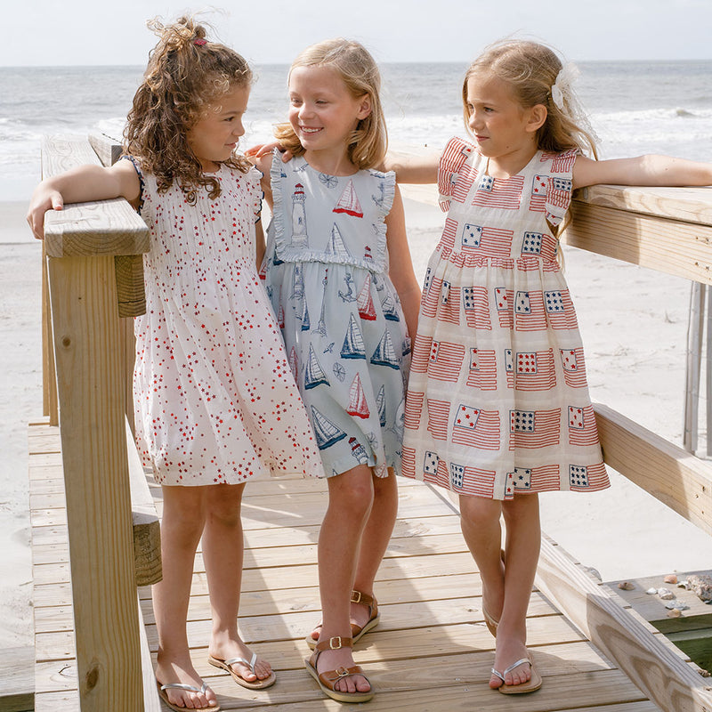 Smooth Sailing! Set sail for summertime fun both on the upper deck and dockside in our Girls Courtina Dress crafted in our Nautical Adventures print. Full sails, friendly seagulls, lighthouses, anchors and compass stars against a clear blue ground animate this classic conversation print. Designer details on this new-to-the-collection silhouette include a traditional ruffled chest and back bib, glitter button closure at the back and generous pattern on pattern side pockets. Pair with a sneaker for backyard fun or dress up with a saltwater sandal for family dinner at the lobster shack. You'll find our Nautical Adventures print throughout our Red, White and Blue collection making it easy to match back to Mom, Dad and sibs!