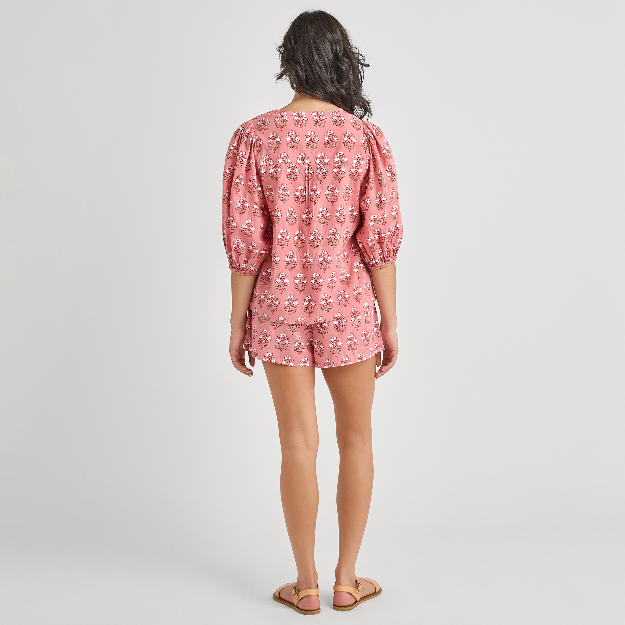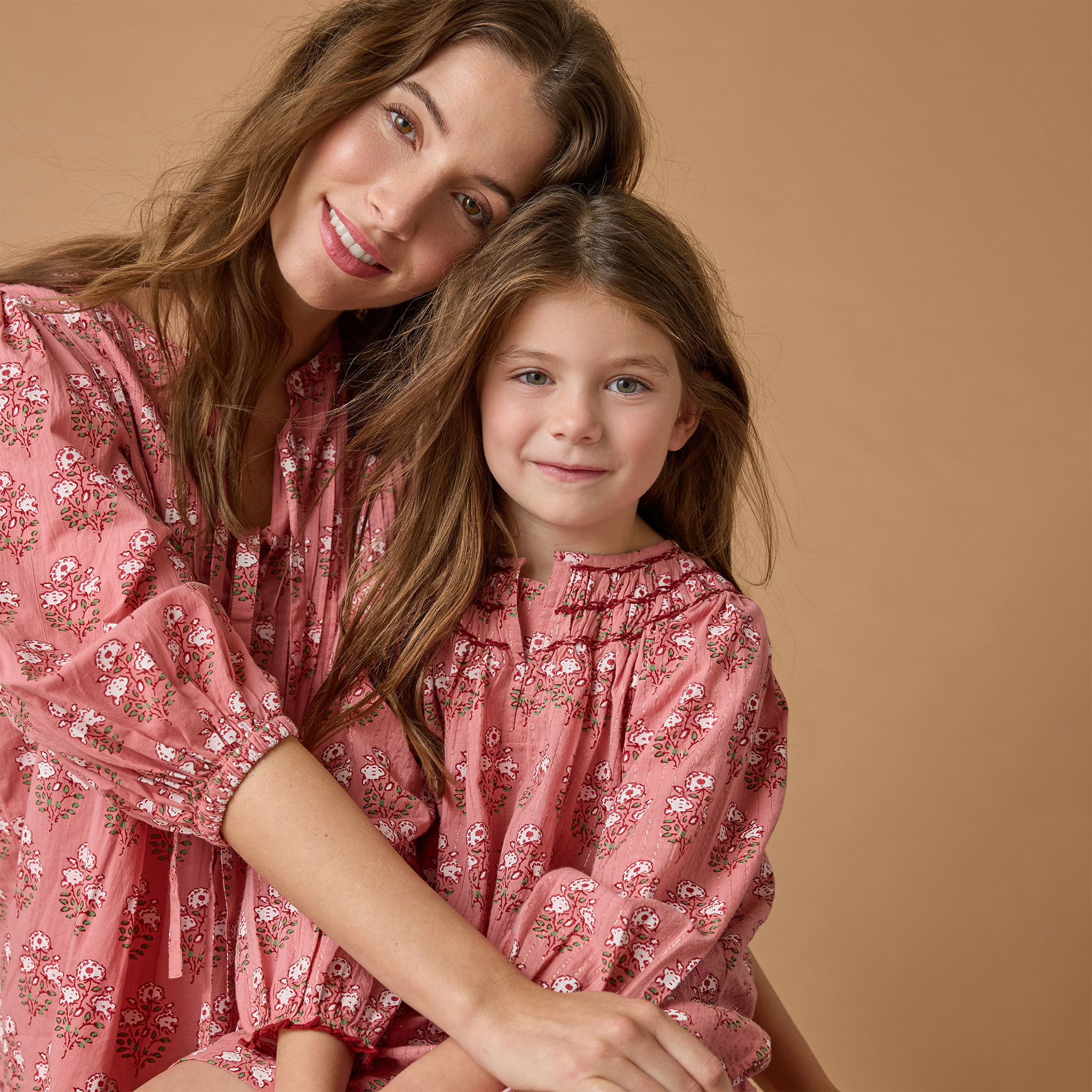 Full of spring grace, our Women’s Pintuck Indira Top in Pink Strawflower Block Print is a gentle nod to classic elegance. Delicate pintucks, two bow closures, and rosy blooms make it perfect for coordinating with your minis in the Girls Mary Barrett Dress, Girls Ava Top, and Baby Girls Elsie Jumper.