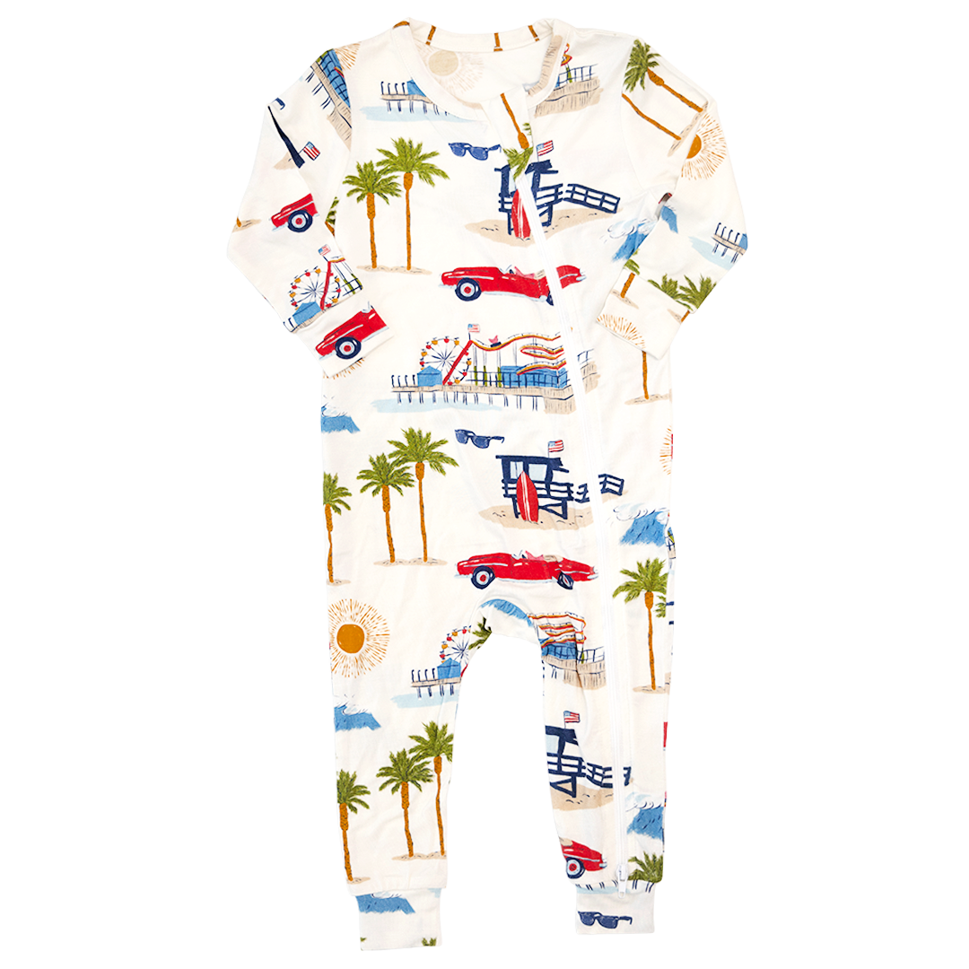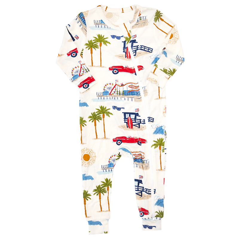 California Dreaming! In collaboration with artist Krissy Mast, we are so excited to launch this new PJ print inspired by some of our favorite LA area staples - the beach, palm trees, sunshine and convertible cruising! This charming print is sure to be a keepsake for locals and visitors alike. Crafted in Bamboo fabric, these are crazy soft with a smooth, silk-like texture. The best part - bamboo is super breathable and it keeps littles cool & comfortable in the summer (and warm & cozy in the winter!)