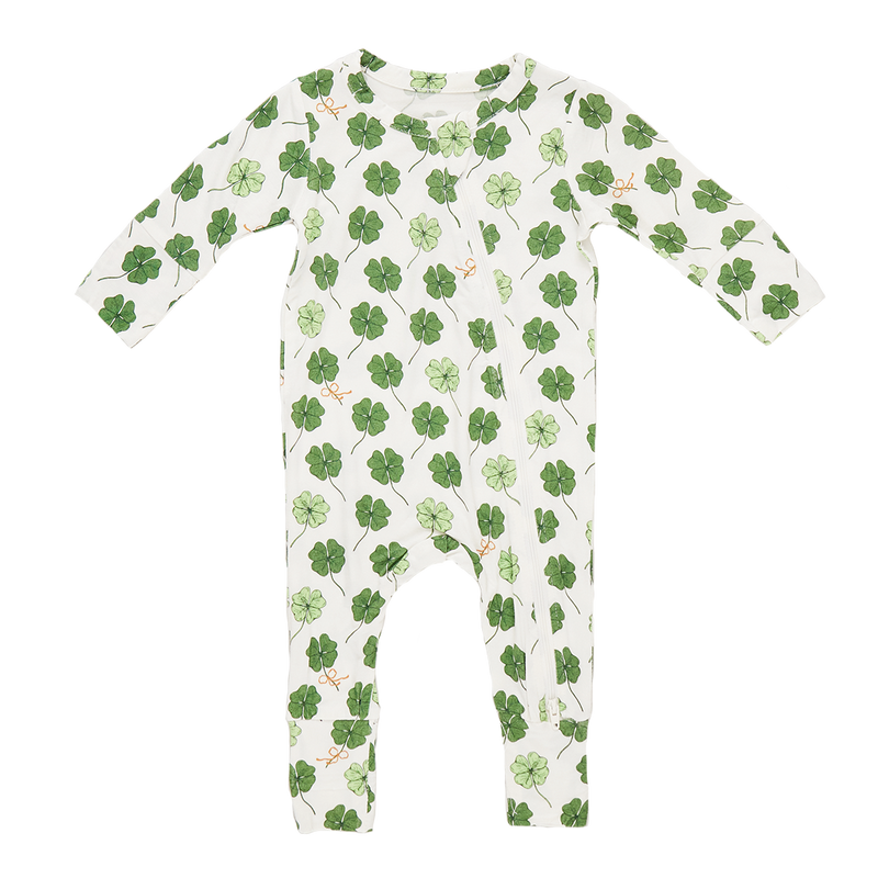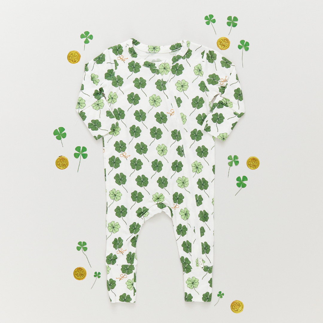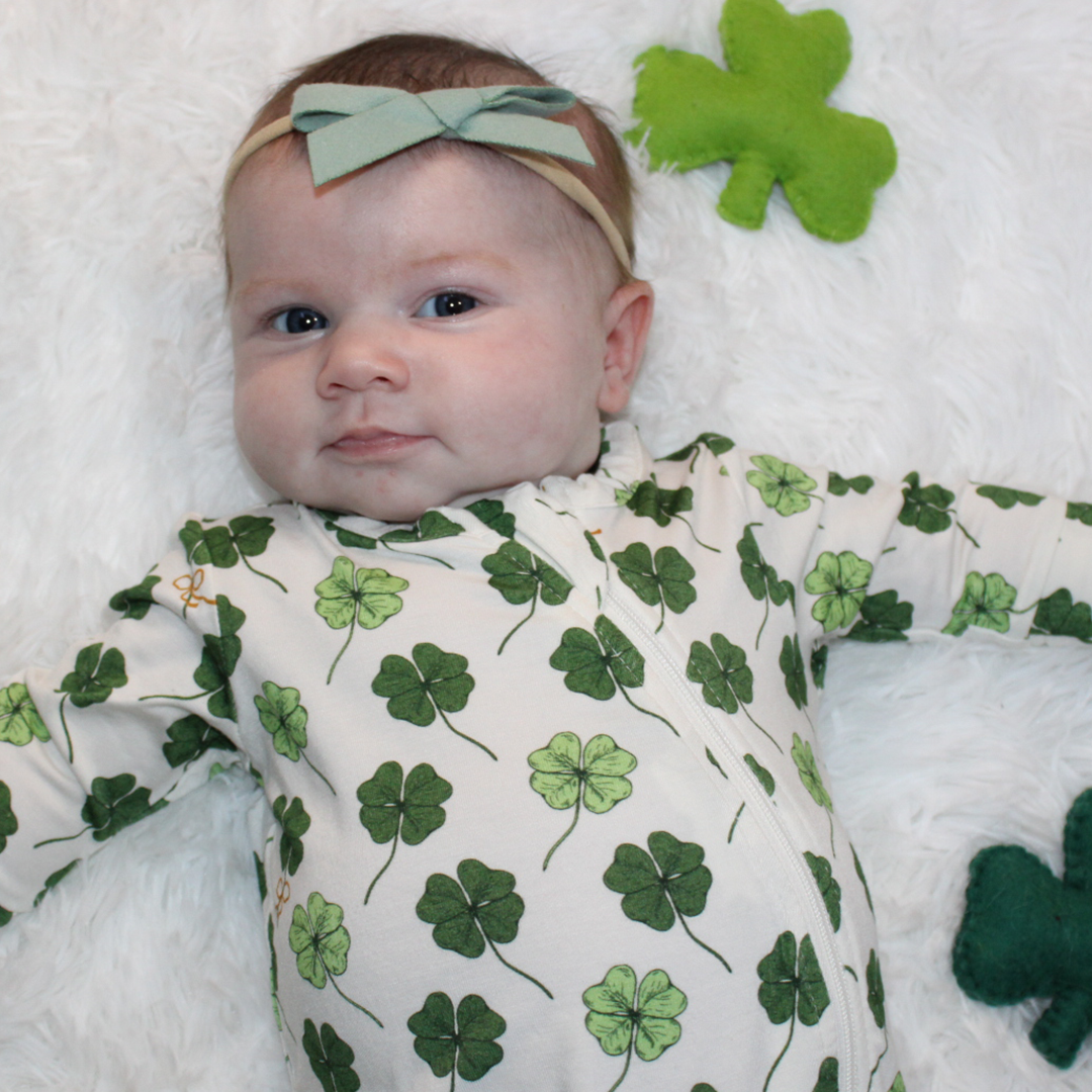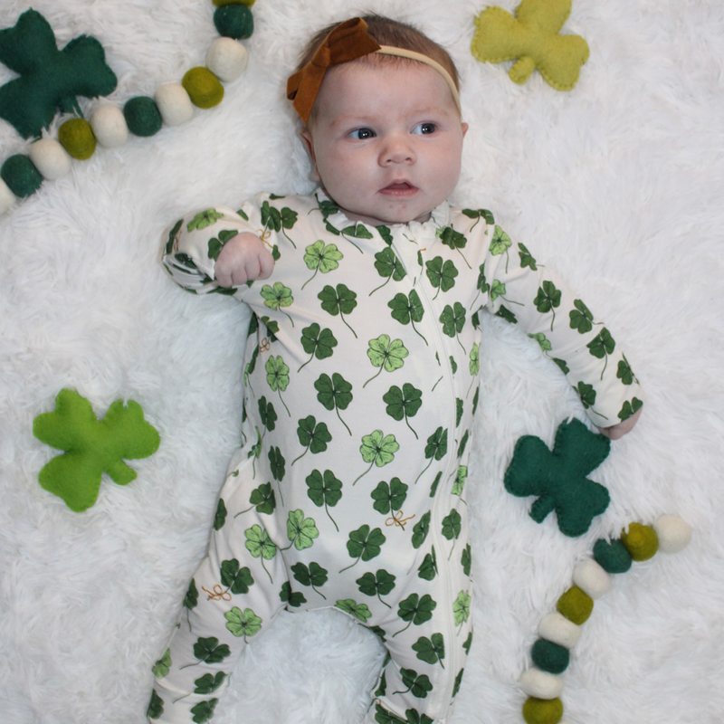 Introducing our first ever Baby's Firsts Collection! Celebrate the good times - month by month, size by size! Adorably festive onesies for a year’s worth of memorable firsts. Shown here in our Shamrock Sweetness print, perfect for a first St. Patrick's Day. Crafted in bamboo fabric, these rompers are crazy soft with a smooth, silk-like texture. Bamboo is breathable and it keeps littles cool & comfortable in the summer and warm & cozy in the winter.