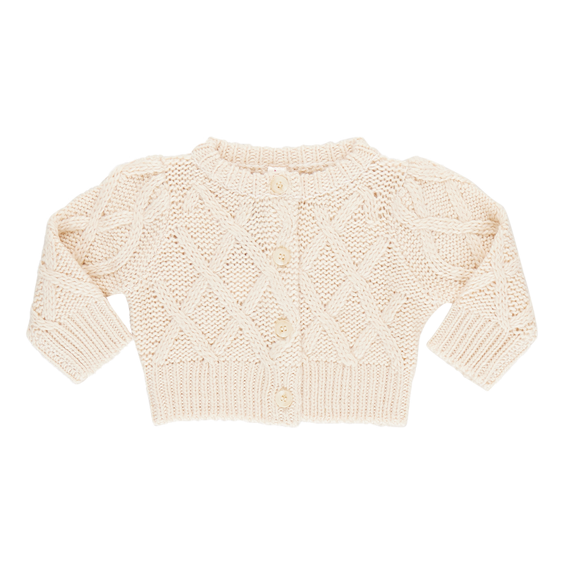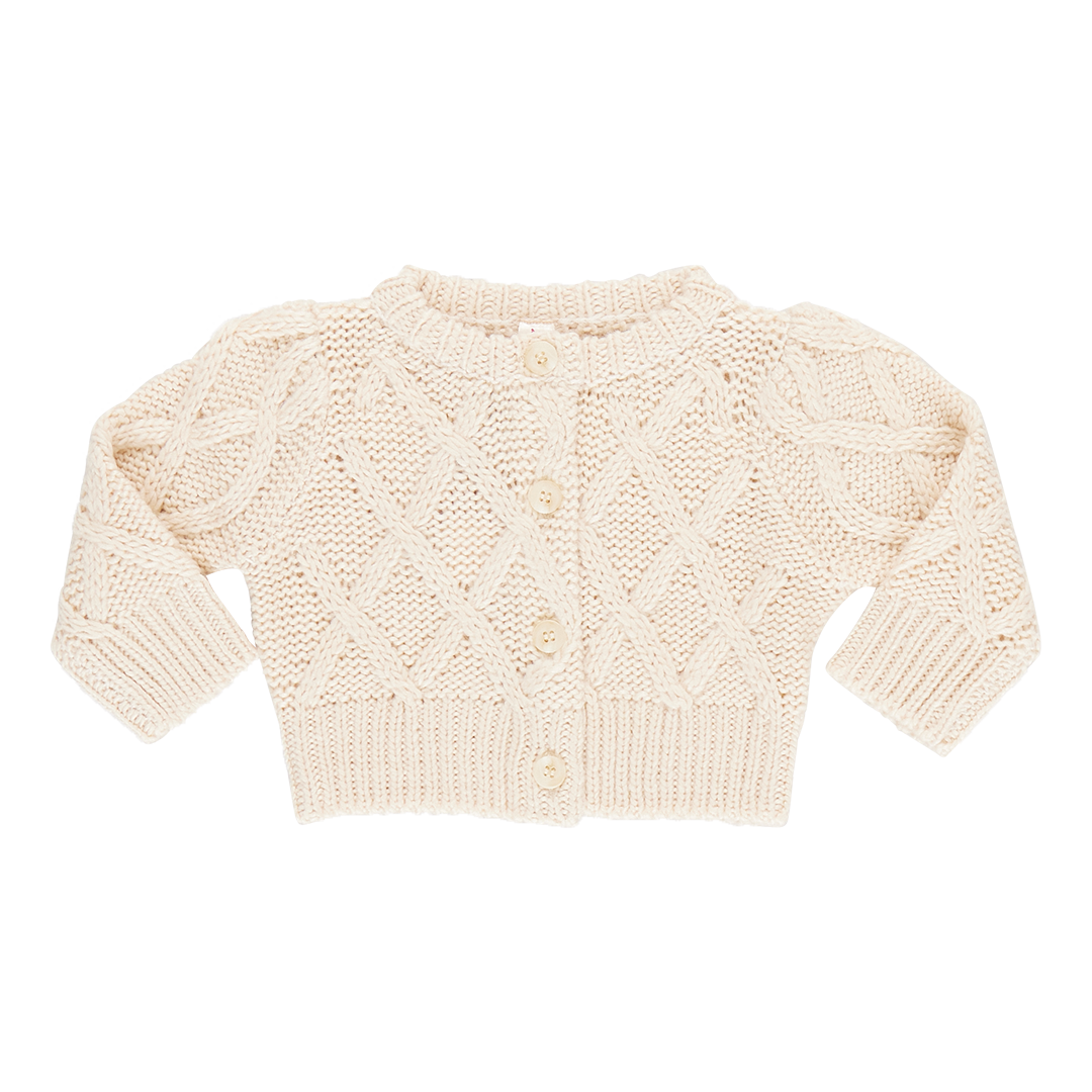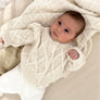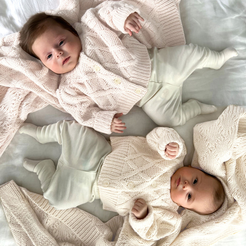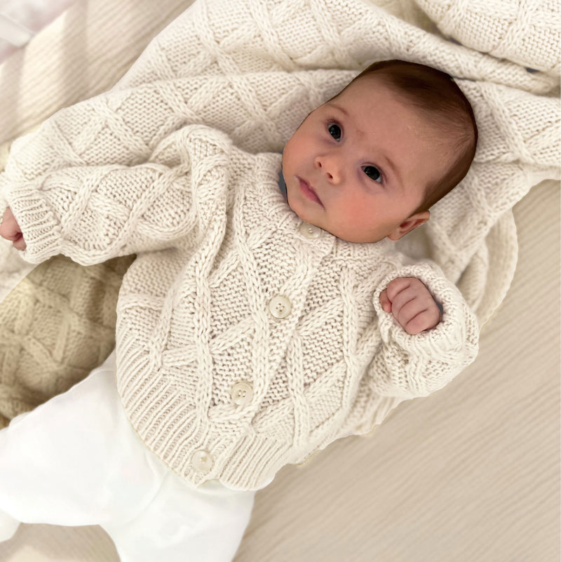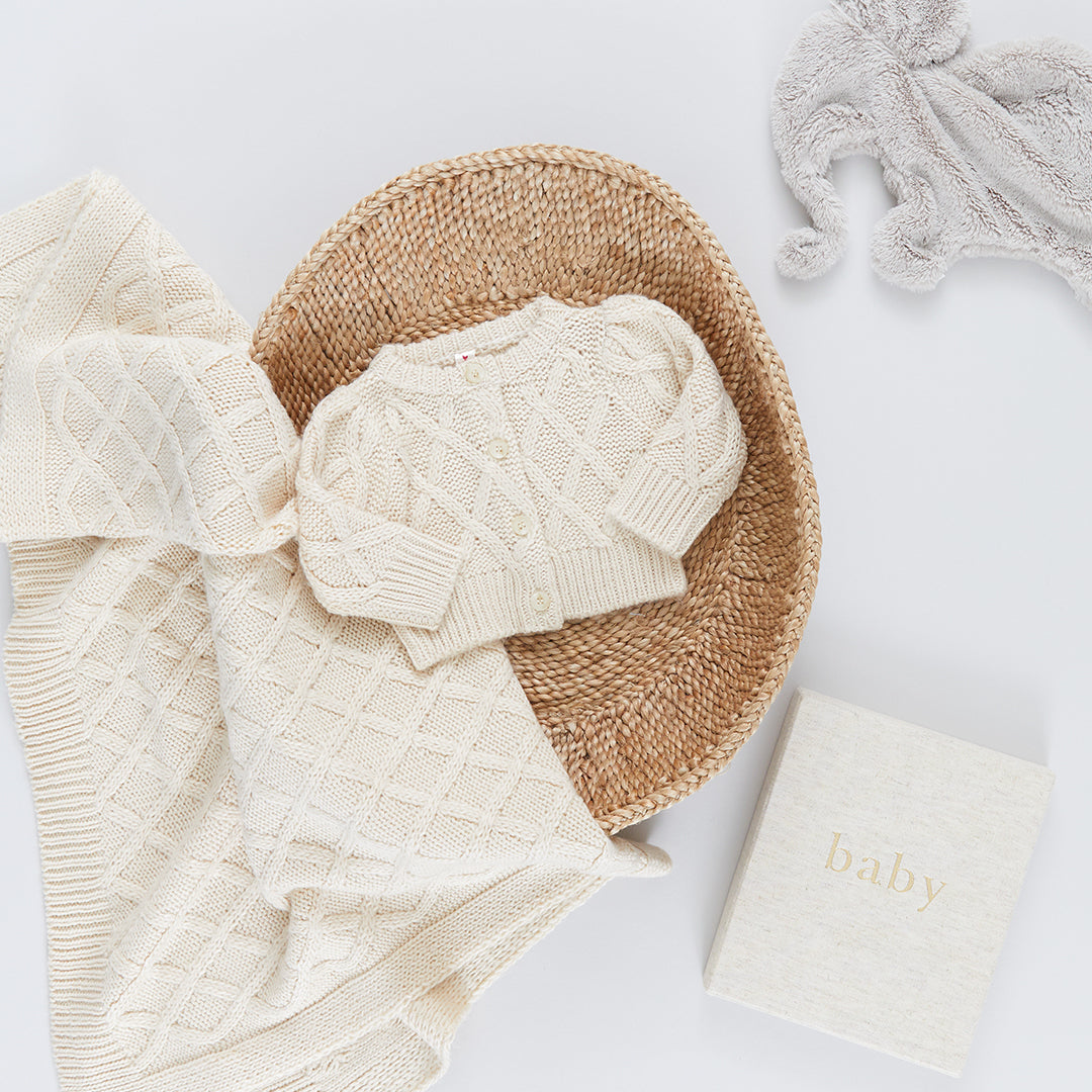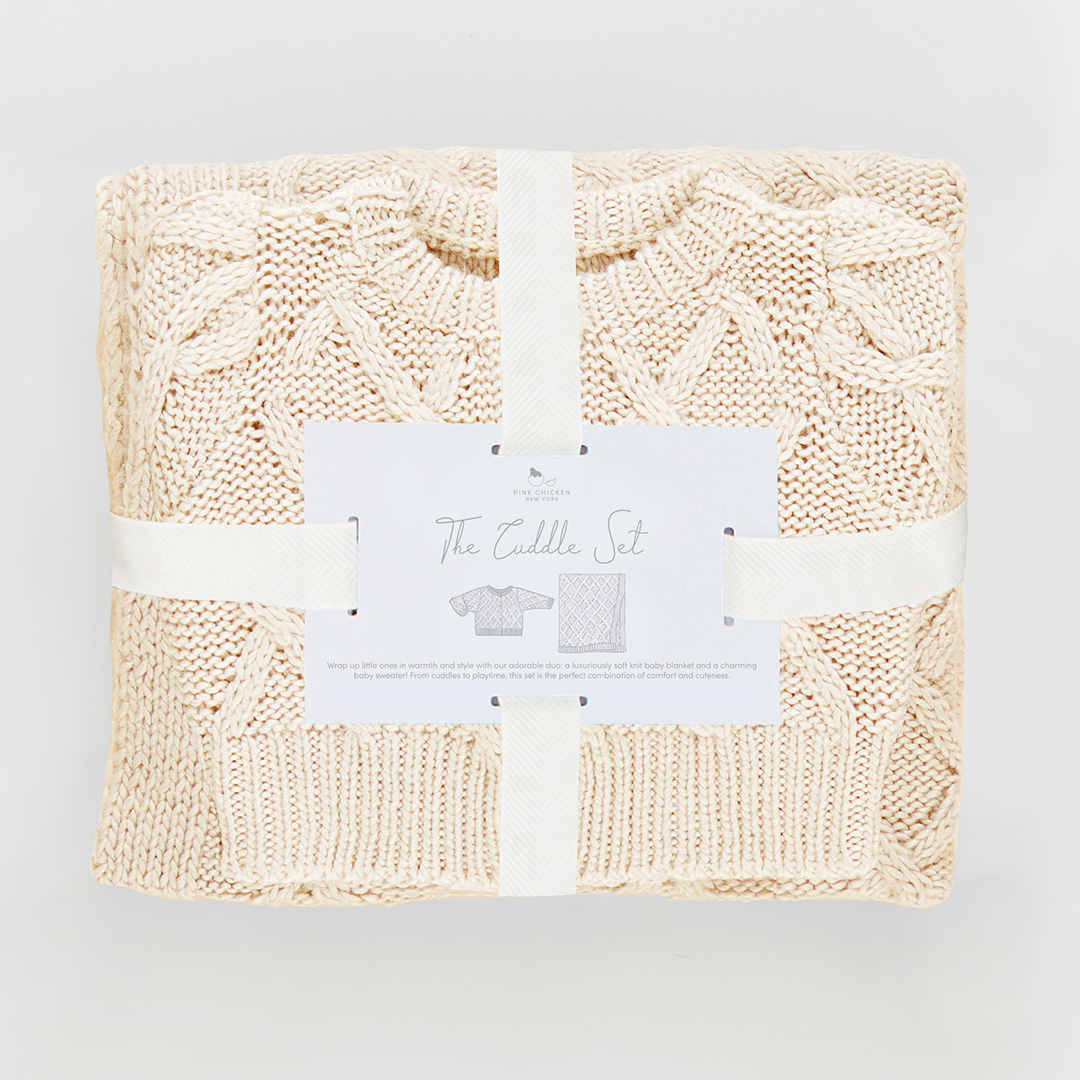 Gifting Made Easy! Chunky cables crisscross our Baby Cuddle Blanket and Sweater Set, the newest addition to our Baby Gifting Collection. Tied together with a sweet ribbon, this soft and cozy duo is poised to become a winter wardrobe staple. The classic cable knit cardigan features a faux tortoise button closure and ribbed cuffs and waist while the matching blanket is perfect for snuggling. Available in Pale Pink, Cream and Gray in one size that fits from newborn to 6 months.