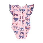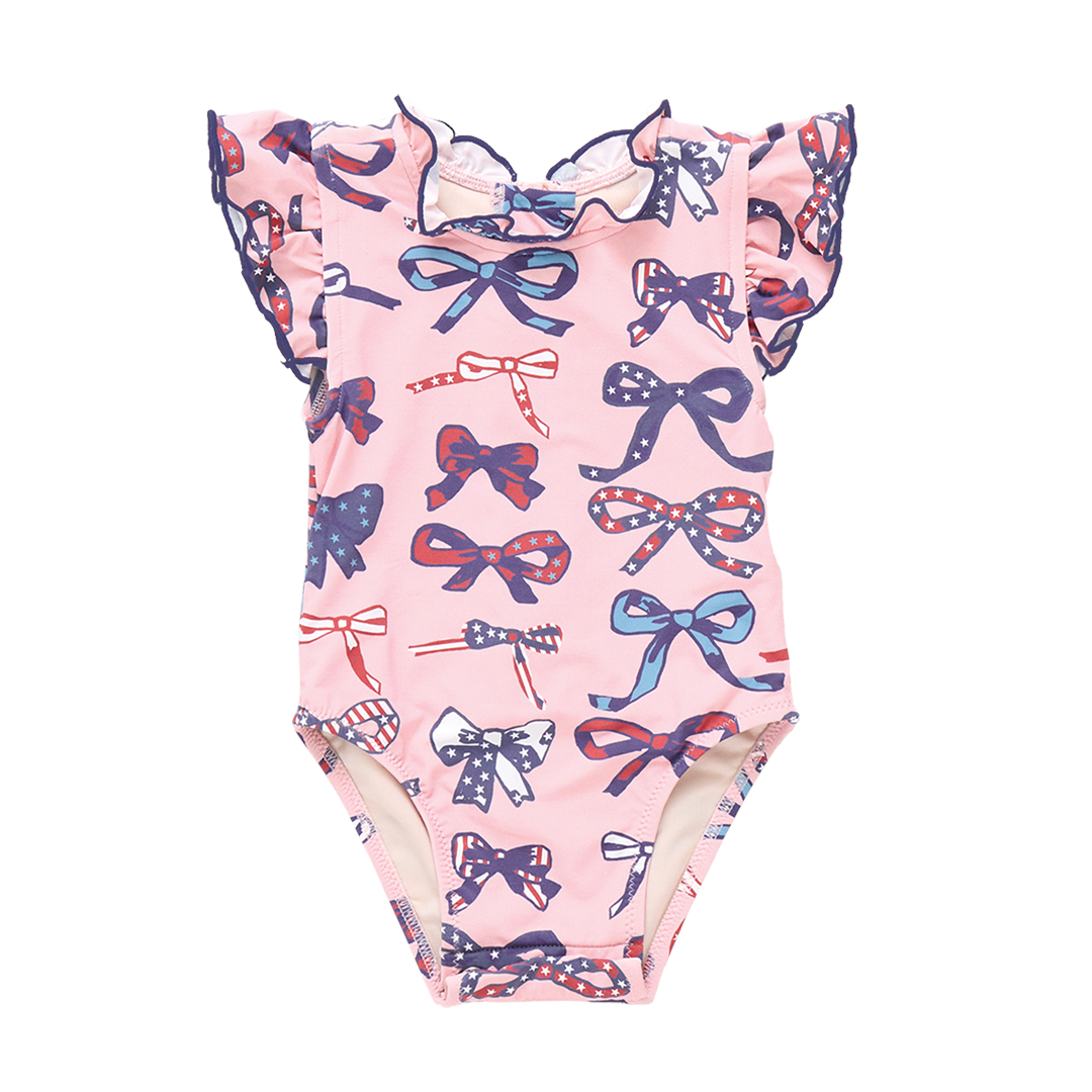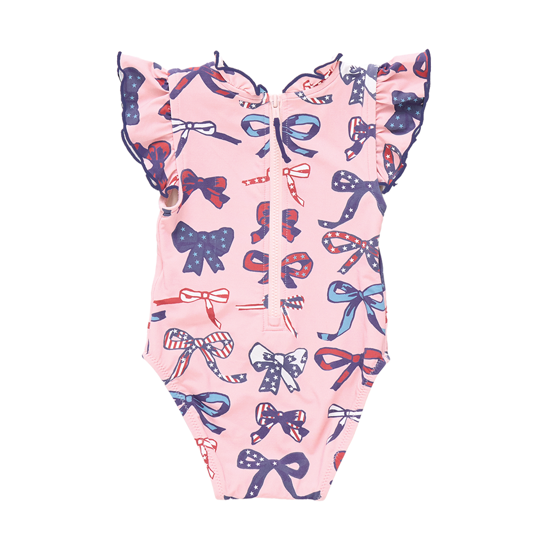 Summer Splash! An array of perfectly tied ribbons in shades of red, white and blue give a nod to the Stars and Stripes in our Pink Patriotic Bows conversation print shown here on our swan-dive-ready Baby Girls Jennifer Suit. Now crafted in a boosted 50+ SPF material, this delightful one-piece features a navy accented ruffle collar and sleeve. A 3/4 zipper closure at the back, with an easy to grab colored pull rounds out the look. Ring snap closure at the bottom allows for easy diapering. Twin with big sis in our Girls Jennifer Suit in Pink Patriotic Bows.