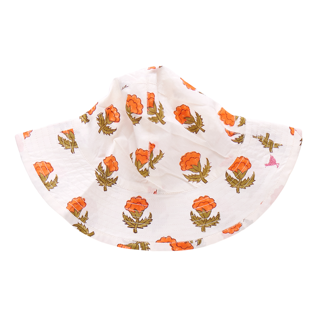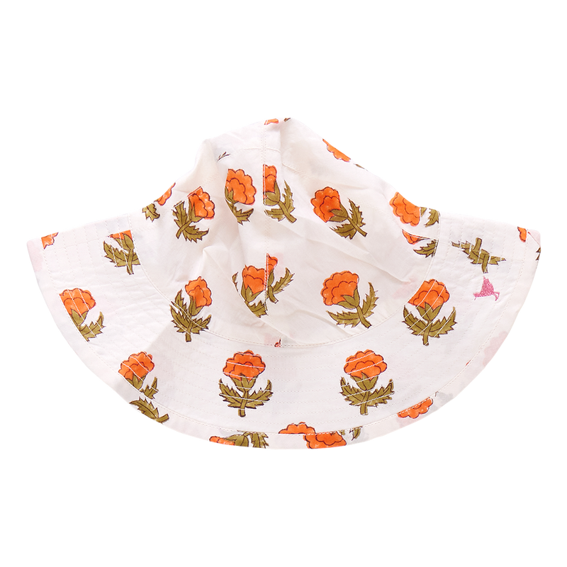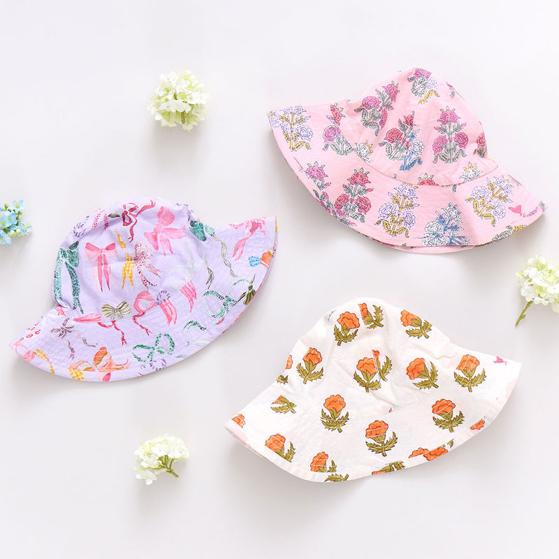Under Cover! Keep your little one's perfect face protected from the sun in our exceedingly adorable Baby Girls Sun Hat. Available in Lavender Watercolor Bows, Small Orange Bud and Small Pink Flowerette.