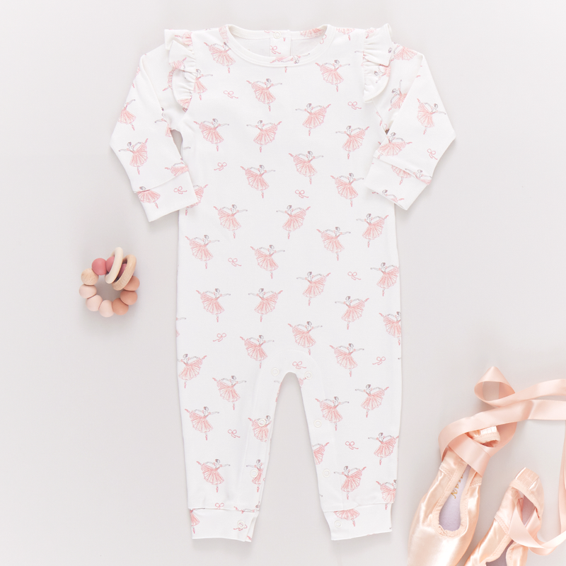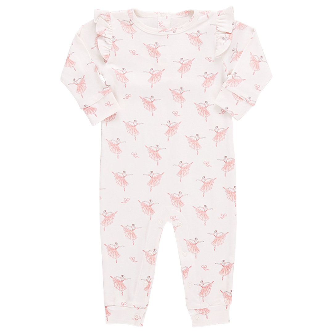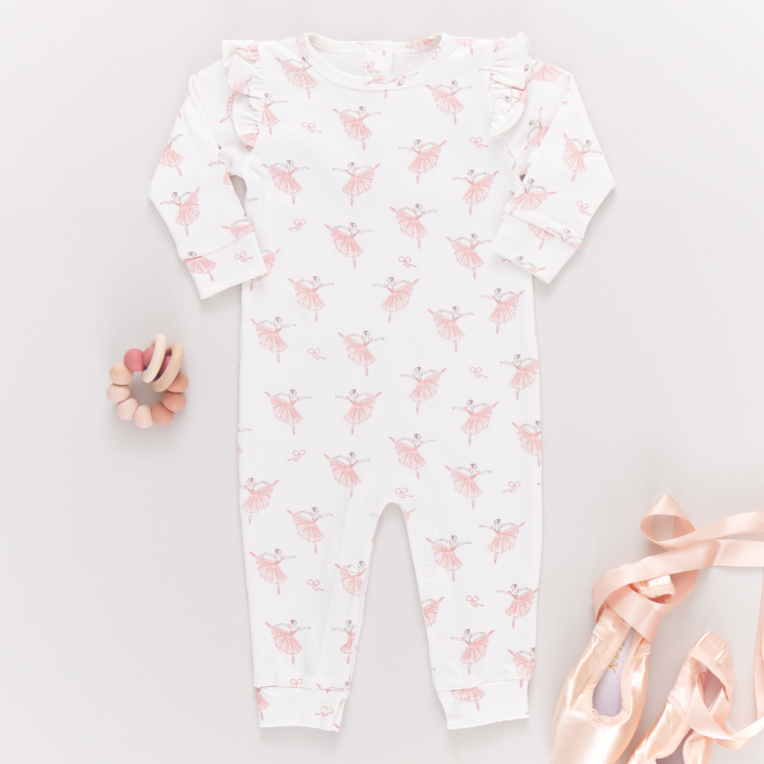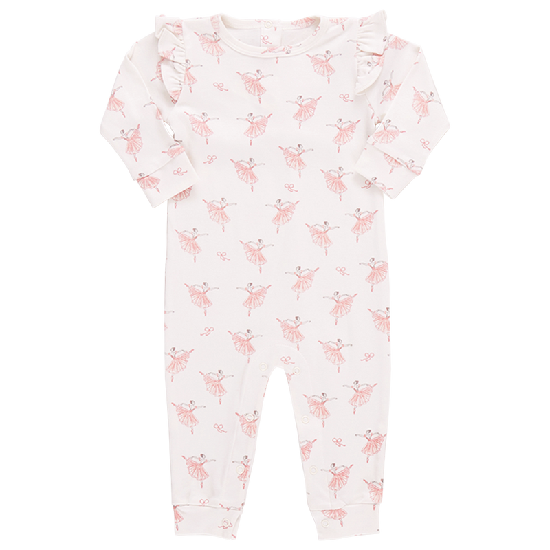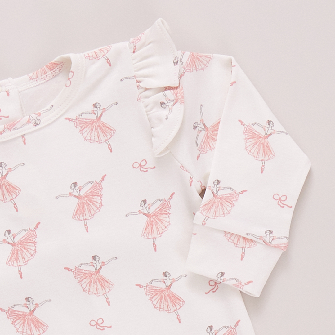 Pretty on Pointe! Delicate dancers leap across a creamy ground on our super cozy Baby Organic Ruffle Romper. Crafted in our new 100% Organic Pima Cotton, this long sleeve romper features a delightful ruffle at the shoulder and a ring snap closure at the leg for easy diaper changes.