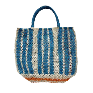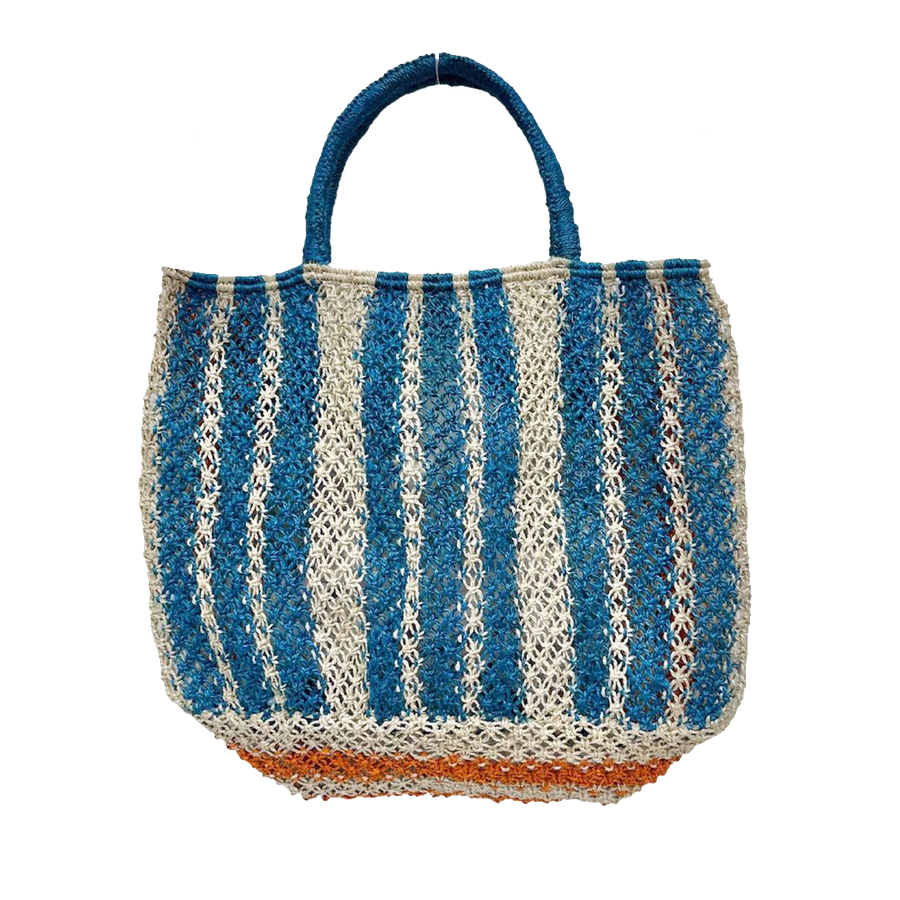 Handcrafted from 100% natural jute, this beautifully woven tote brings effortless charm to every day. Its vibrant blue-and-cream stripes add a coastal touch, while its roomy, lightweight design makes it perfect for market strolls, beach days, or everyday adventures.