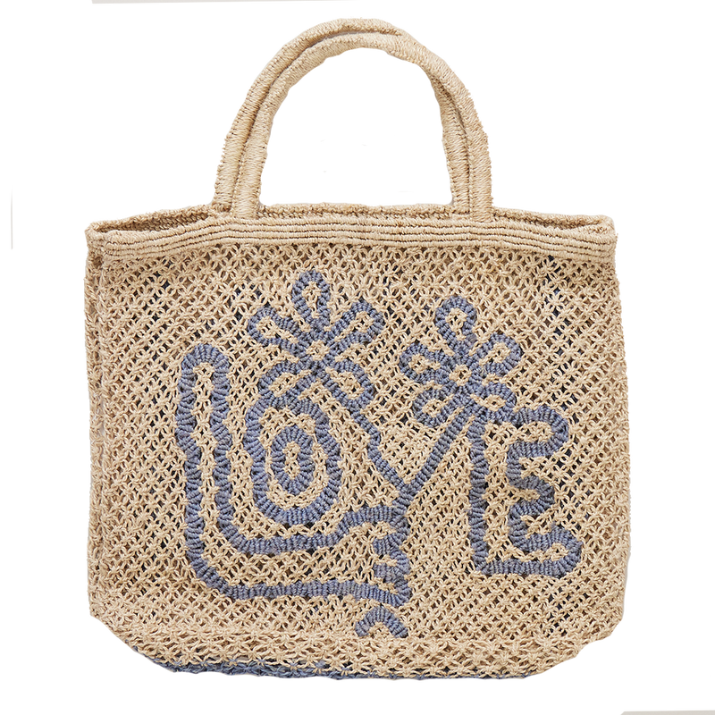 Effortlessly chic and full of heart, this handwoven jute tote brings artistry and meaning to every day. The natural base and soft pebble-blue design form a whimsical “LOVE” motif, a reminder to carry joy wherever you go.
