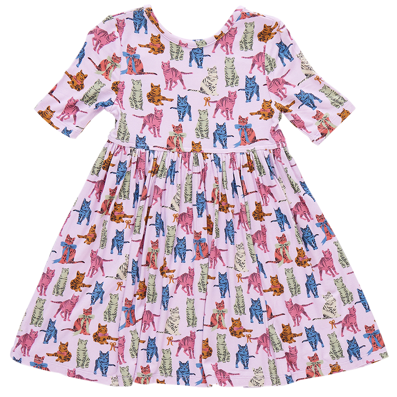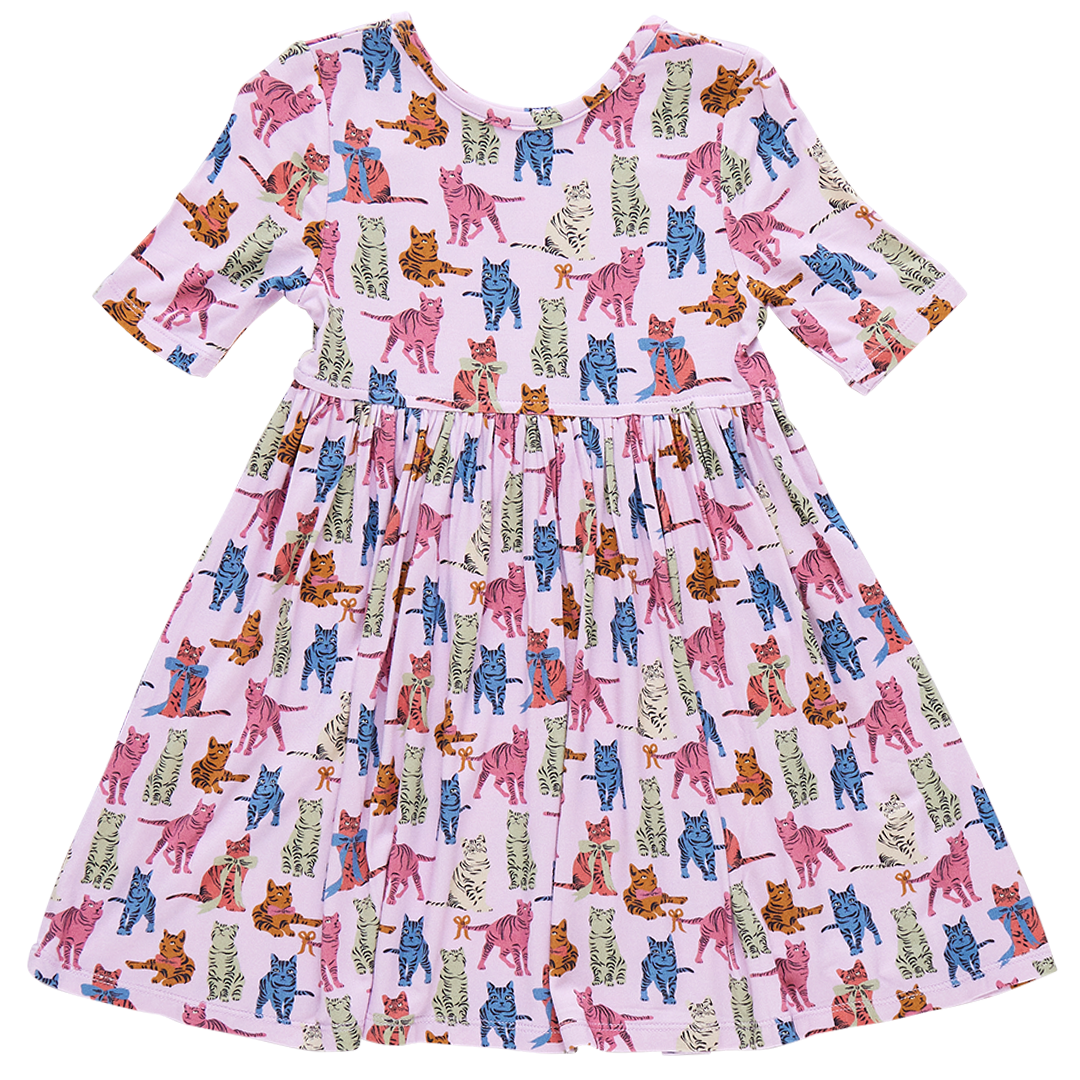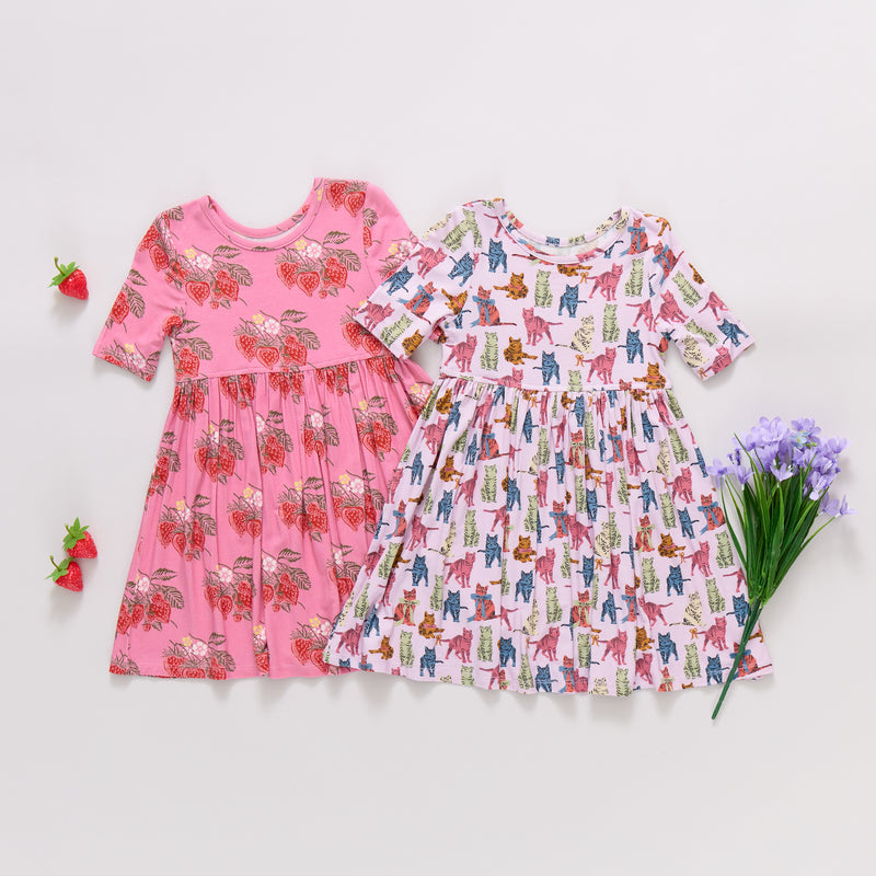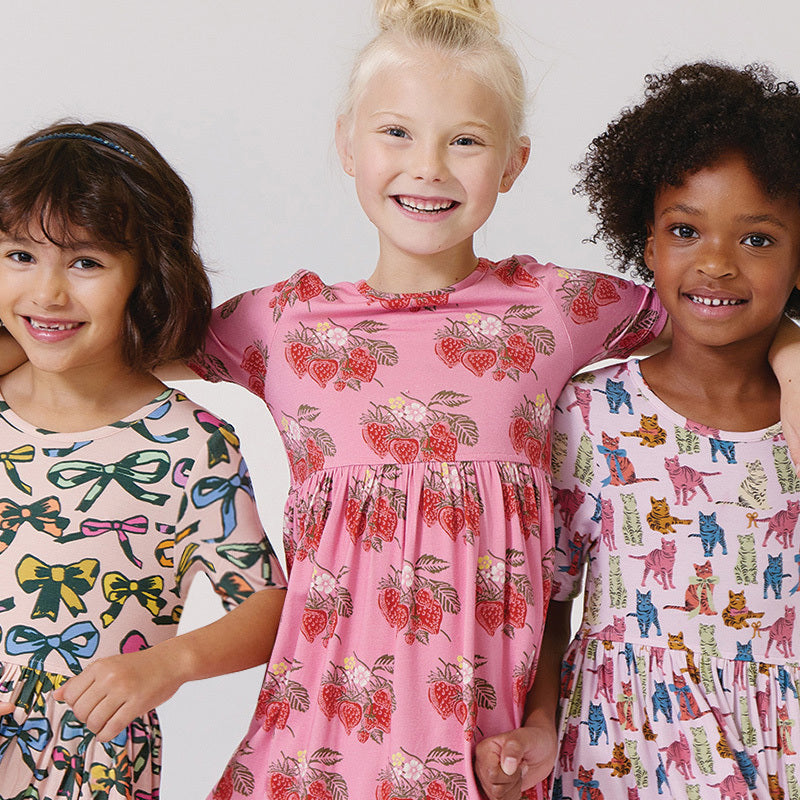Pattern Party! Our much loved Girls Bamboo Steph Dress is bursting with exciting new prints for Spring. This Pink Chicken classic is adored for its super swingy fully gathered skirt and skinny sleeve that hits right above the elbow. Our soft and silky bamboo fabric is best known for its breathability and it keeps littles cool & comfortable in the early fall months (and warm & cozy in the winter!) Available in Pink Wild Strawberries, Multi Bows and Tabby Cats.