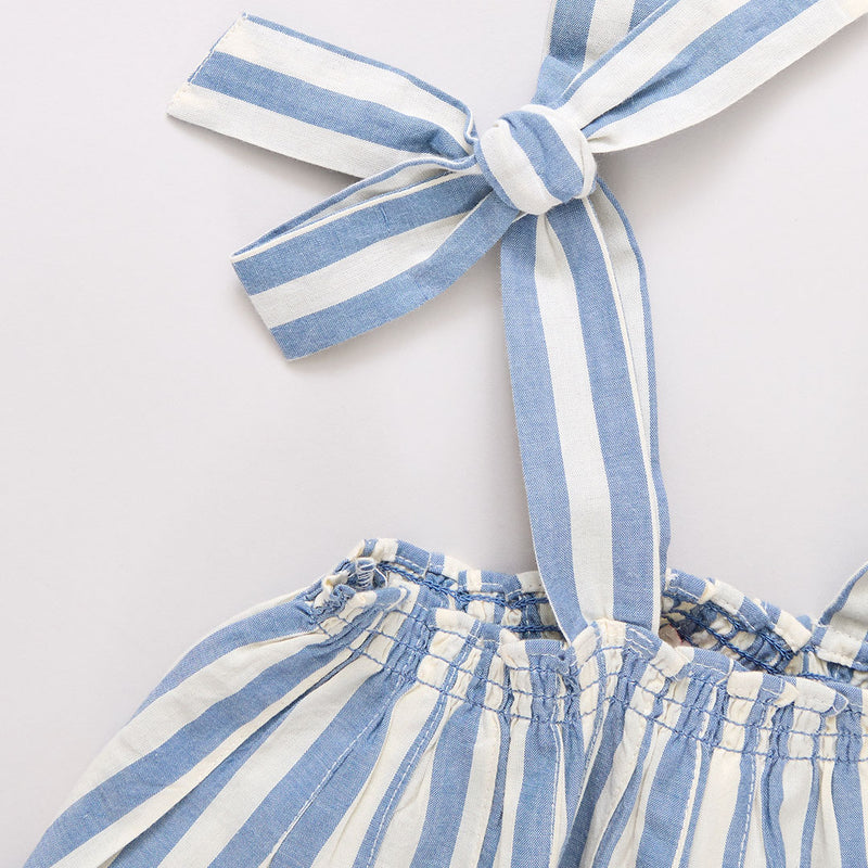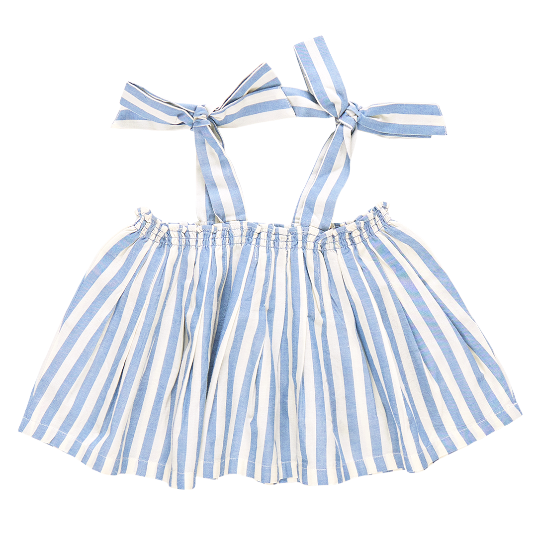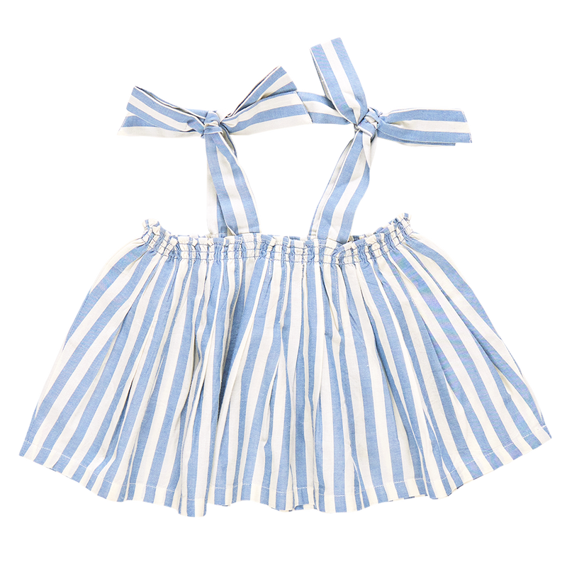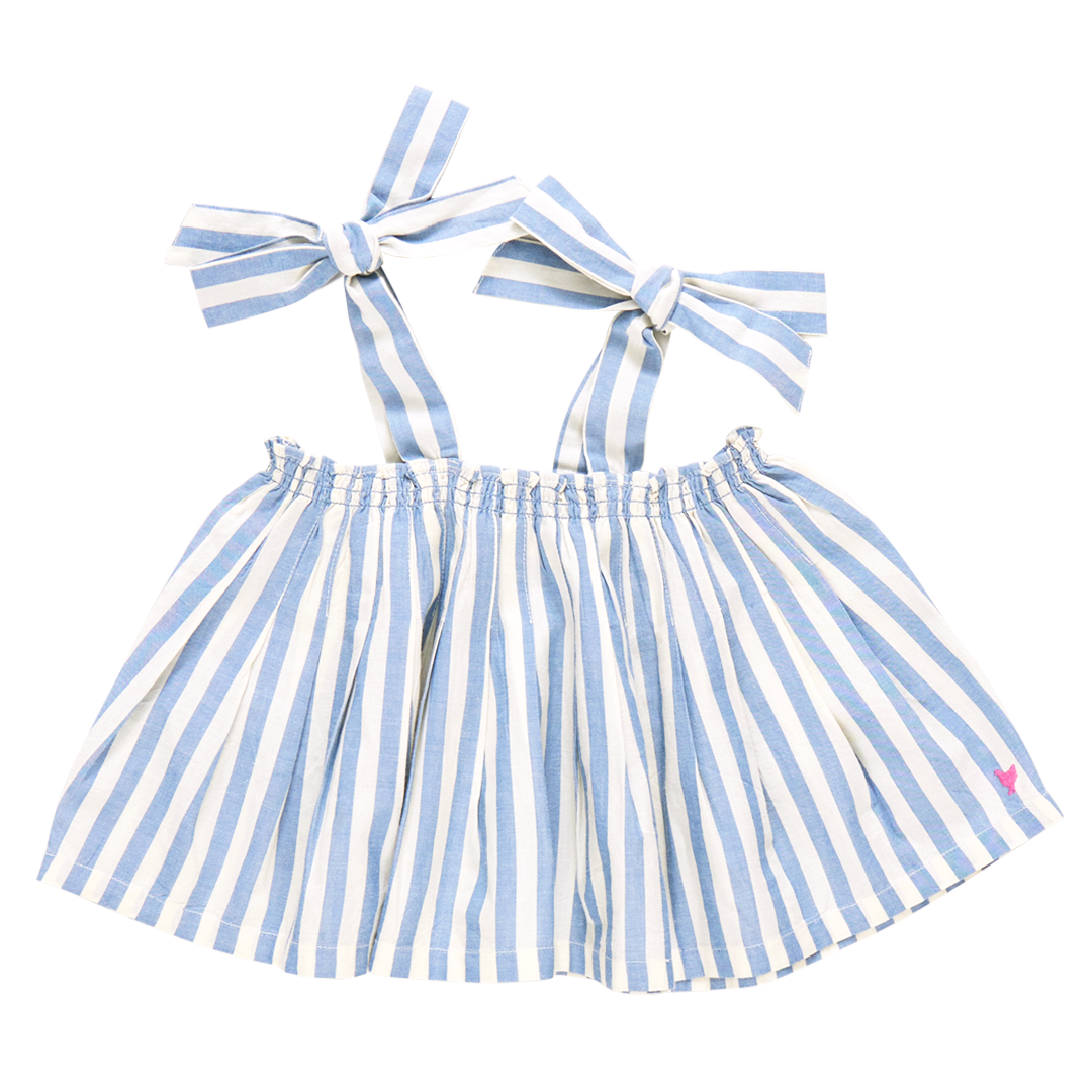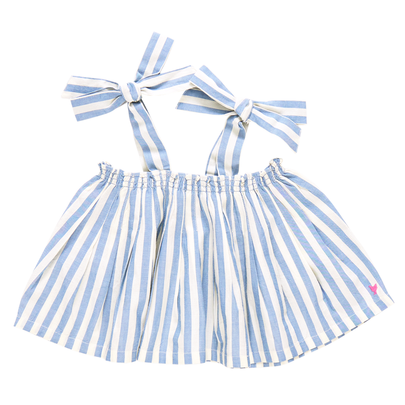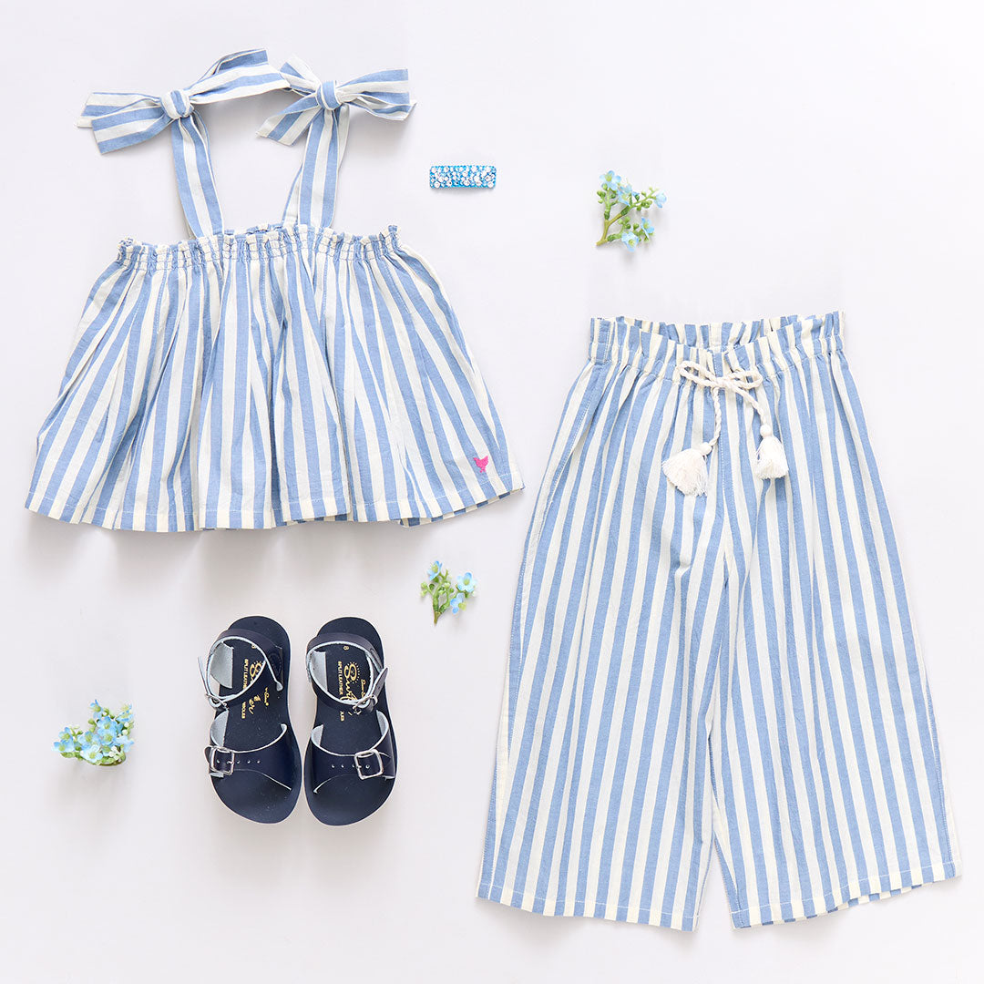 Solid In Stripes! A classic blue and white color combination wins every time and our Girls Casey Top in Blue Stripe is no exception. Adjustable tie straps and an elastic neckline allow your stylish chick to grow with this breezy piece. Pair with our Girls Theodore Pant for an extra chic look fit for a stroll along the boardwalk. You'll find Blue Stripe throughout the Spring Collection allowing for many matching Family moments.