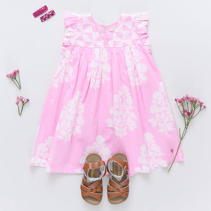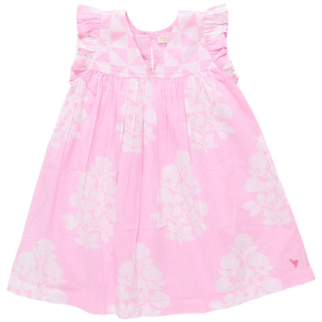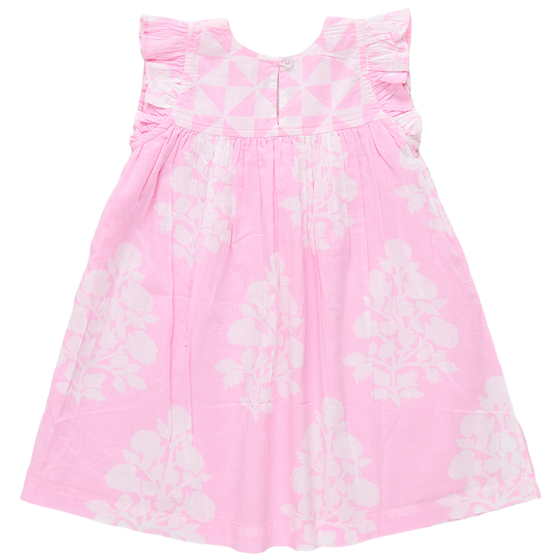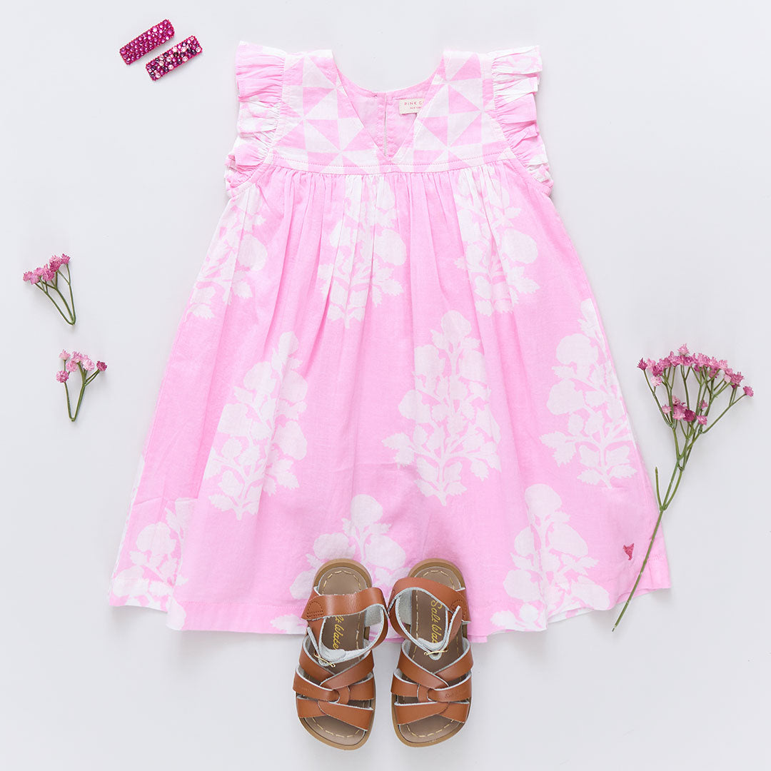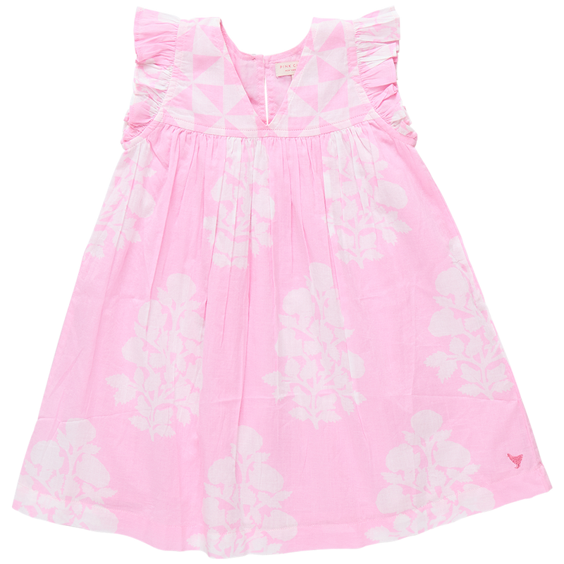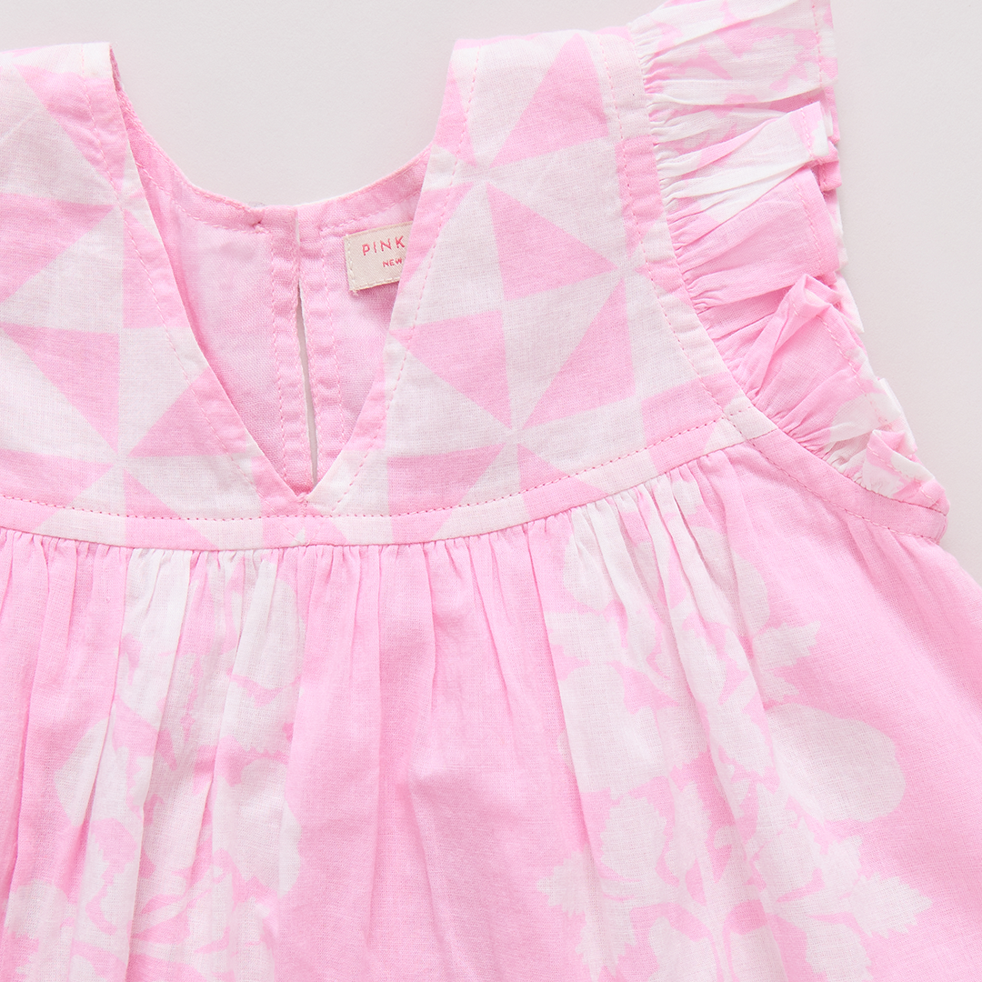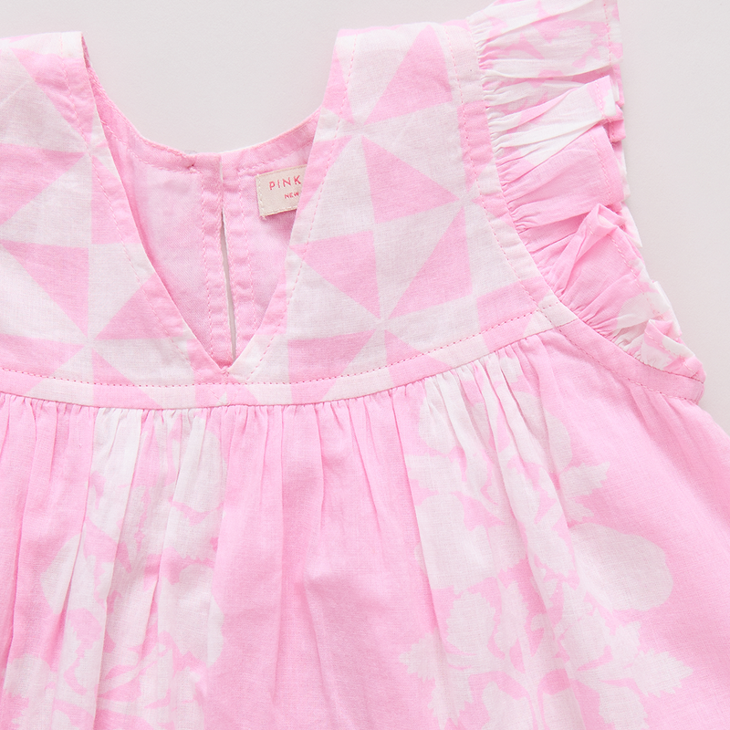 Mix and Match! Our Girls Courtney Dress mixes our graphic triangle check at the chest with a lush oversized floral on the body to make a fun and festive summer statement. This perfect A-line silhouette features a small ruffle at the sleeve, a subtle v-neck and a glitter button keyhole closure at the back. Made for the backyard party circuit, this dress plays a mean game of musical chairs, pin the tail on the donkey and always wins at tug-o-war. Available in Blue Oversized Dandelion and Pink Bouquet Floral.