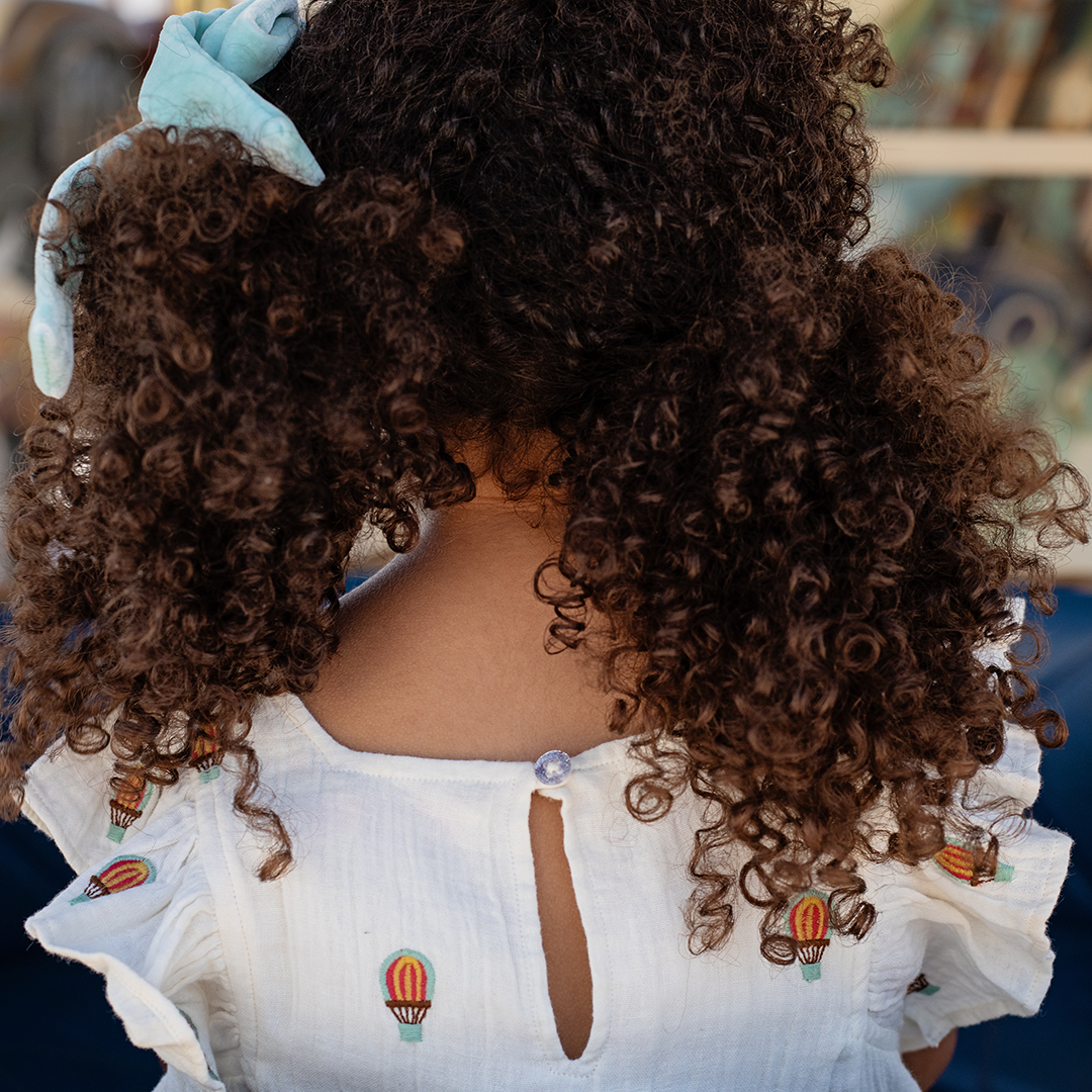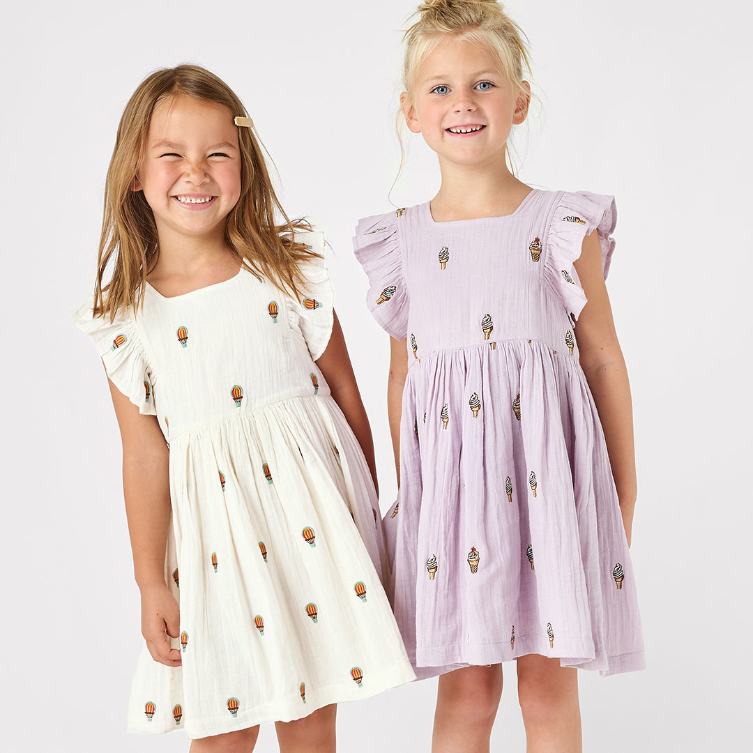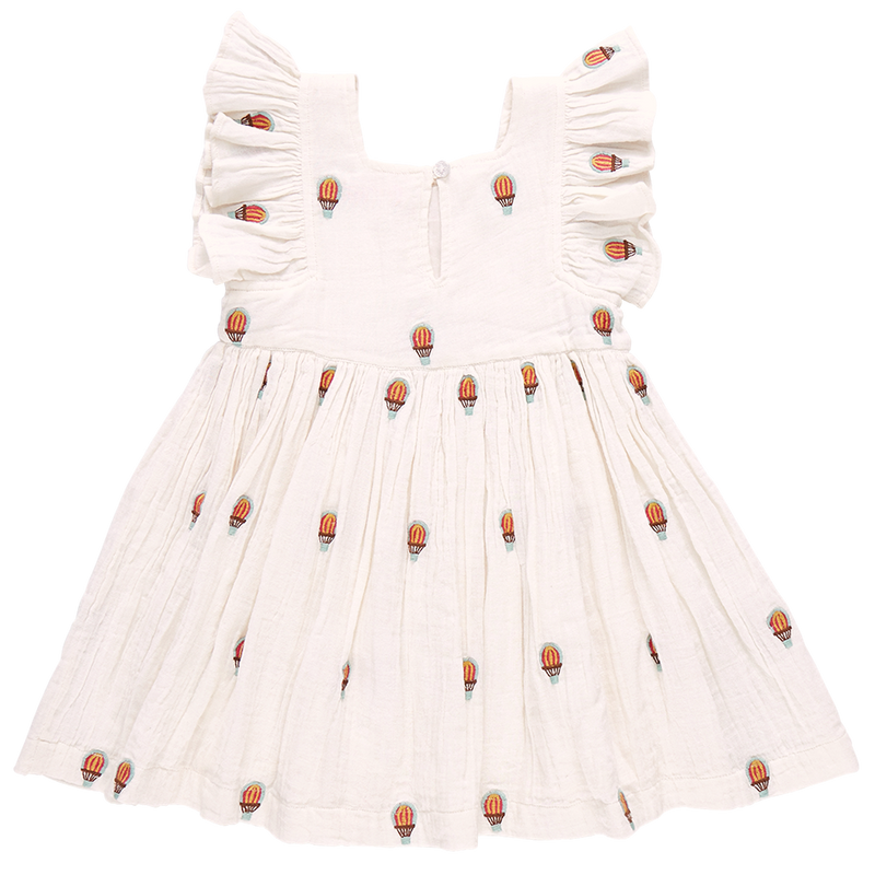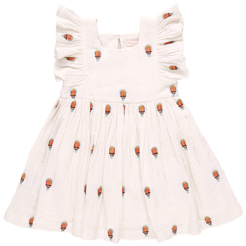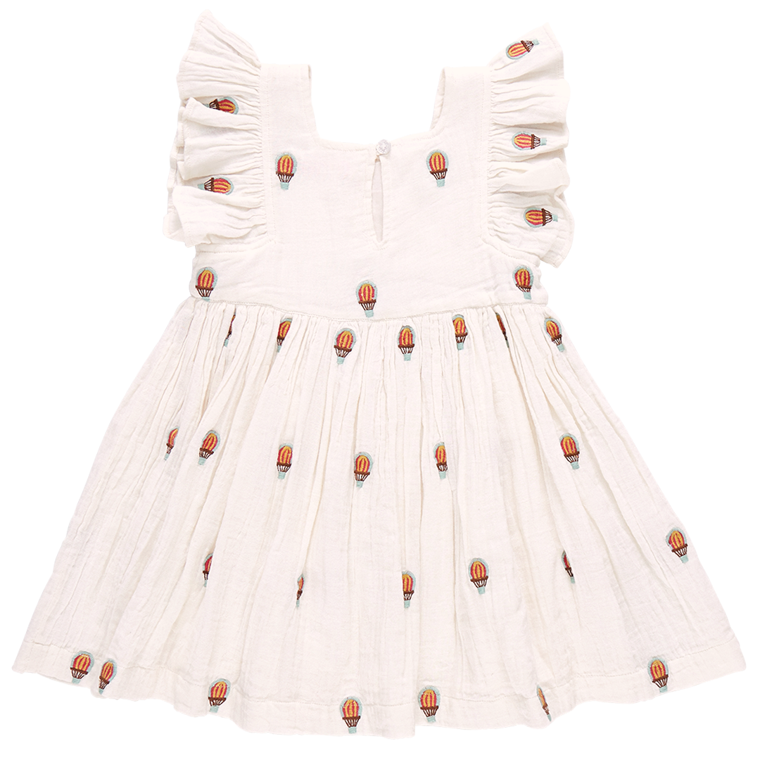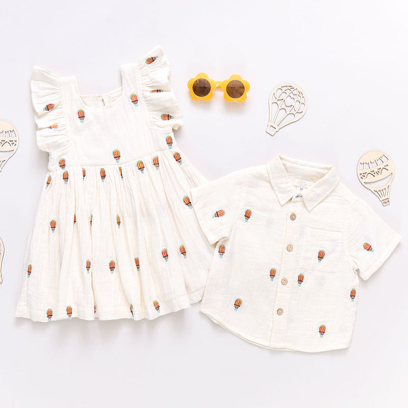Up Up And Away! Colorful embroidered Hot Air Balloons soar above the clouds on our flock favorite Girls Elsie Dress. Designer details include a square neckline, soft ruffle sleeve and fully gathered skirt. You'll find our signature glitter button closure at the back. Crafted in a soft and fresh 100% cotton double cloth gauze for Spring this piece pairs perfectly with a sneaker for school days and backyard games. Match back to Big and Little Sis in our 2-Piece Roey Sets. Love our Elsie Dress? Click here to shop more prints!