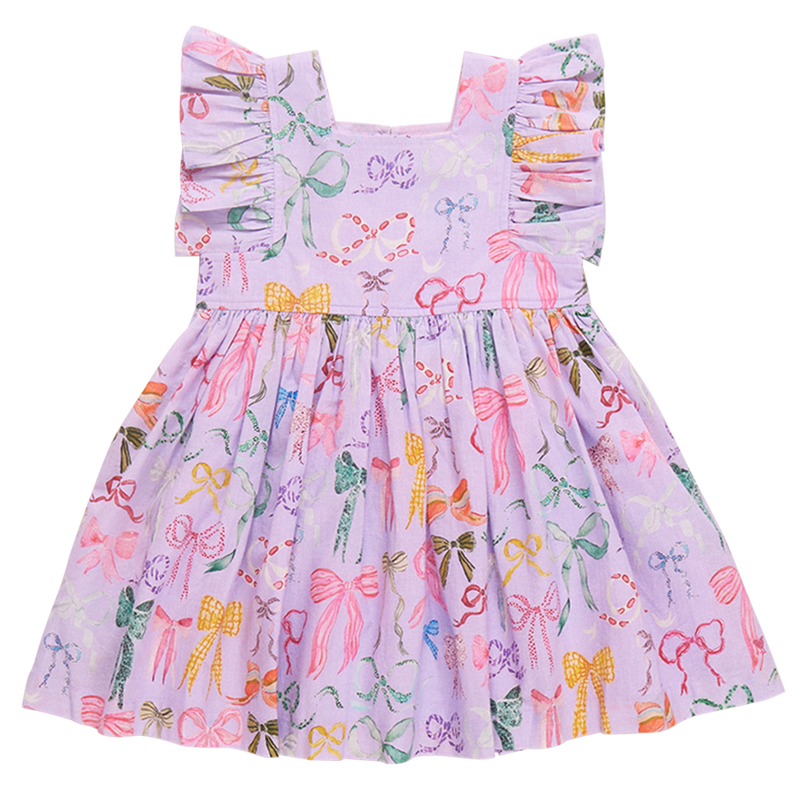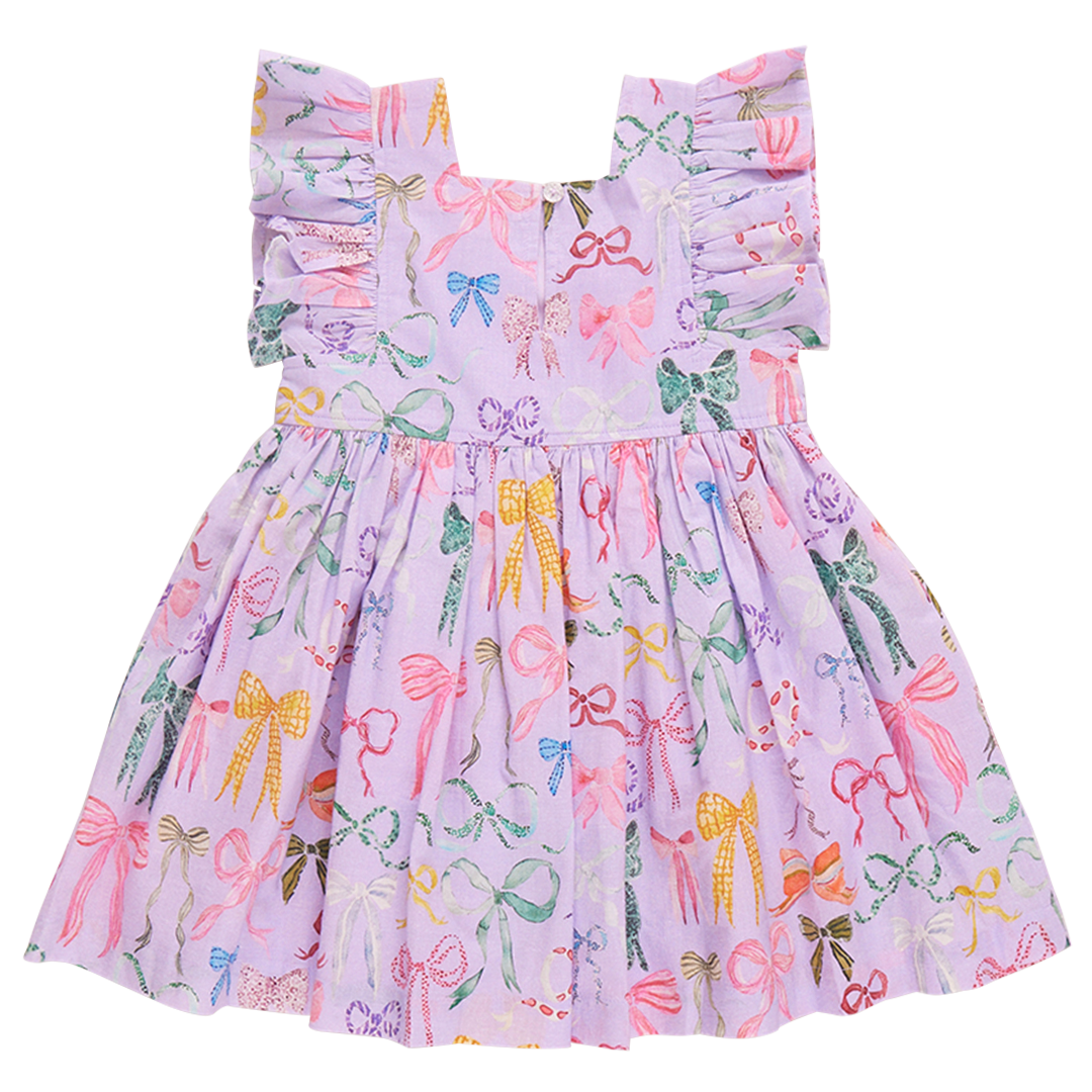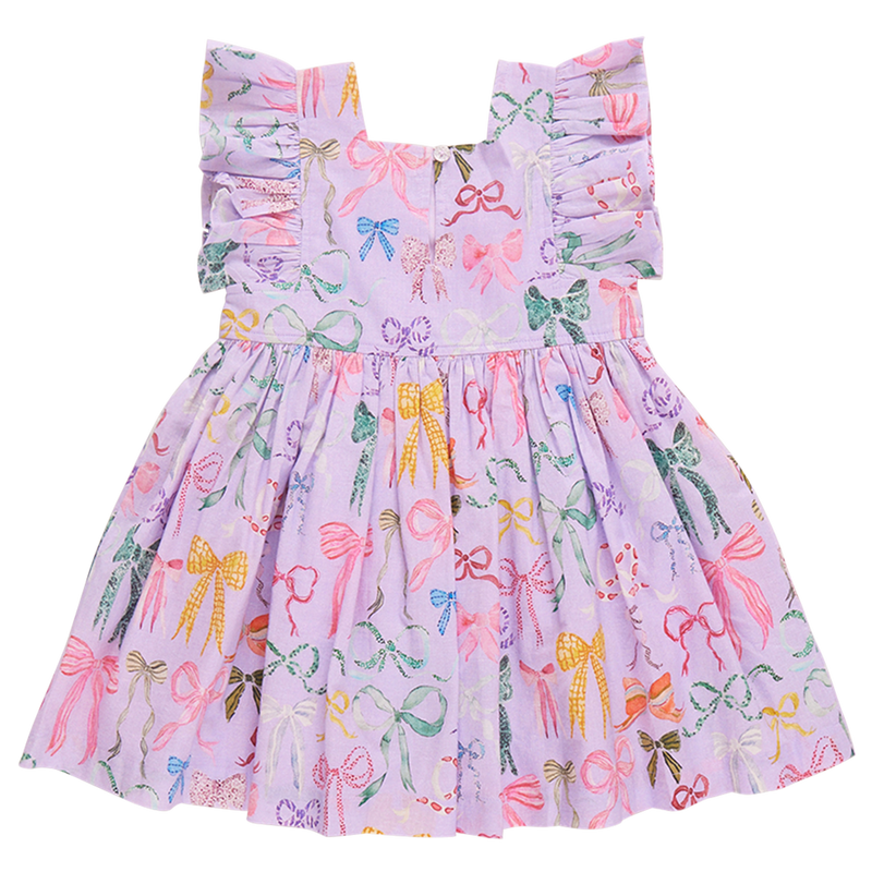 A Bounty Of Bows! A colorful array of ribbons and bows, courtesy of one of our favorite artists Tara Roma Gill, comes to life against a light purple canvas in her lively Lavender Watercolor Bows, shown here on our flock favorite Girls Elsie Dress. Designer details include a square neckline, soft ruffle sleeve and fully gathered skirt. You'll find our signature glitter button closure at the back. Match back to Sister in our Girls Eleven Jumper and Baby Girls Jaipur 2-piece Set. Love our Elsie Dress? Click here to shop more prints!
