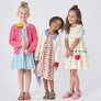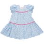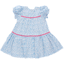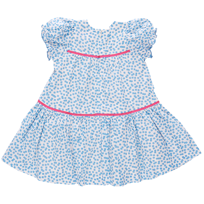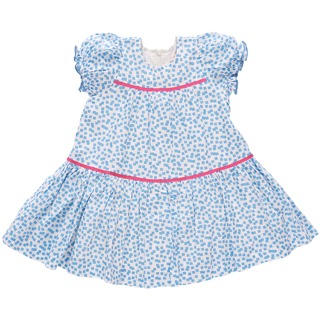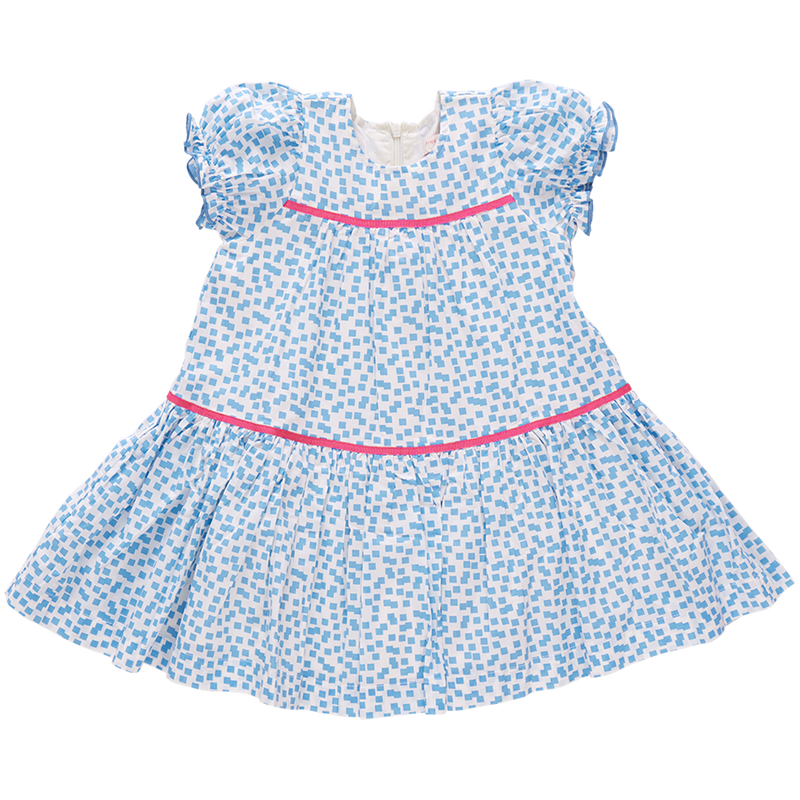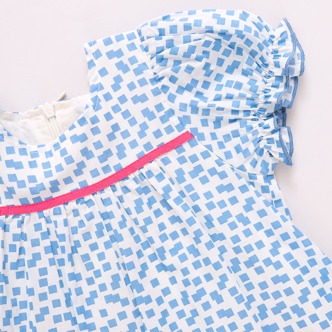 Party Ready! Our delicate Blue Mini Squares ditsy print feels like a confetti party on our absolutely ready for fun Girls Fiona Dress. A short puff sleeve with a tiny blue tipped ruffle, pink velvet taping along the chest and skirt and a super swingy silhouette all add up to make a very festive frock.