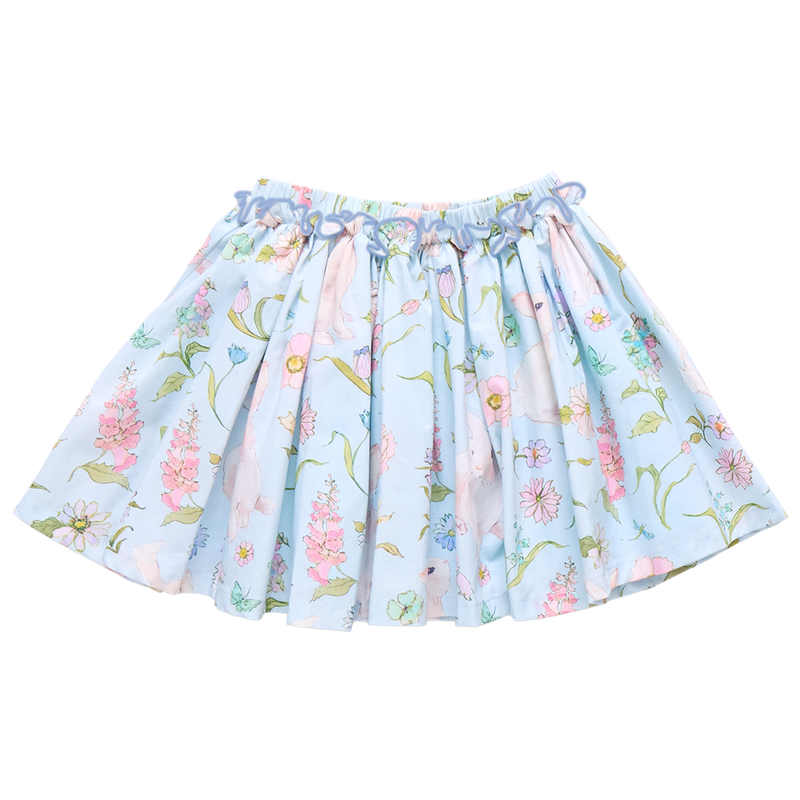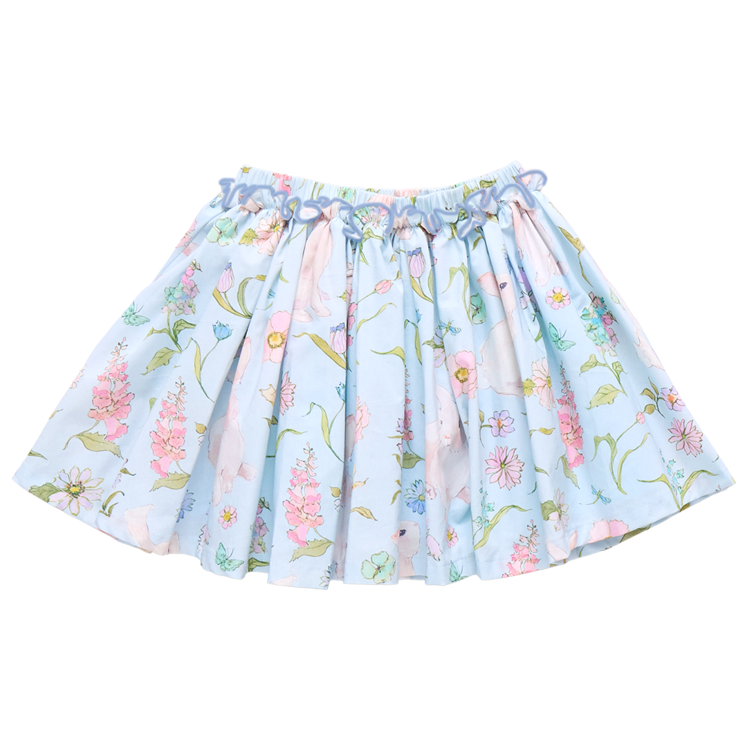 Garden Of Delights! Celebrate the artistry of Inslee Fariss, brought to life through her signature watercolor style! Curious rabbits explore a pastel field of wildflowers in our Botanical Bunnies print shown here on our collection classic Girls Gianna Skirt. A pattern on pattern ruffle at the elastic waist highlights this extra swingy, fully gathered skirt. Wear with our Girls Constance Sweater for a sweet Easter look. Match back to Little Sister in our Baby Girls Brooke Dress Set and Big Sis in our Girls Brooke Dress in Botanical Bunnies.