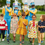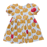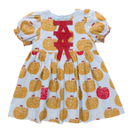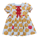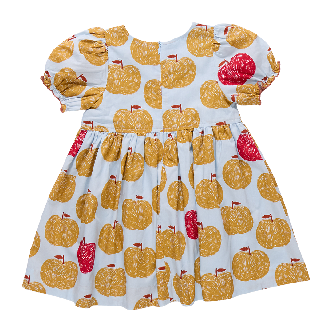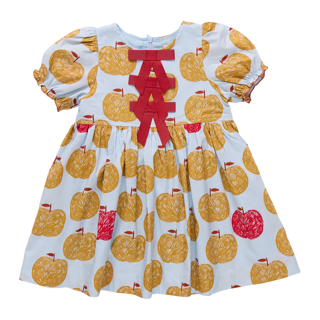 An Apple A Day! A peck of golden delicious apples, and a red delicious guest apperance, float on a crisp sky blue 100% cotton poplin ground in our extra special Girls Hermione Dress crafted in our fresh for Fall Gold Apples print. This sweet silhouette is adorned with candy apple ruffled trim at the gathered puff sleeve and a trio of eye-catching red grosgrain ribbon bow accents at the chest. This delightful dress may be your first choice for picture day!! Invisible zipper closure at the back.