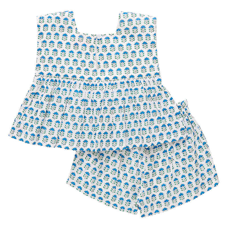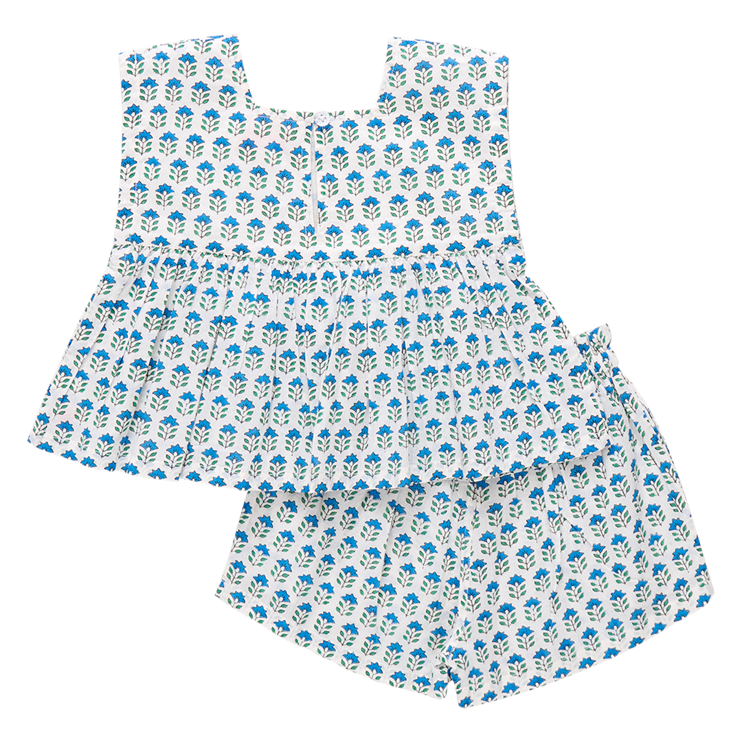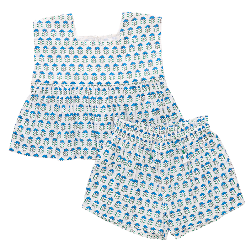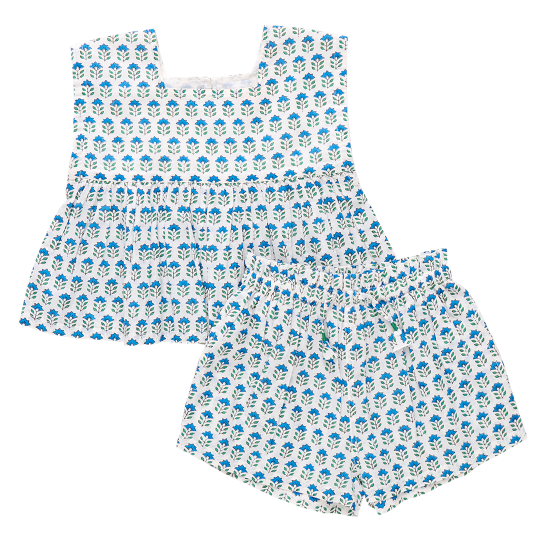 Shorts And Sweet! Our new-to-the-collection Girls Kamari 2-Piece Set adds an easy to wear elastic waist bottom, adorned with a faux pattern on pattern tie, to our already well loved breezy Kamari top. The boxy fit, sleeveless top features a square neckline and a silver glitter button keyhole closure at the back. This fresh ensemble embodies our free spirted summer attitude and is perfect for all sorts of adventures, indoors and out. Available in Pink Triangle Check and Prairie Flower.