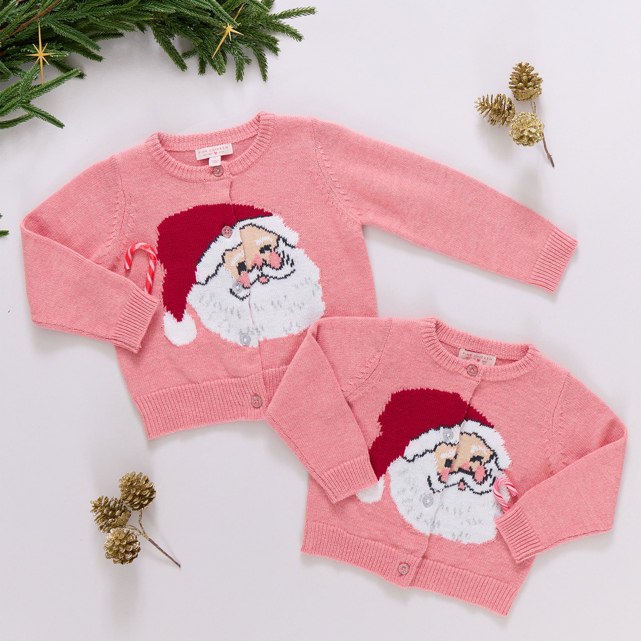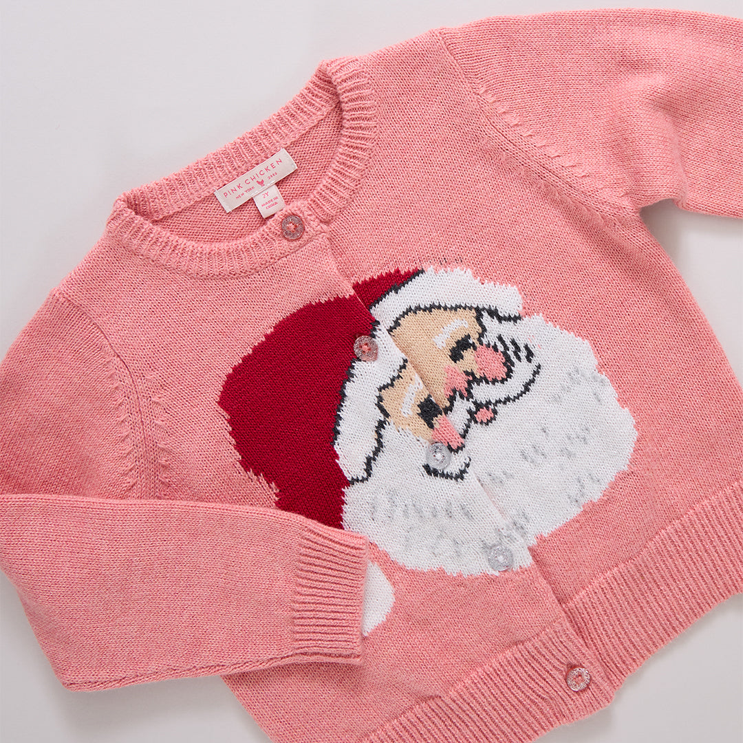 Hooray for the holidays! A joyful jolly Ole' St Nick takes centerstage on our favorite Girls Maude Sweater. This classic cardigan features a rosy cheeked, red stocking capped Santa with a full silvery threaded beard. A pink and silver glitter button front closure and ribbed waist and cuffs elevate this well-loved shape. Our jolly Santa is woven throughout our sweater collection making magical sibling moments easy to achieve.