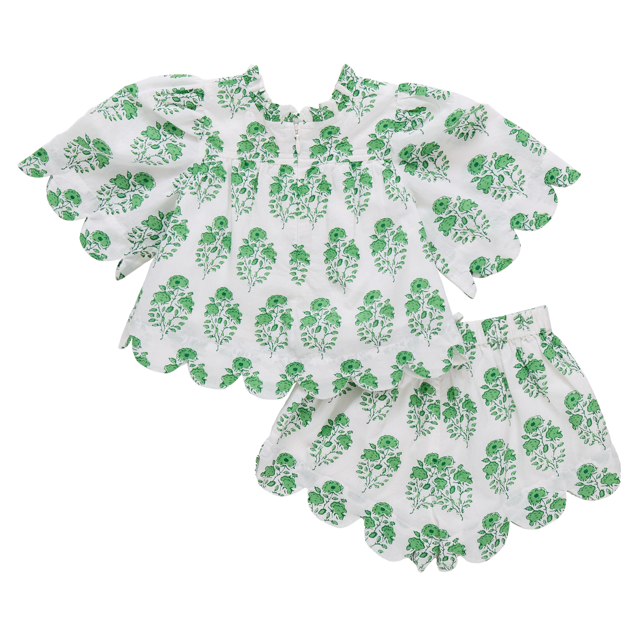 A scalloped escape! Breezy and new for the season, our Girls Misha Scallop 2-Piece Set in Green Strawflower adds a touch of whimsy to warm-weather days. Scalloped hems and sleeves meet a fixed drawstring waist, while delicate thread-wrapped details and an invisible zipper make this set both playful and polished. Match with mom in the Womens Misha Scallop Top + Short and baby in the Misha Set for a full family match.