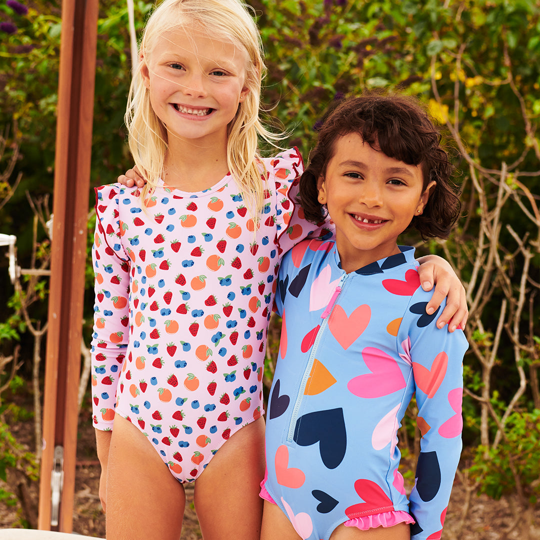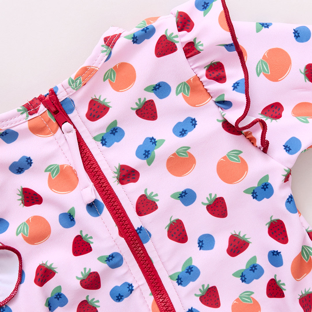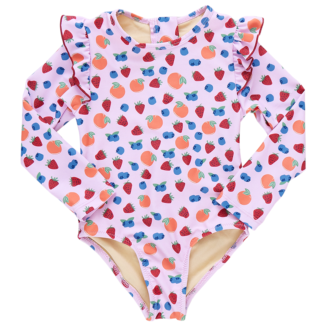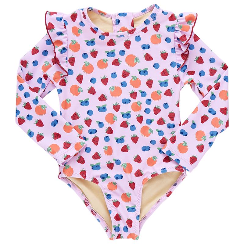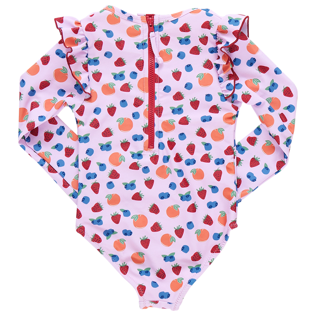 Nature's Candy! A sweet and juicy collection of blueberries, strawberries and clementines pop off a pale purple ground on our sun friendly Girls Rachel Suit. Designer highlights on this long sleeve one-piece include a ripe red strawberry tipped pattern on pattern flirty ruffled shoulder detail and a 3/4 zipper at the back with an easy to grab matching colored pull. Match back to our Baby Girls Rachel Suit and our Girls Katniss Bikini in Mixed Fruit for a sweet Big SIs / Little Sis moment.