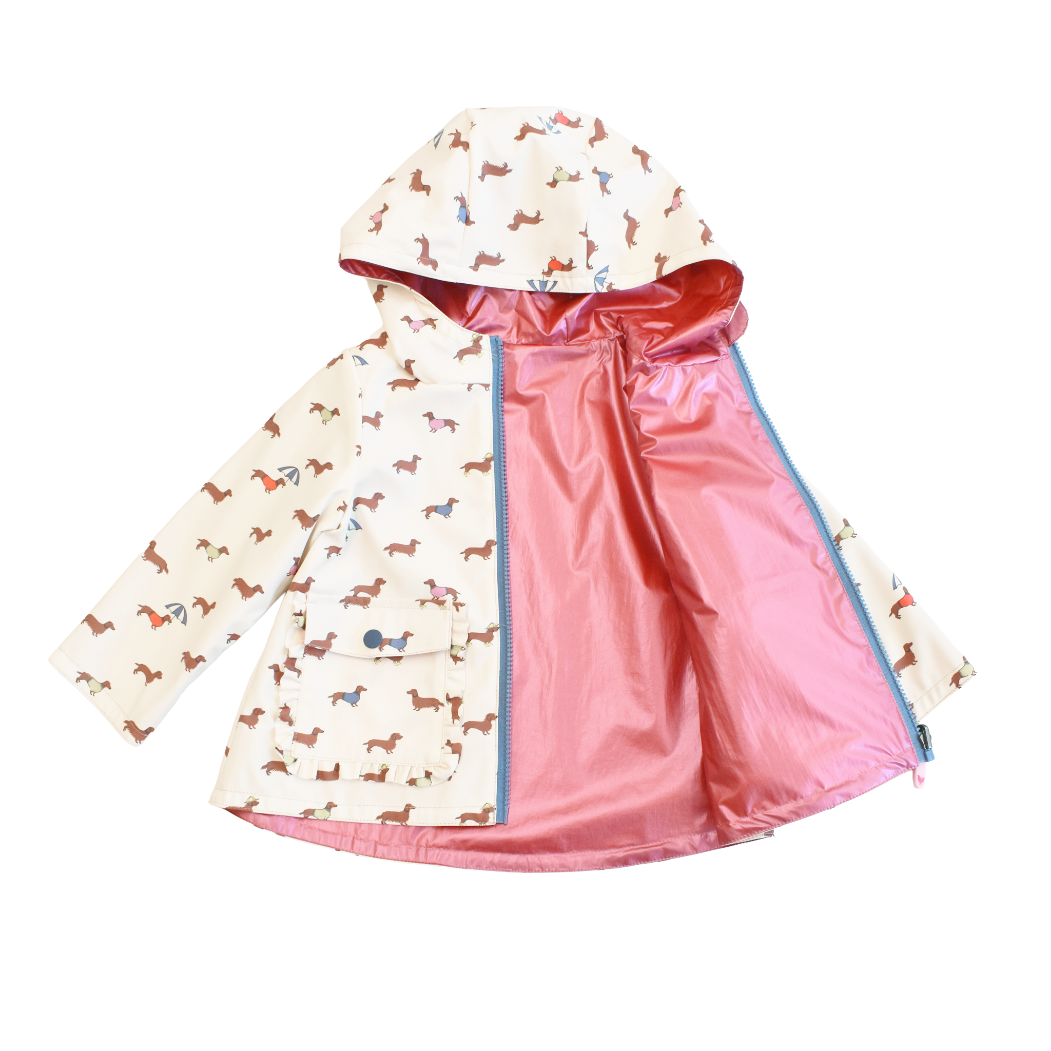 A cheerful rain-ready layer made for splashing through spring showers! Featuring our whimsical Rainy Day Dachshunds print on one side and a coordinating solid on the reverse, this reversible raincoat delivers double the fun and versatility. Designed with a cozy hood, functional pockets, and an easy fit for layering, it’s perfect for unpredictable spring weather.